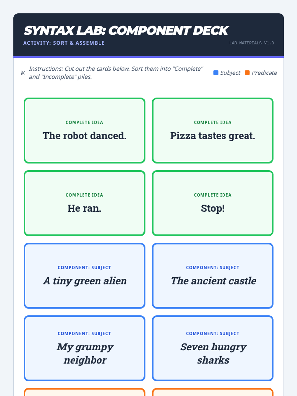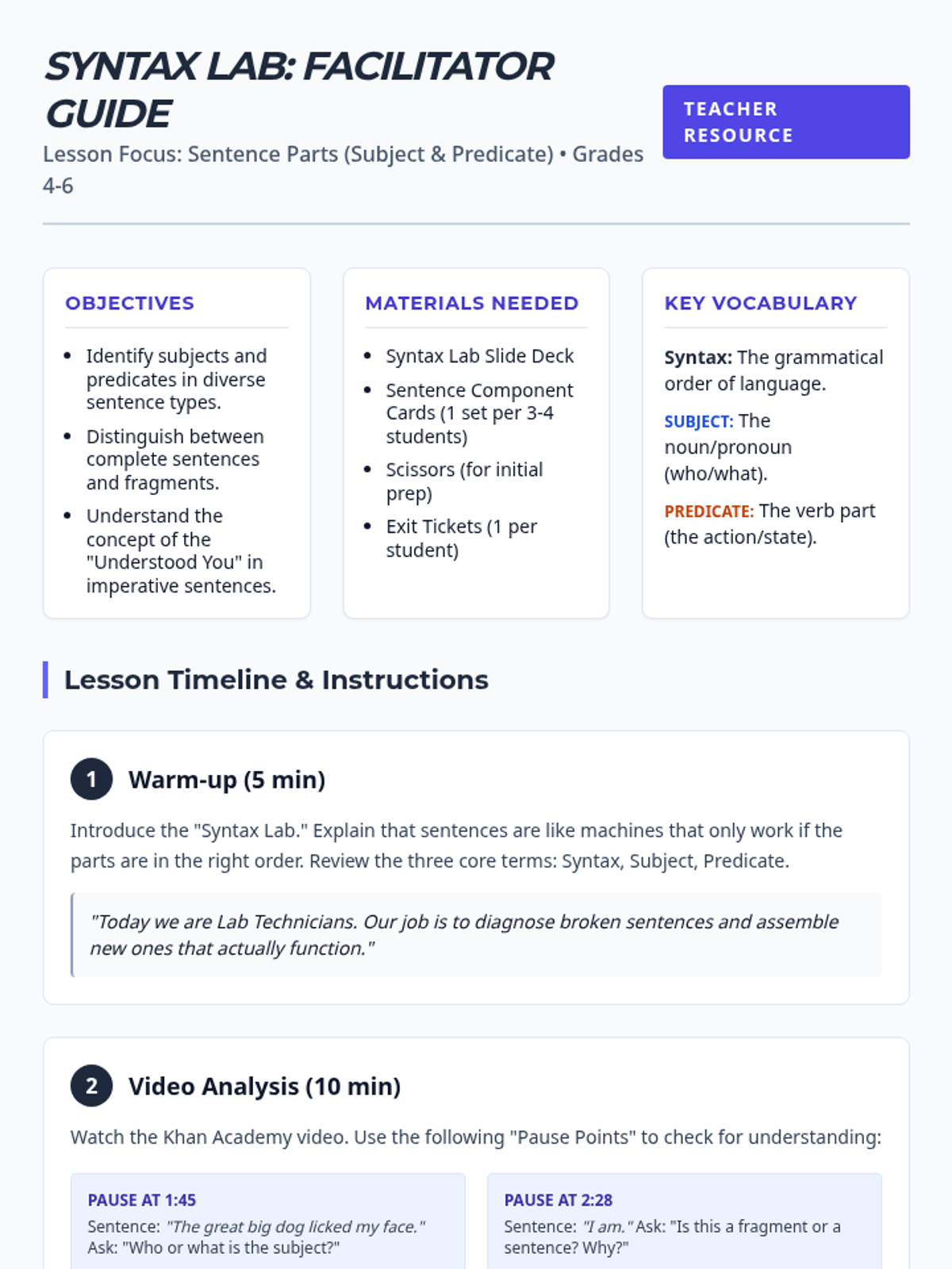 A remedial/review lesson for 4th-6th graders focused on identifying and constructing subjects and predicates. Students use a 'Syntax Lab' theme to analyze sentence structure, watch a Khan Academy refresher, and engage in a collaborative card-sorting activity.