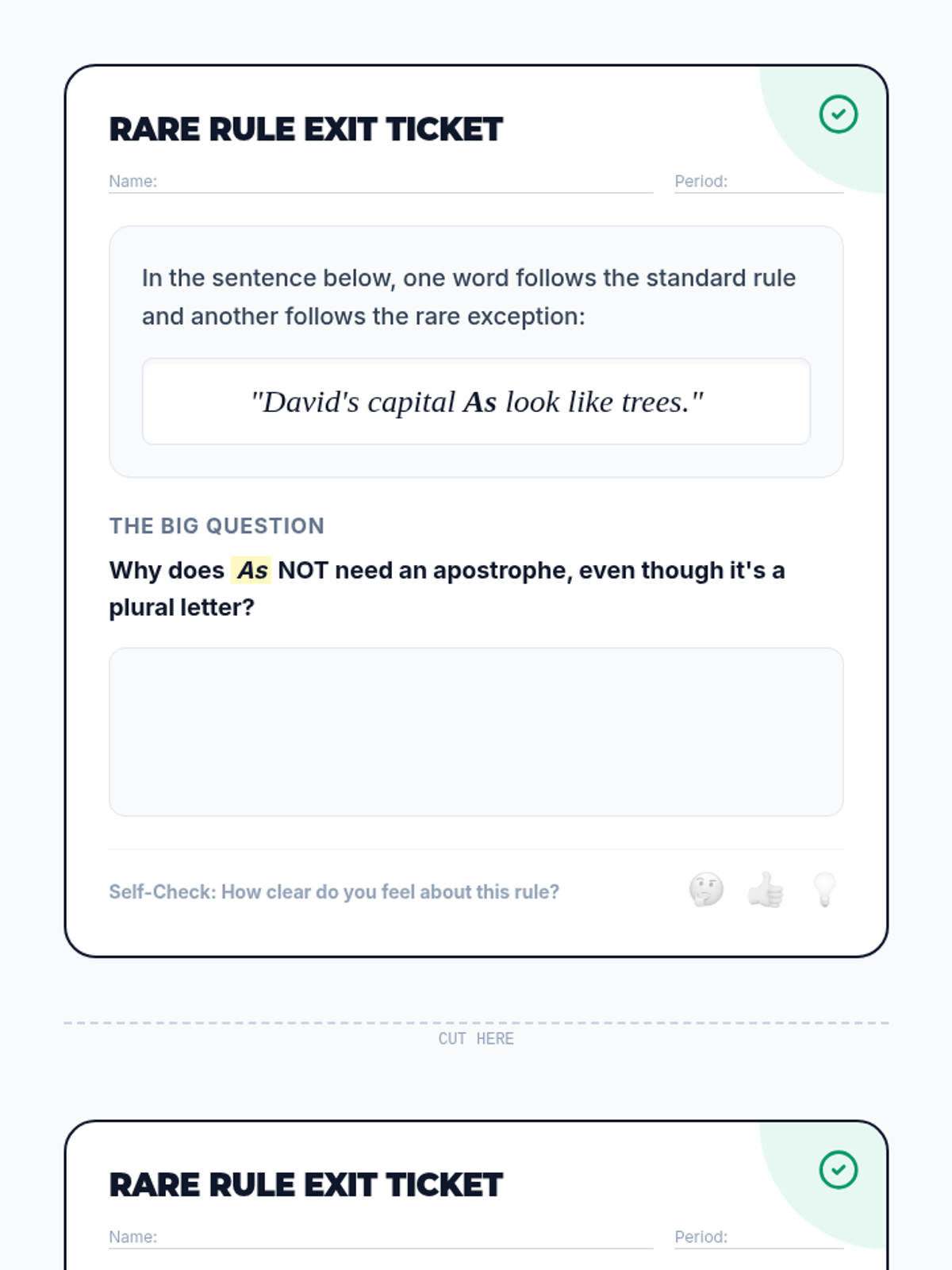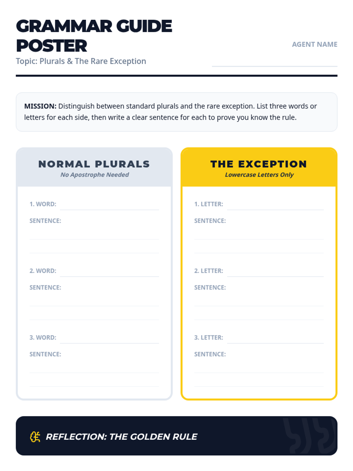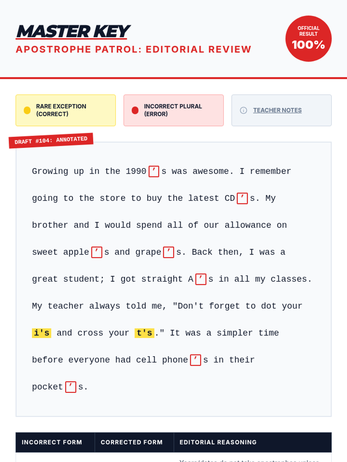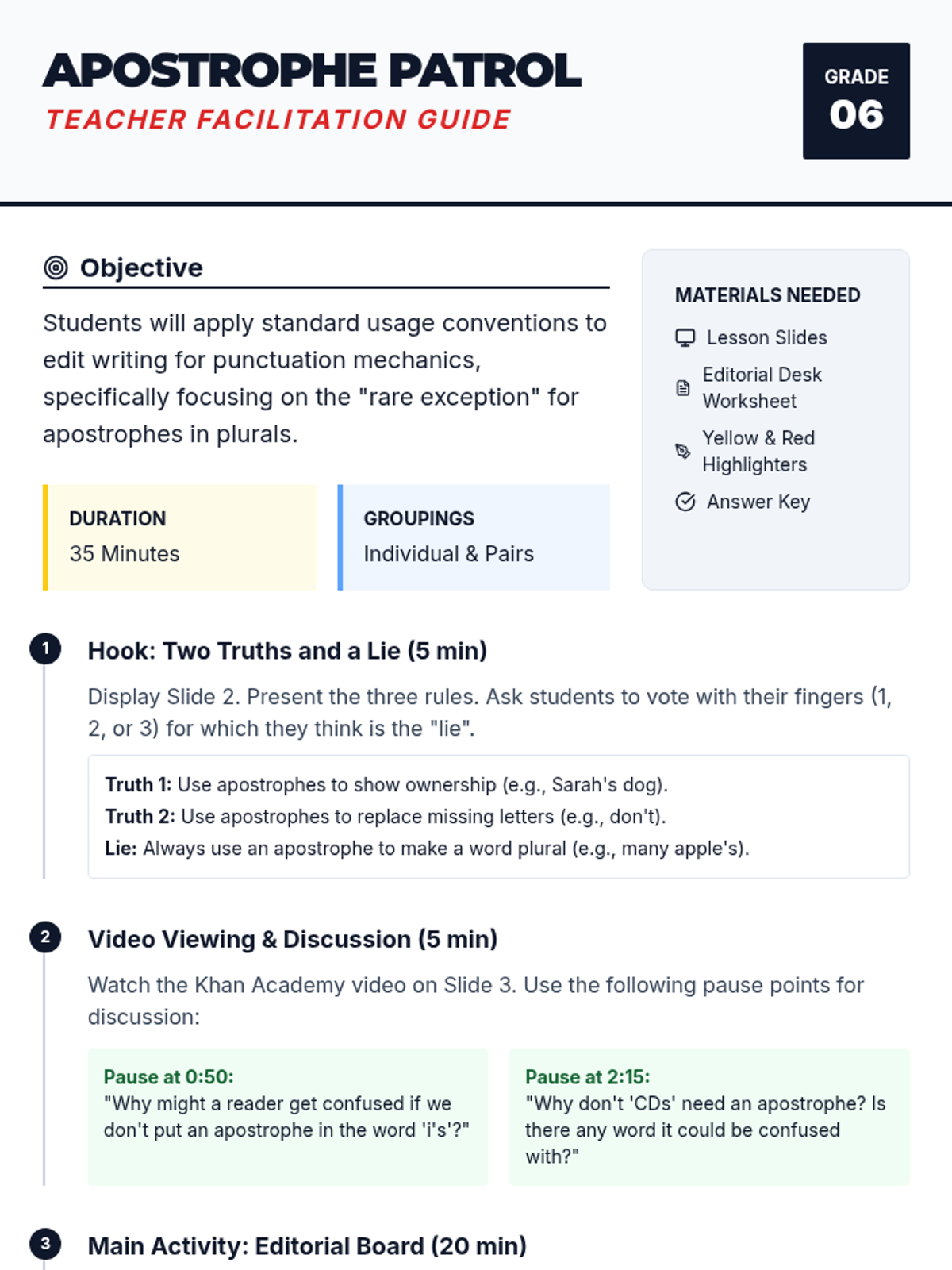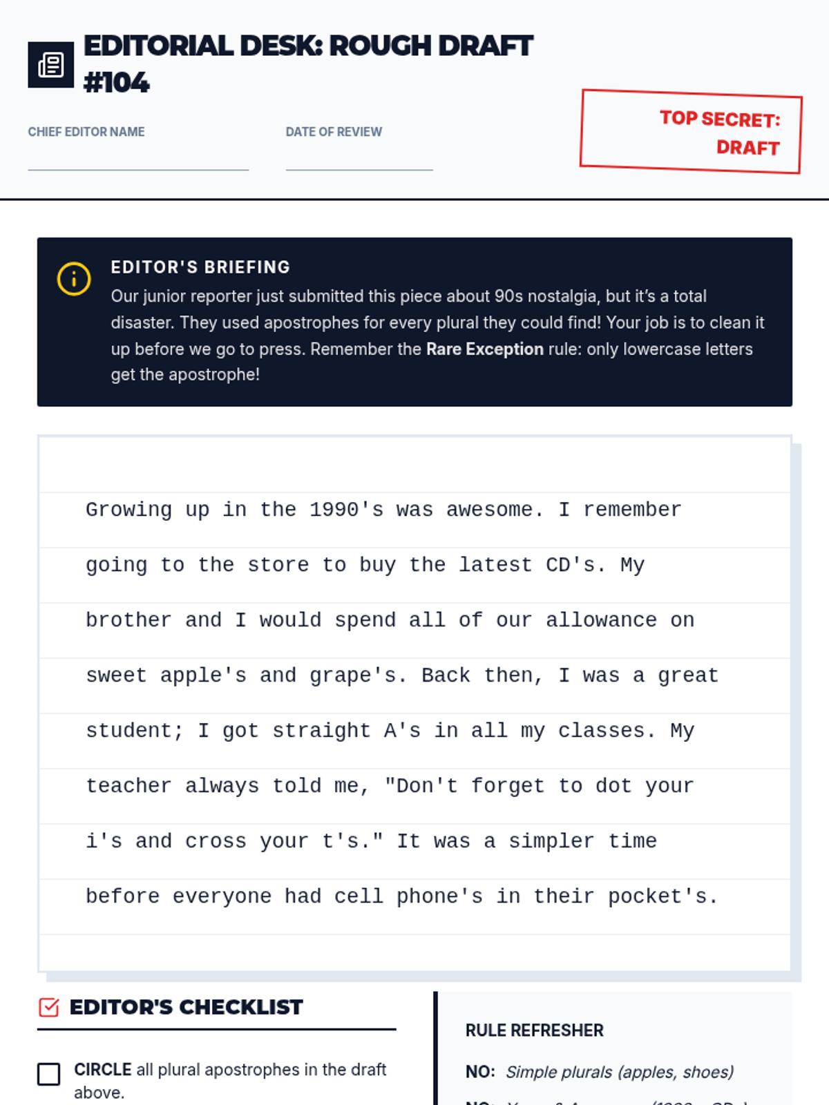 A 35-minute lesson focused on the rare exception for using apostrophes in plurals, specifically for lowercase letters, featuring a newsroom-themed 'Editorial Board' activity.
