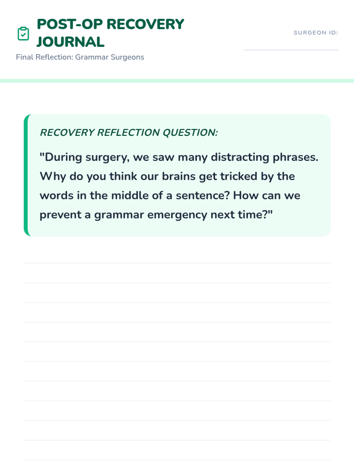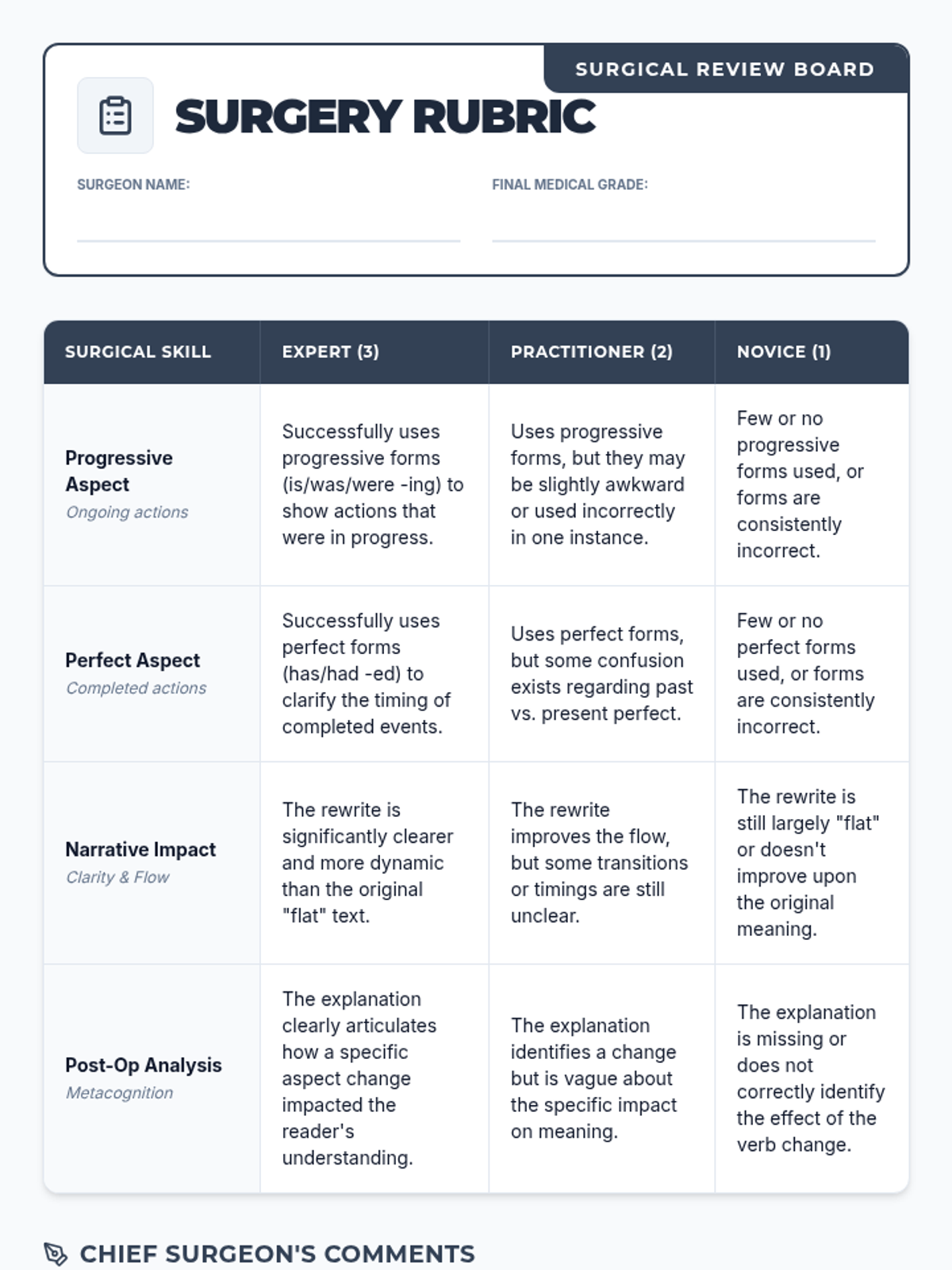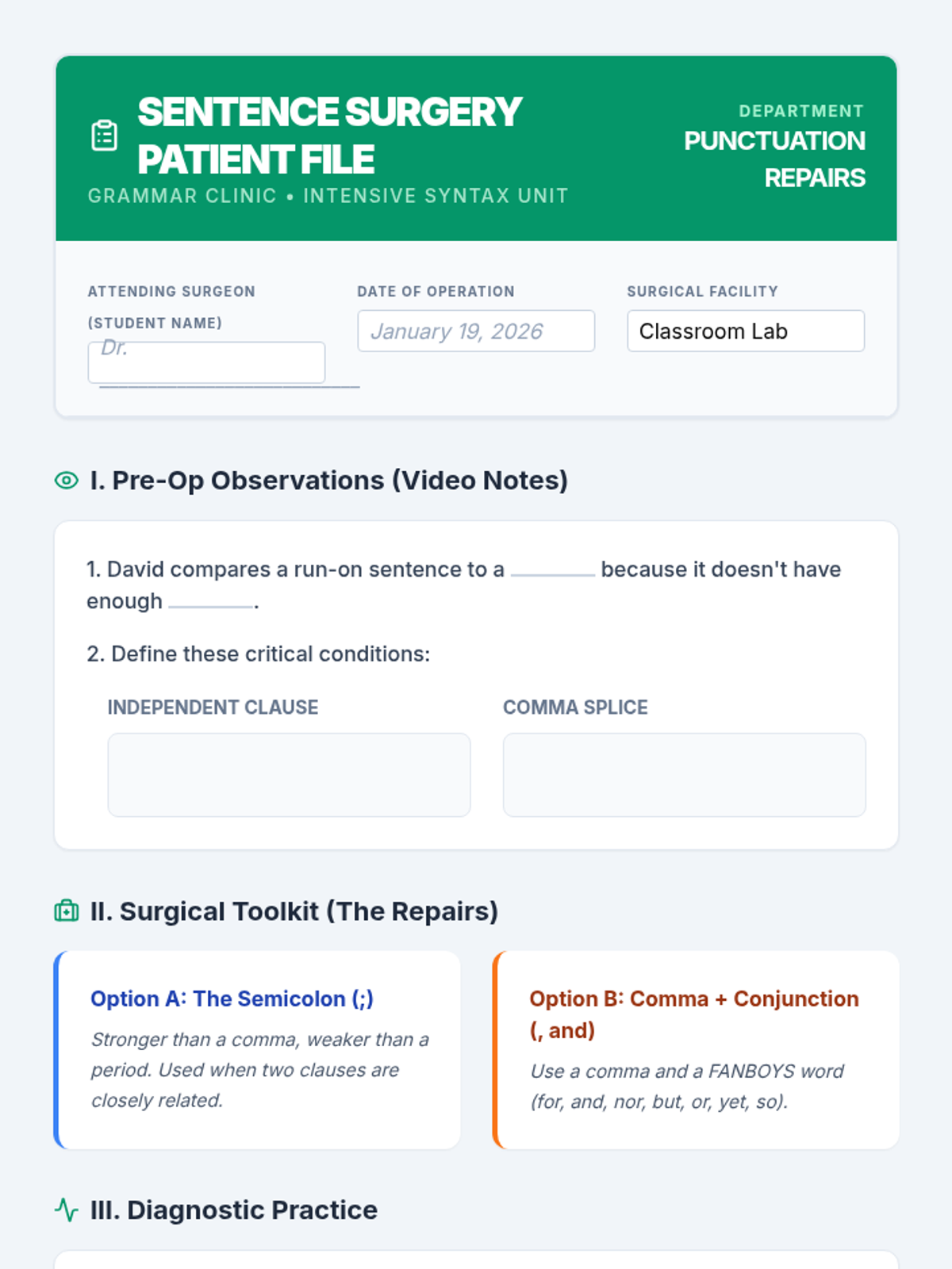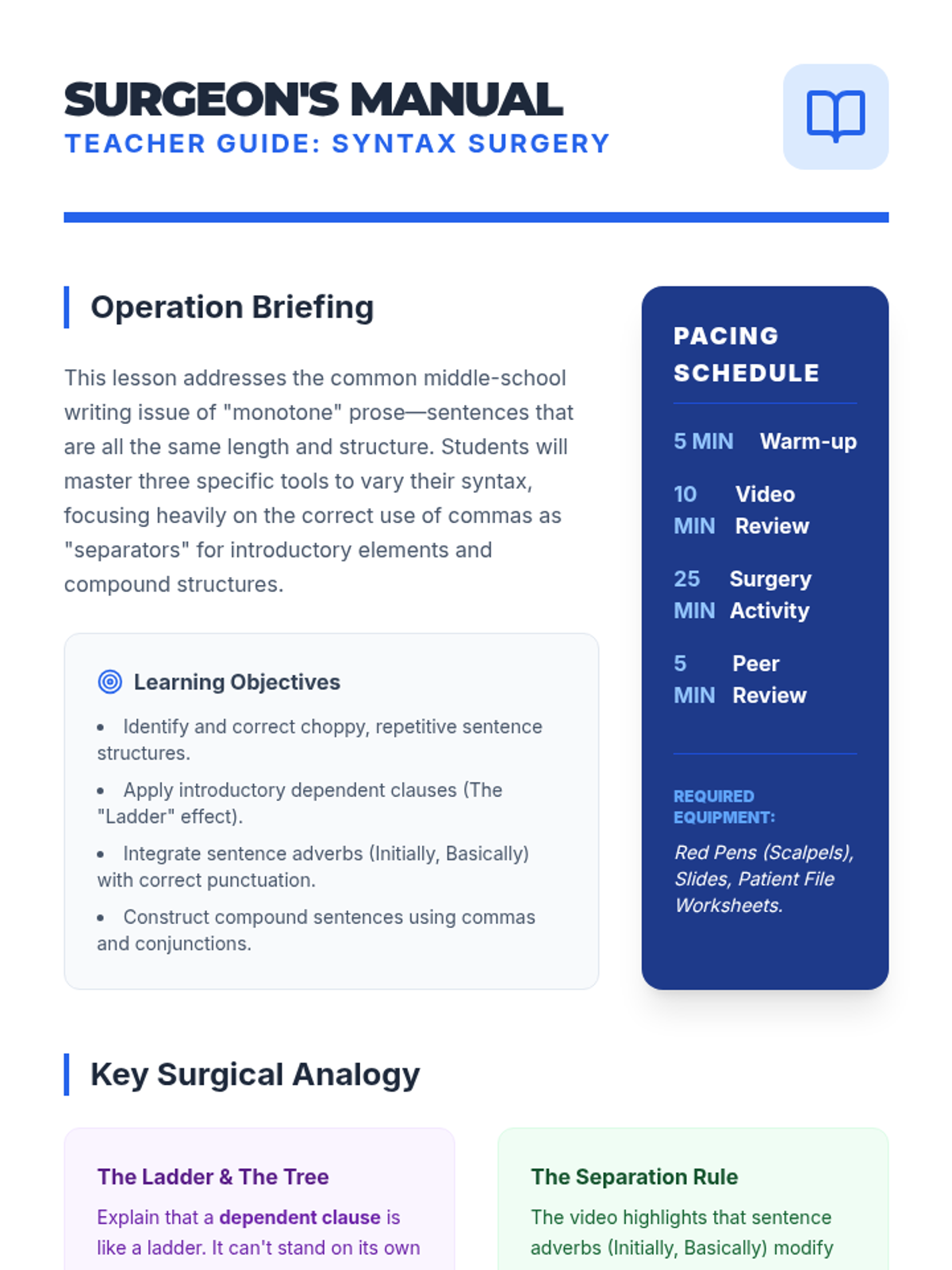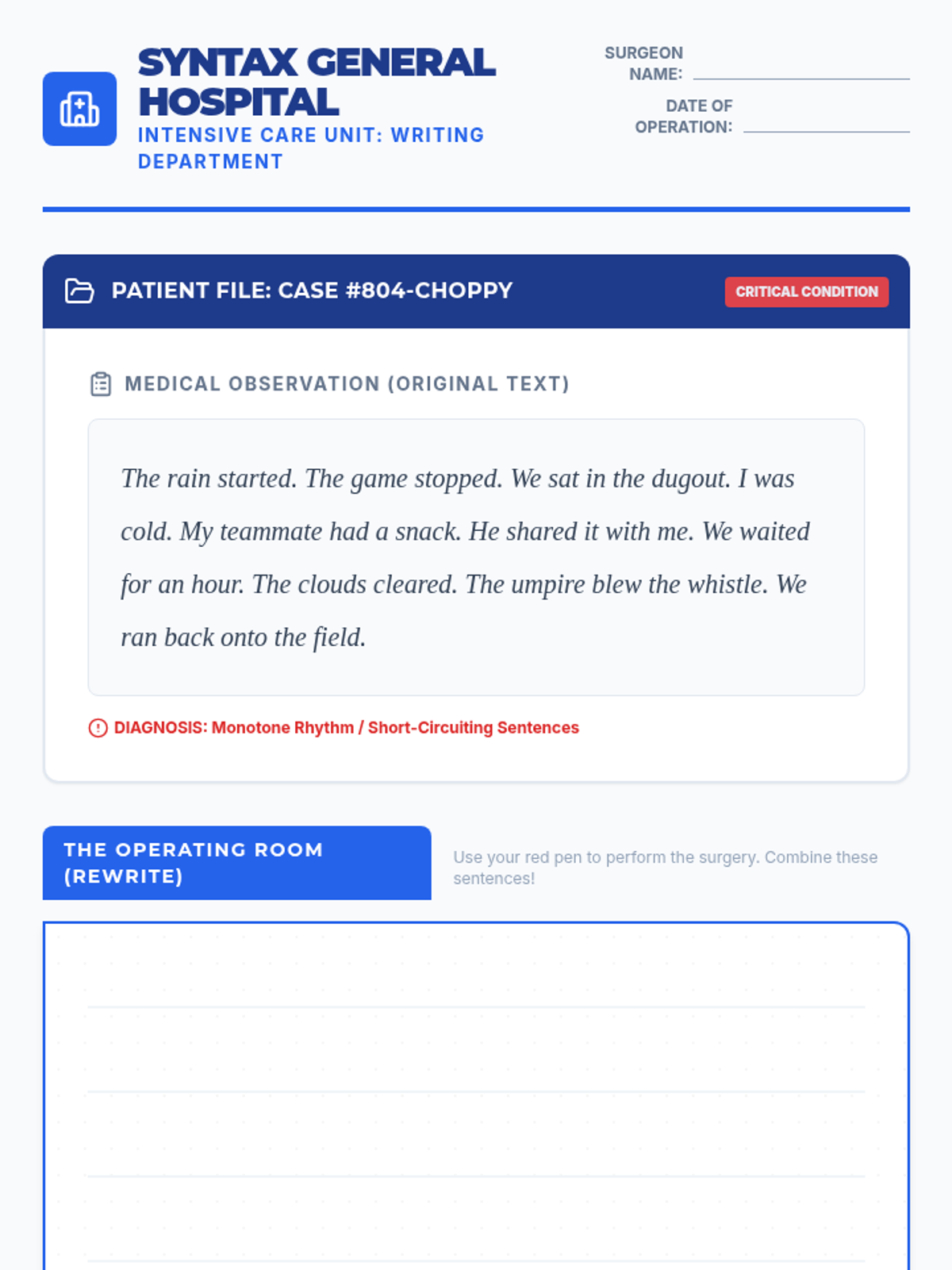 Students will learn to fix 'choppy' writing by mastering introductory elements, sentence adverbs, and compound sentences through a medical-themed 'Syntax Surgery' activity.
