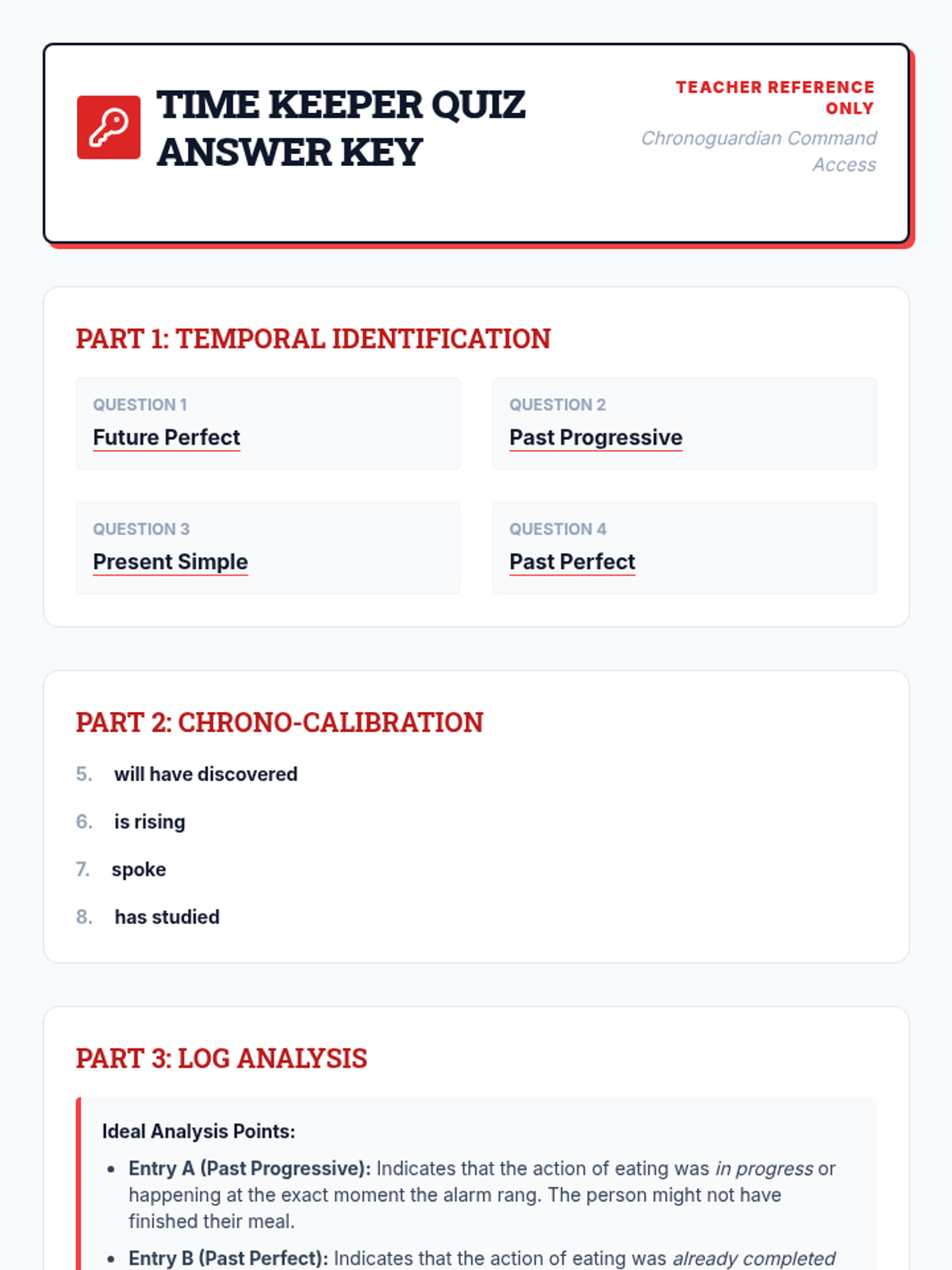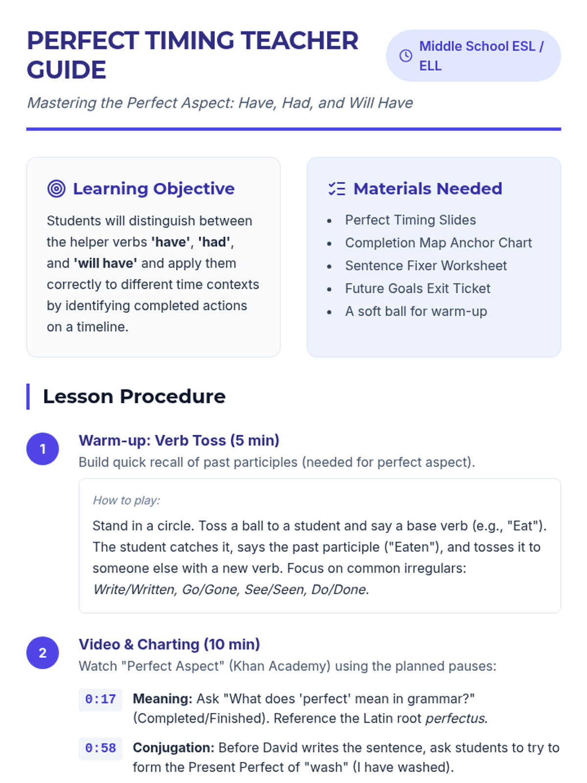 A comprehensive ESL/ELL lesson focused on the perfect aspect (have, had, will have). Students use a timeline-based 'Time Traveler' theme to understand when actions are completed across past, present, and future contexts.