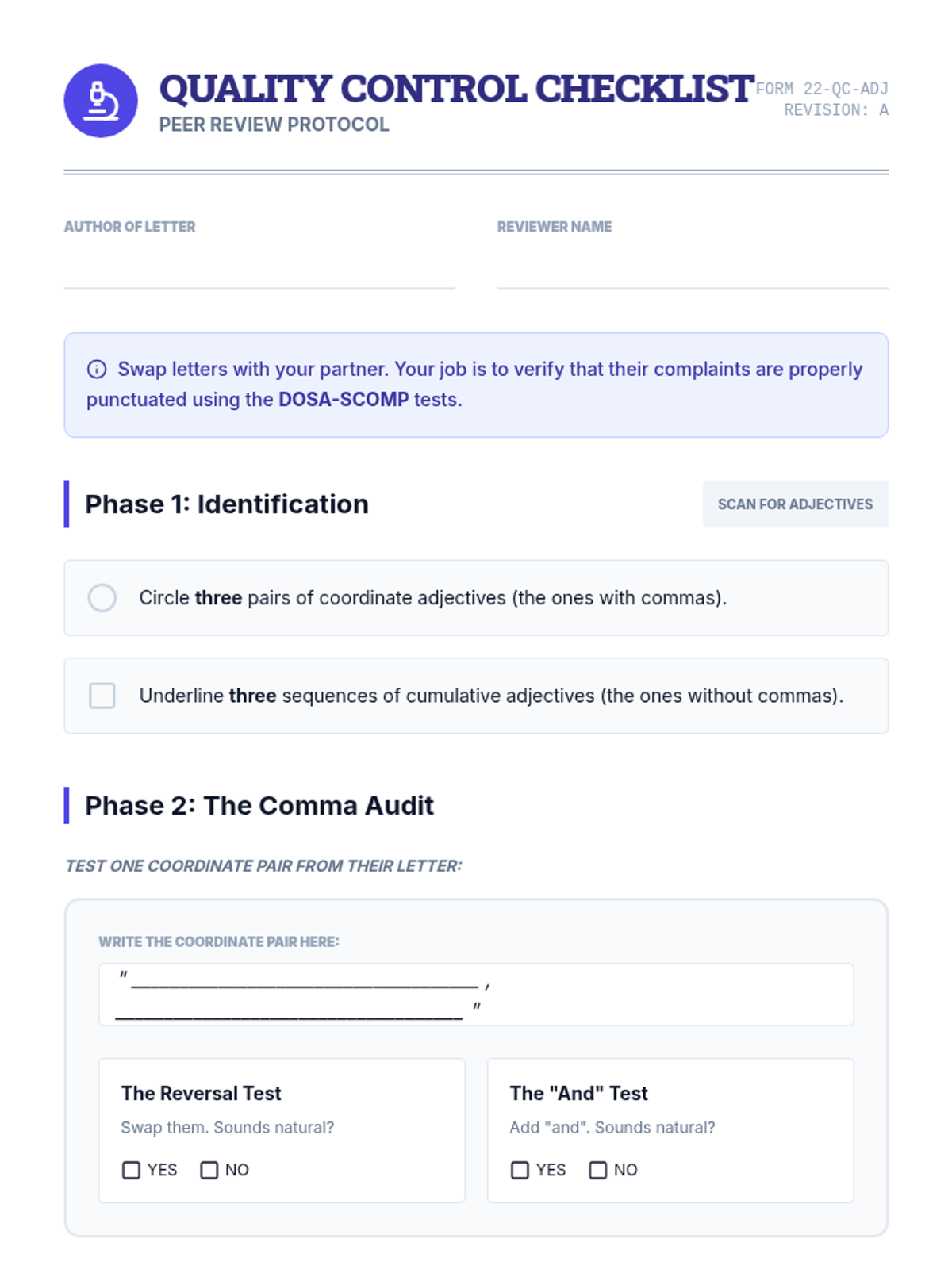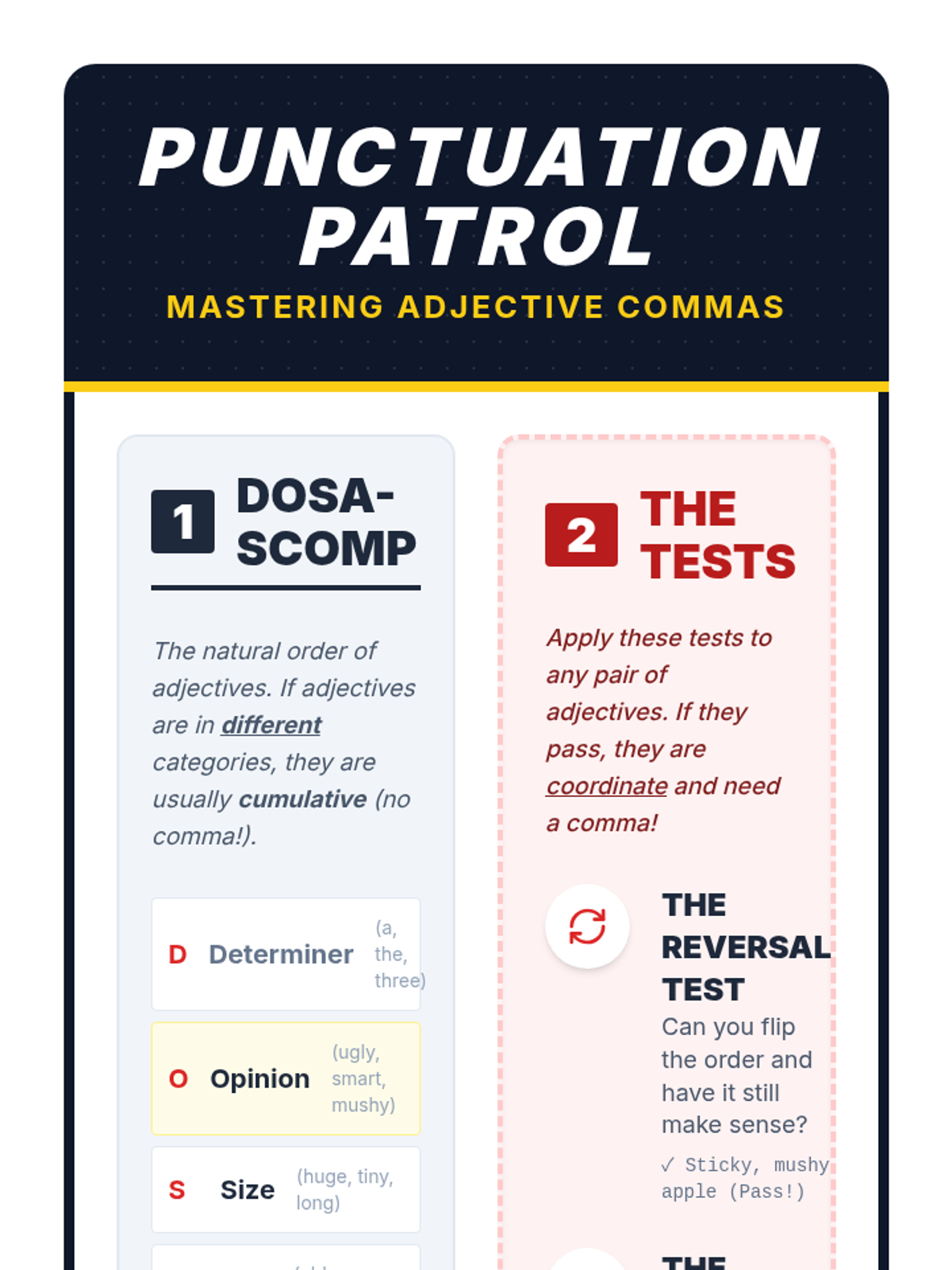 Students will learn to distinguish between coordinate and cumulative adjectives using the DOSA-SCOMP hierarchy and the 'Reversal' and 'And' tests to ensure correct comma usage.