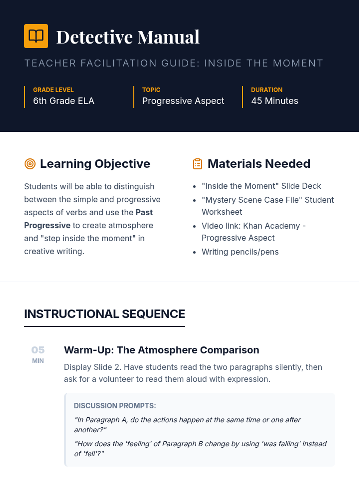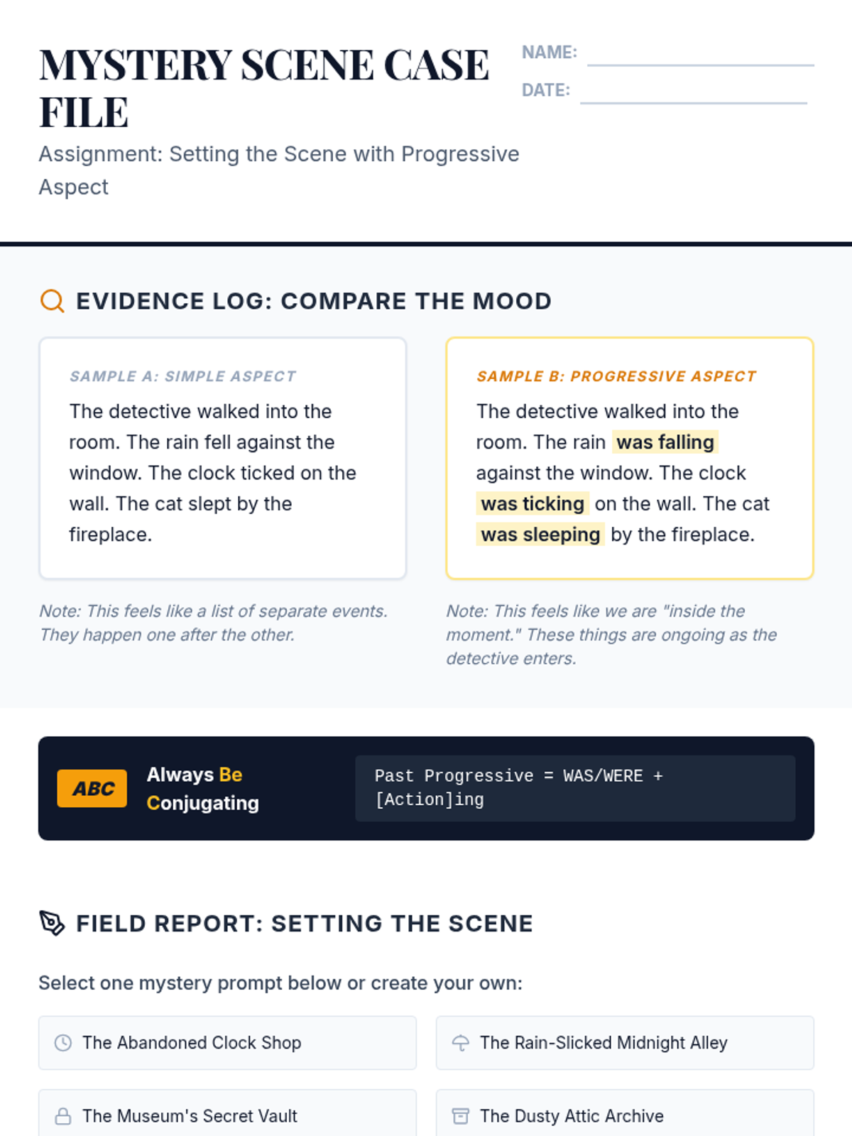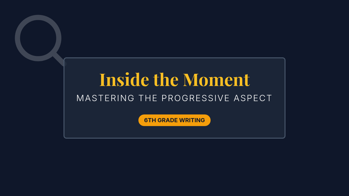 A grammar and creative writing lesson where 6th-grade students learn to use the progressive aspect to create atmosphere and 'step inside the moment' of a mystery story.