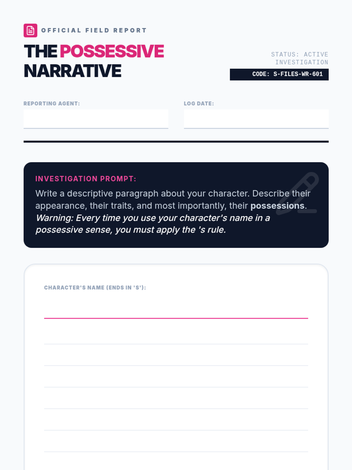 A 6th-grade grammar lesson on applying the possessive rule to singular nouns and proper names ending in 's', featuring a video-based discussion and a creative character sketching activity.
