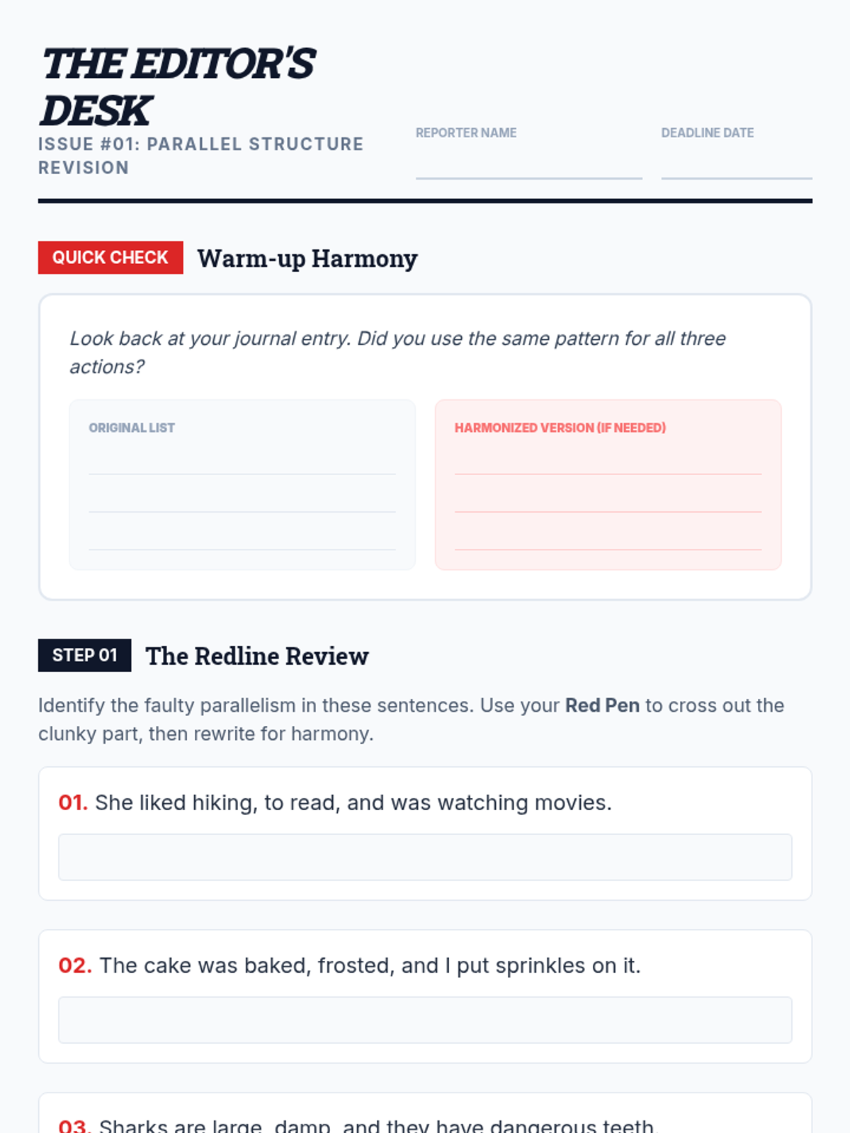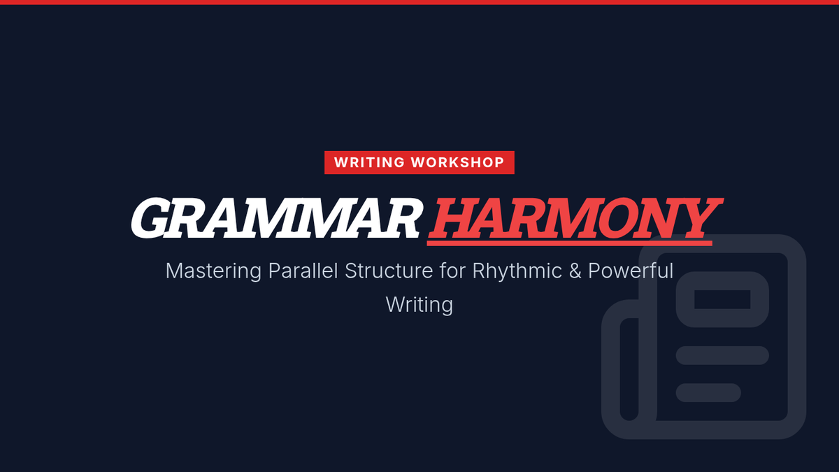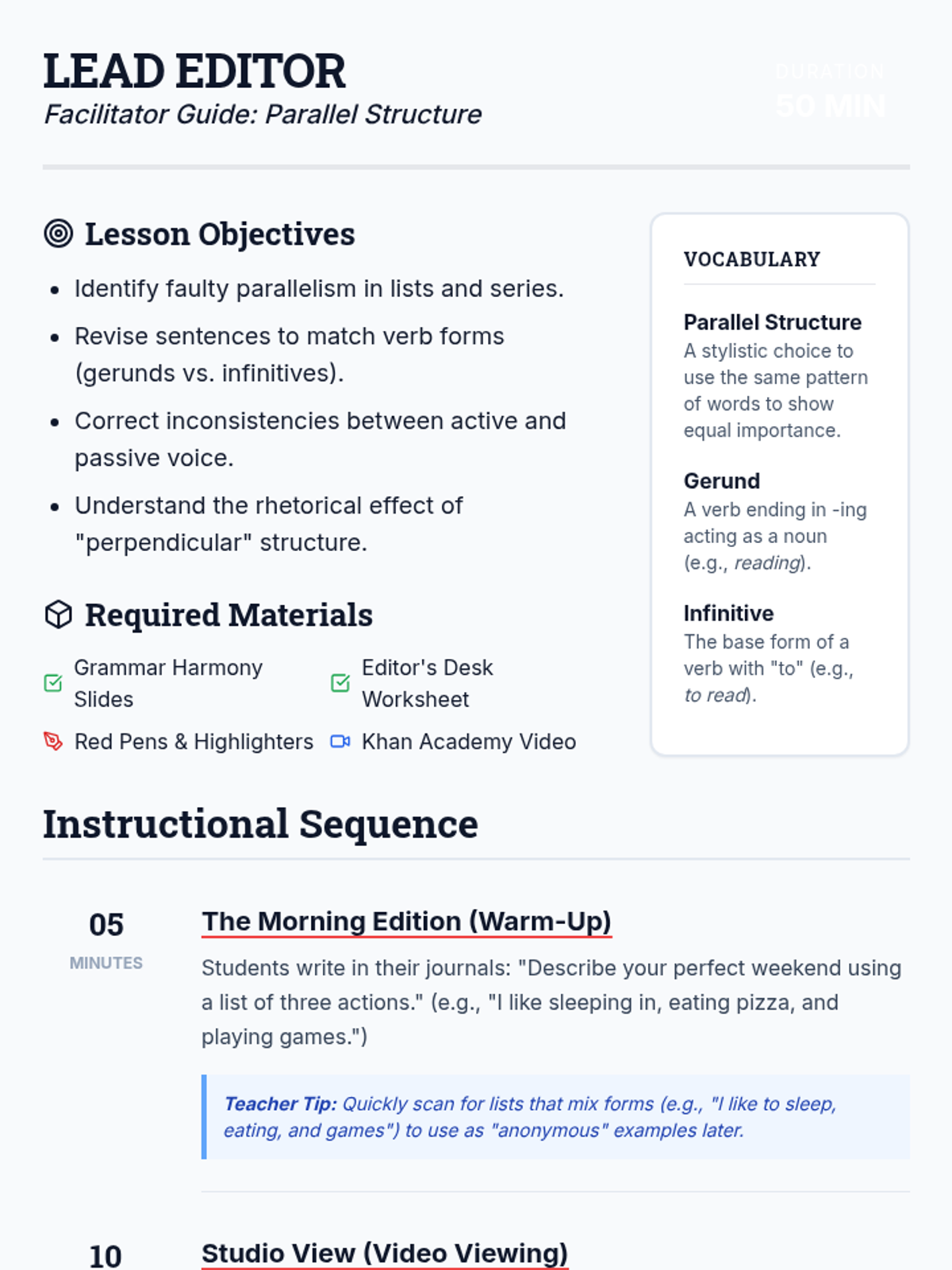 This lesson focuses on identifying and correcting faulty parallelism in writing, specifically targeting inconsistencies in verb forms (gerunds vs. infinitives) and voice (active vs. passive). Students act as editors to harmonize a clunky paragraph and explore how parallel structure creates rhythm and clarity.