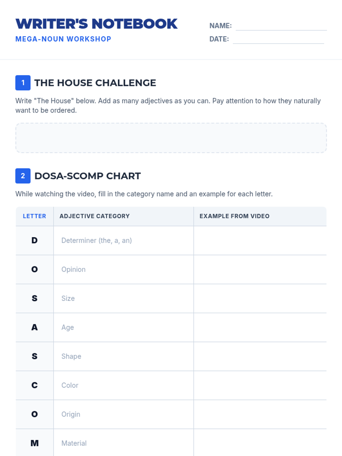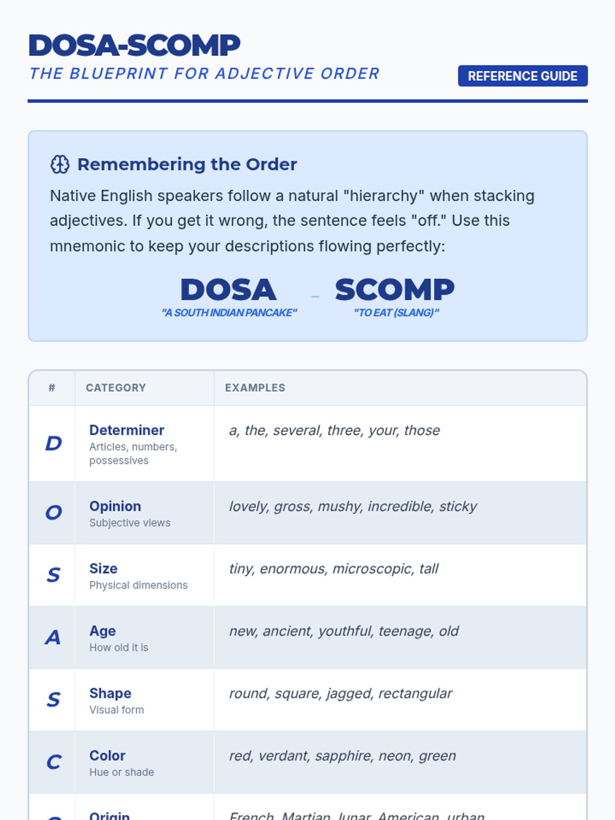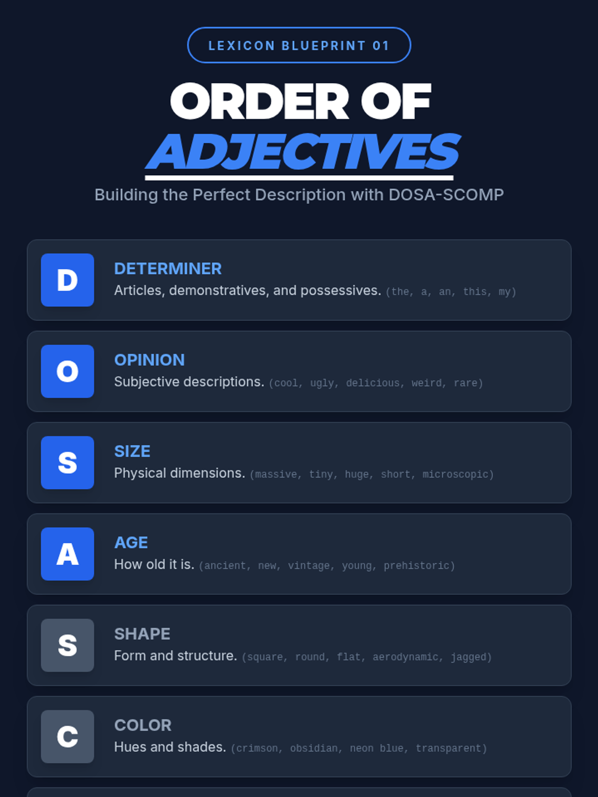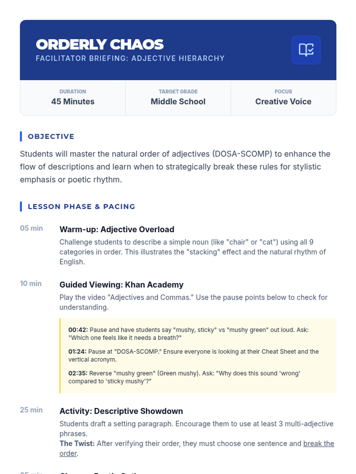 Students will master the natural order of adjectives using the DOSA-SCOMP mnemonic to improve the flow and rhythm of their creative writing, while exploring how to purposefully break these rules for stylistic effect.