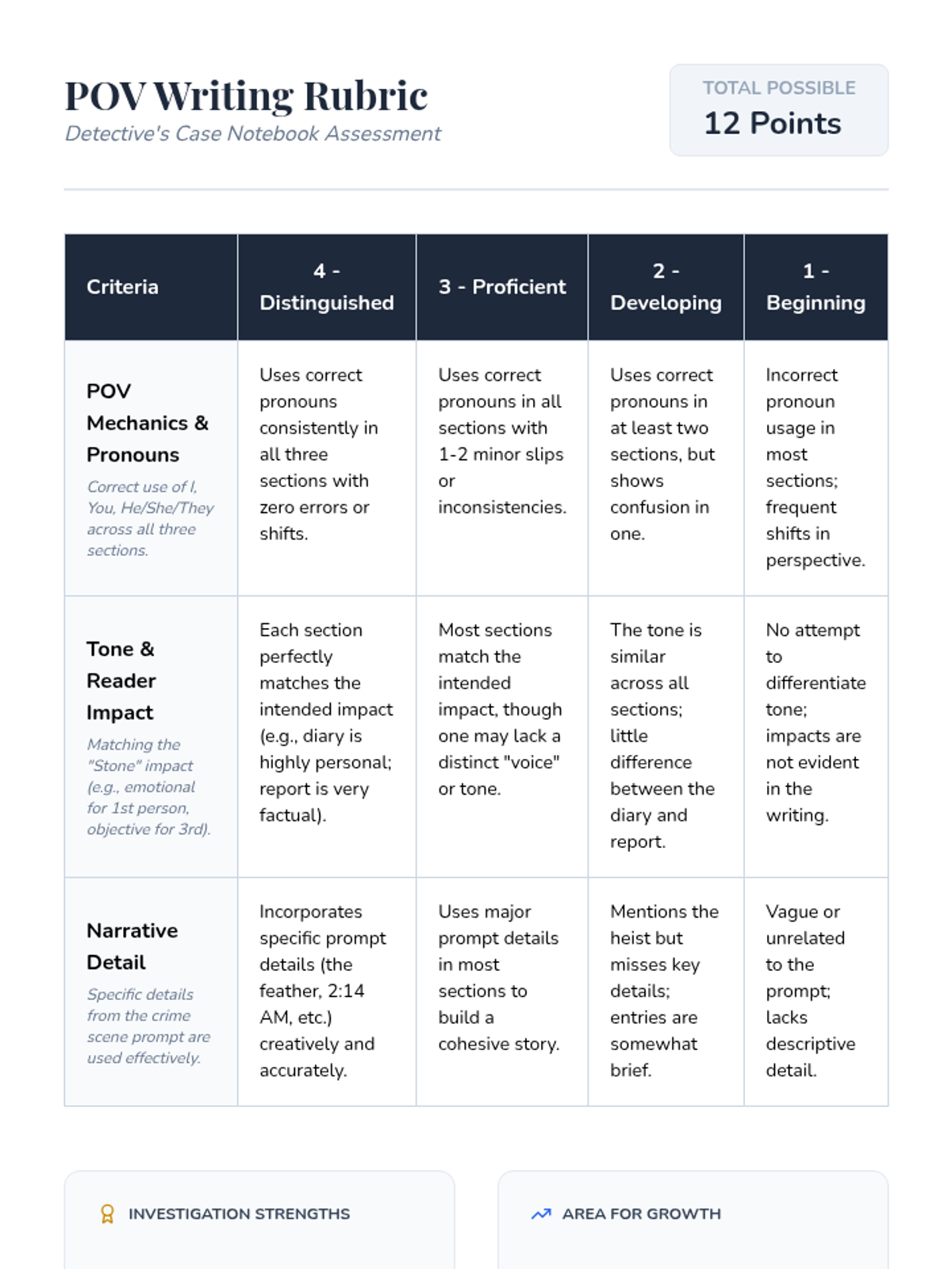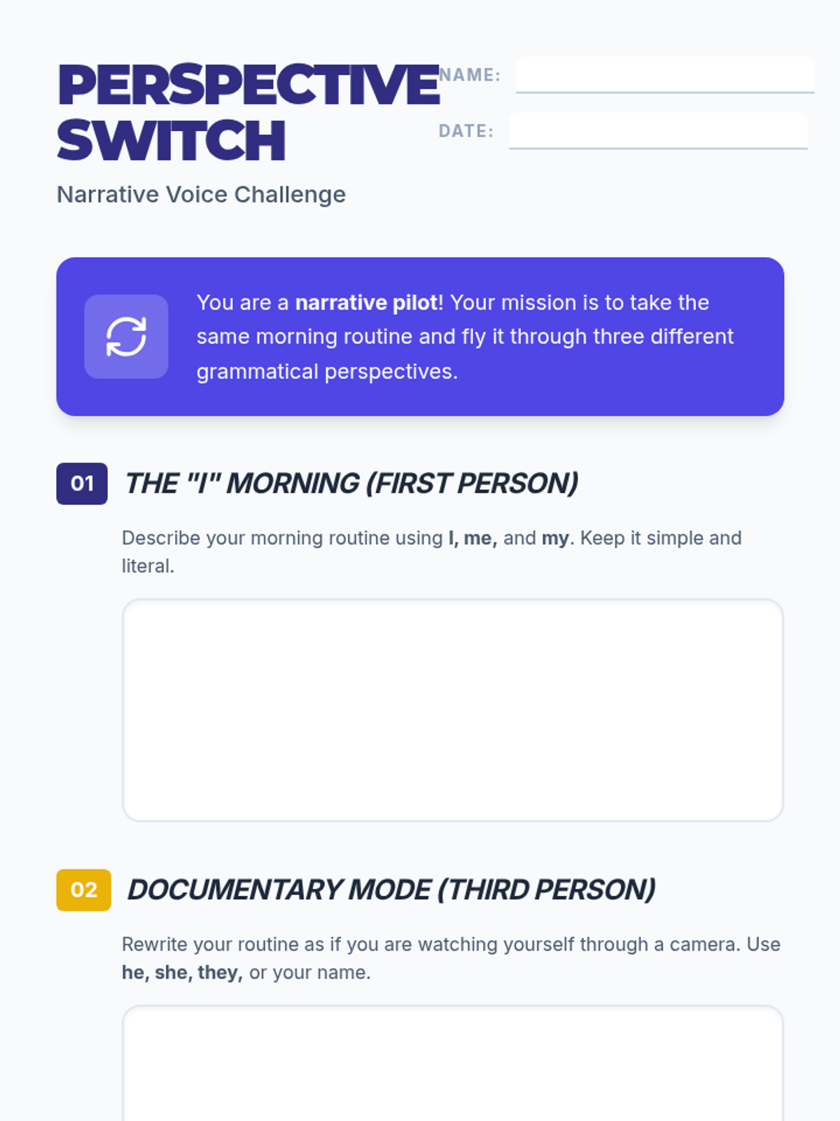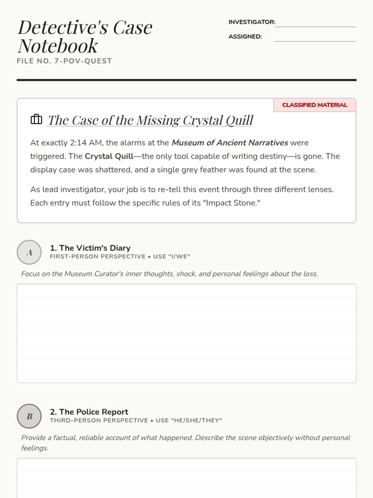 A creative writing application where students rewrite a passage from a new perspective. Includes scaffolds for tone and sentence structure, concluding with a formal rubric for assessment.
