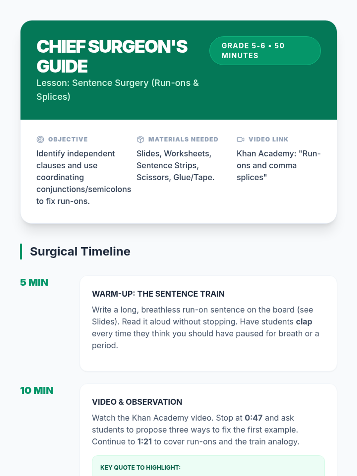 Students learn to identify independent clauses and repair run-on sentences and comma splices using 'Sentence Surgery.' The lesson features a Khan Academy video and a hands-on activity where students physically 'operate' on broken sentences.