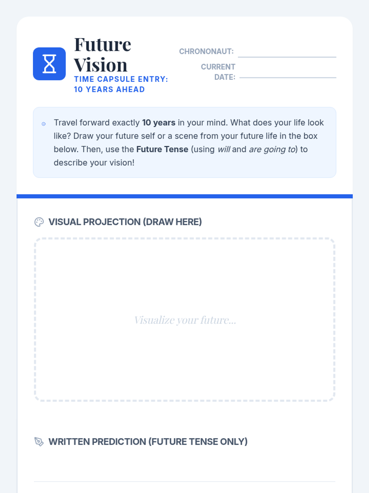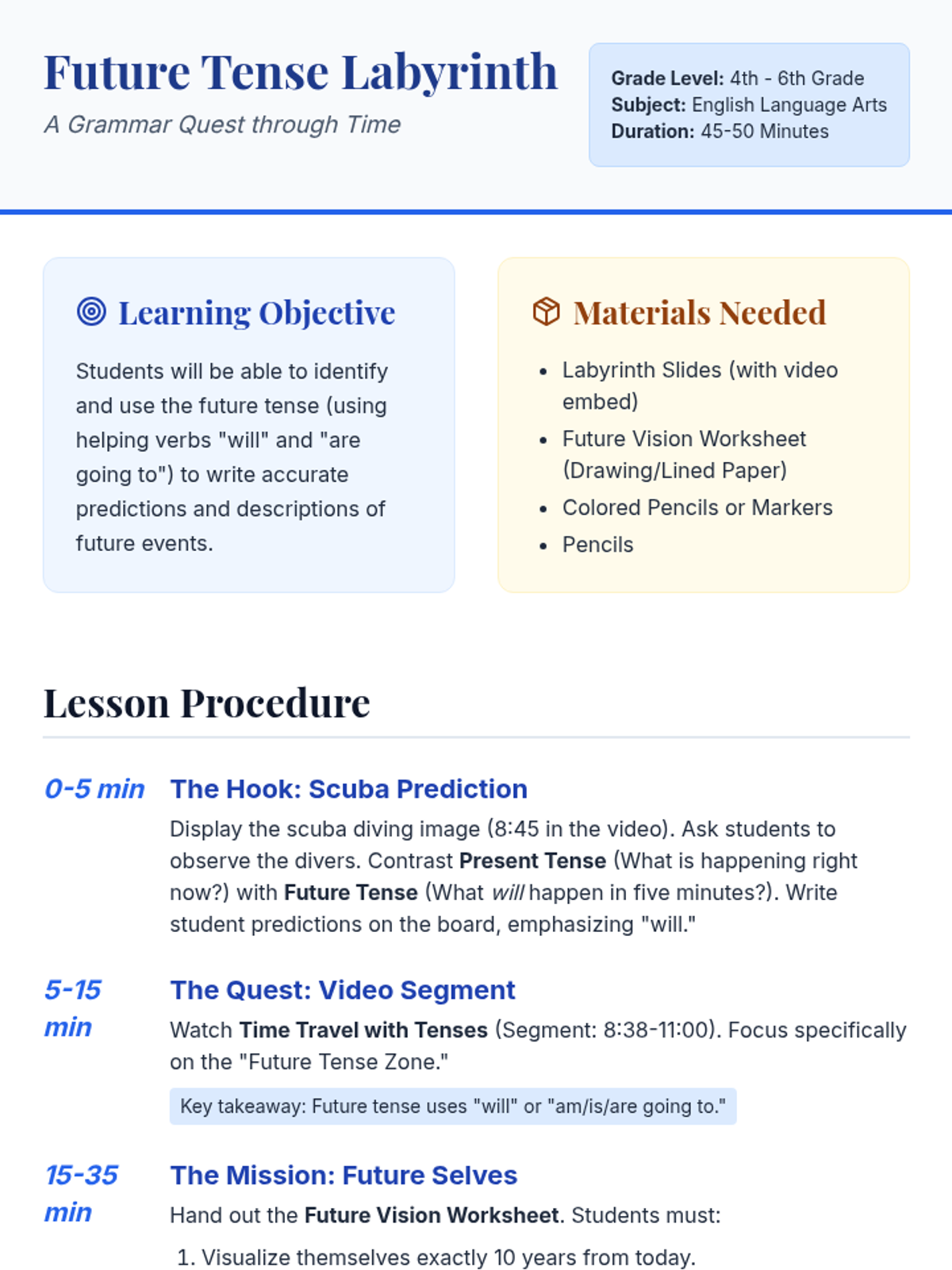 Students explore the future tense through the lens of a clockwork labyrinth, watching a targeted video segment and creating a 'Future Vision' time capsule entry describing their lives 10 years from now.