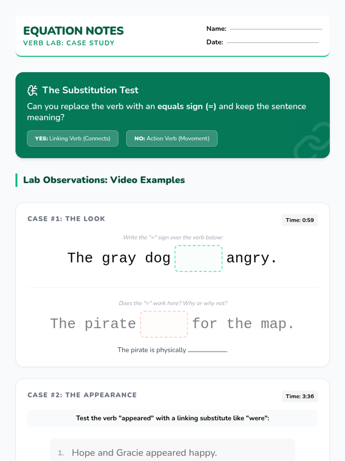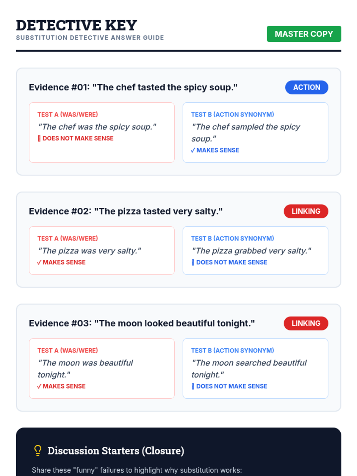 Students will learn to distinguish between action and linking verbs using the "Substitution Strategy." This lesson uses a detective-themed approach to investigate "tricky" verbs like taste, smell, and look.