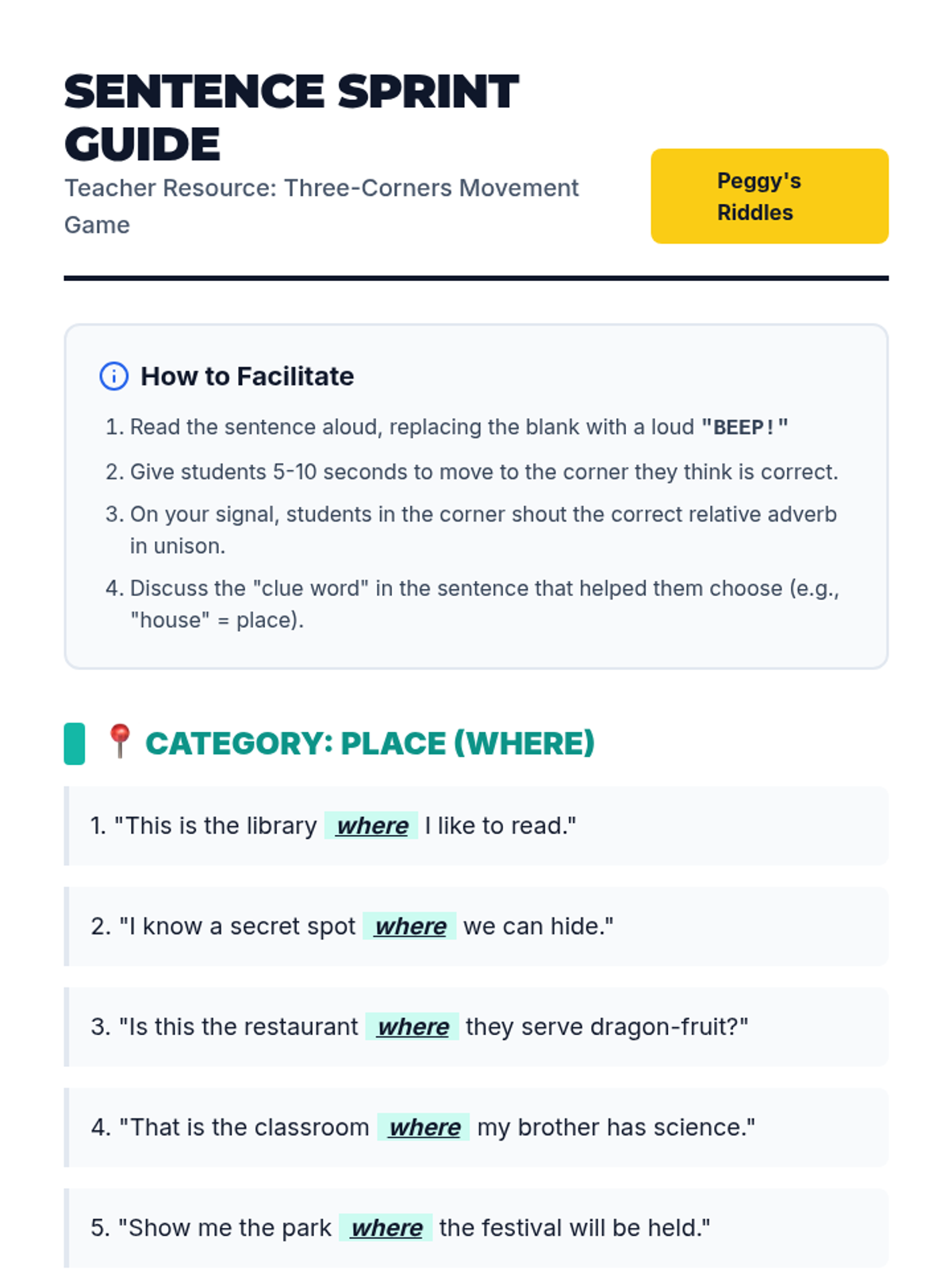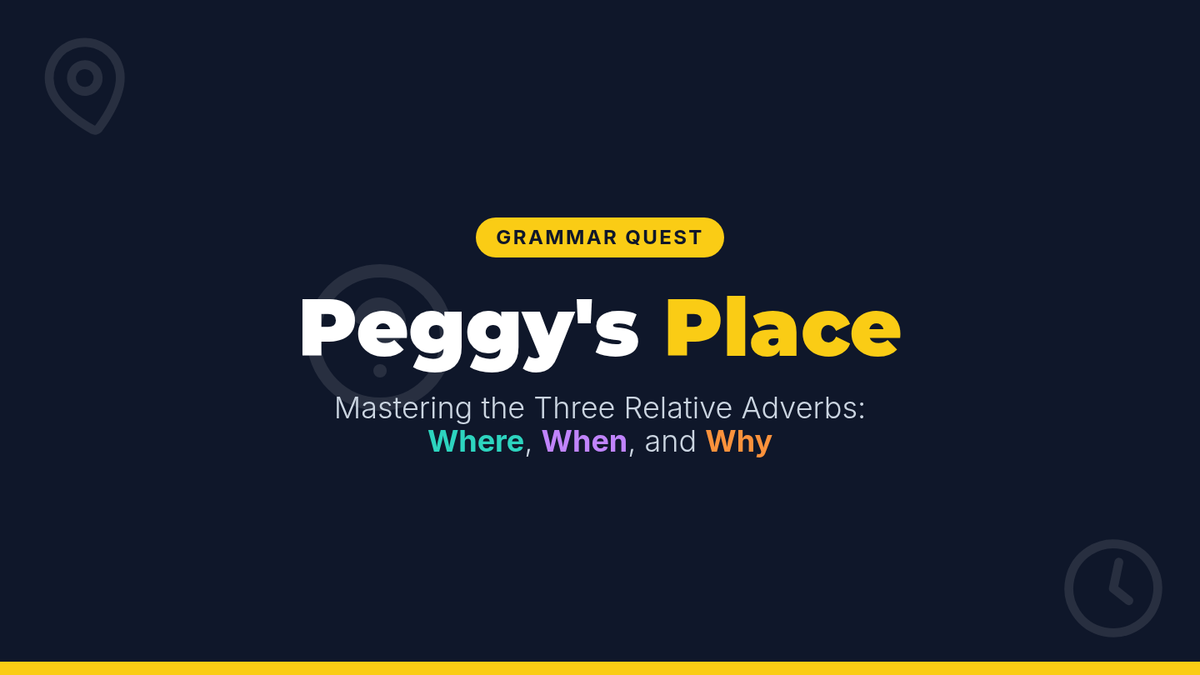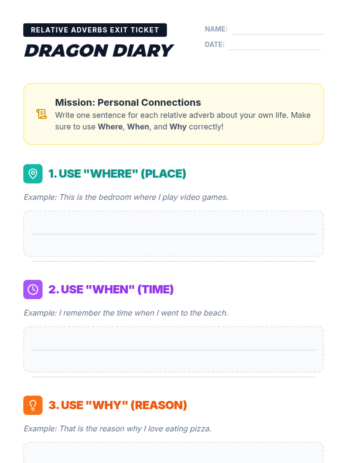 A fun, high-energy review of relative adverbs (where, when, why) featuring a 3-corners movement game and an 'interview with a dragon' theme. Students practice identifying whether a sentence requires a place, time, or reason connector.