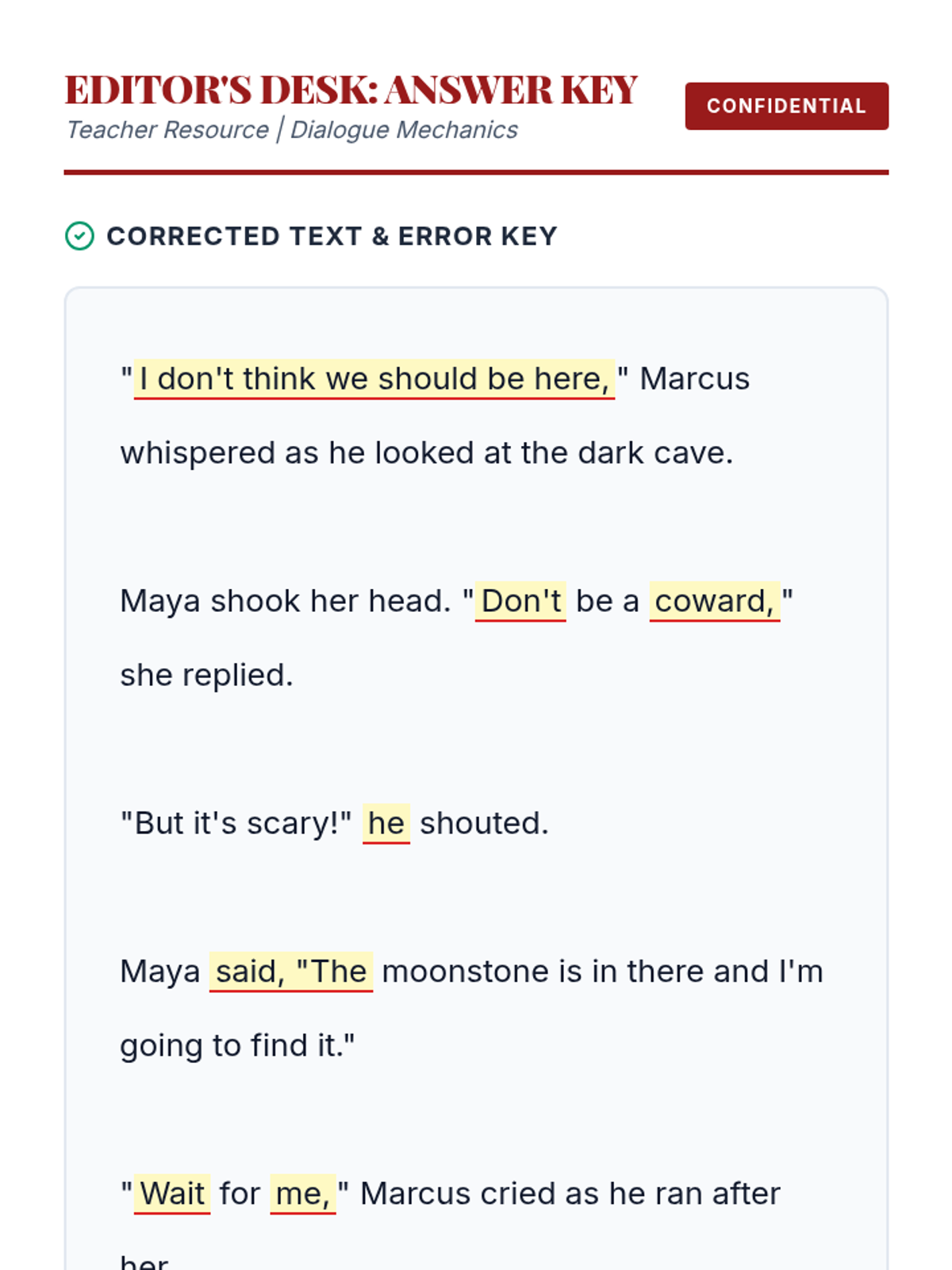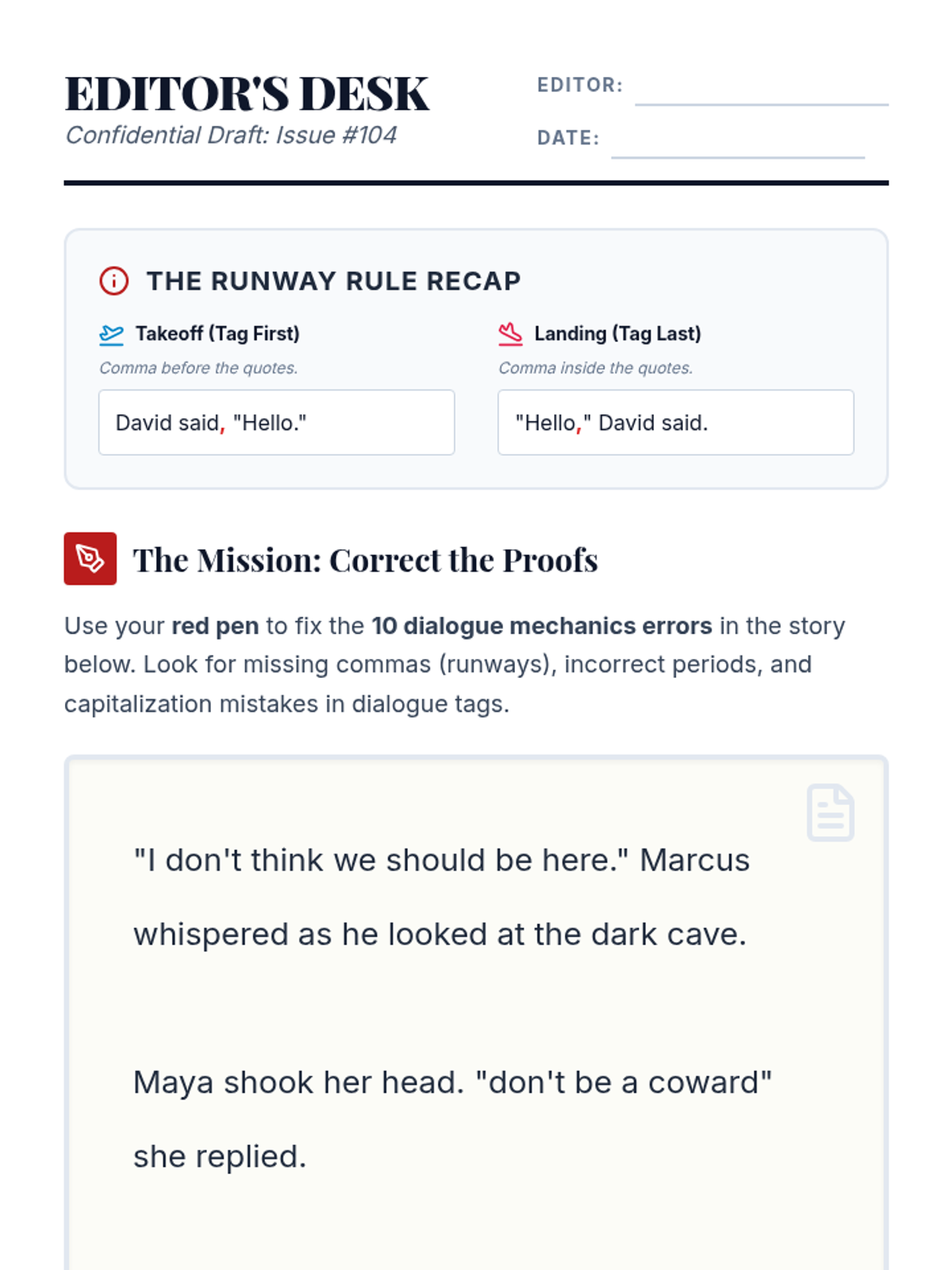 A remediation lesson for middle schoolers focusing on the mechanics of dialogue, specifically the 'runway' metaphor for commas and identifying common punctuation errors in reported speech.
