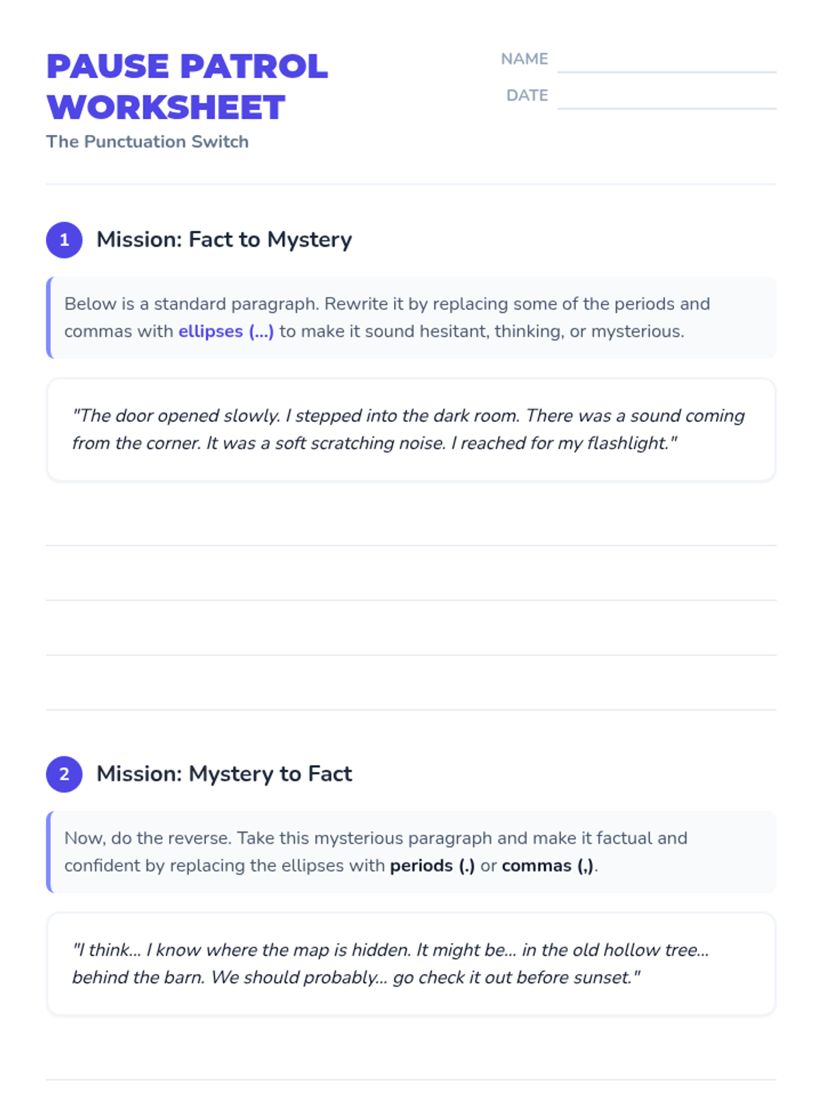 Focuses on the stylistic use of ellipses in narrative writing to create suspense, hesitation, and specific pacing.