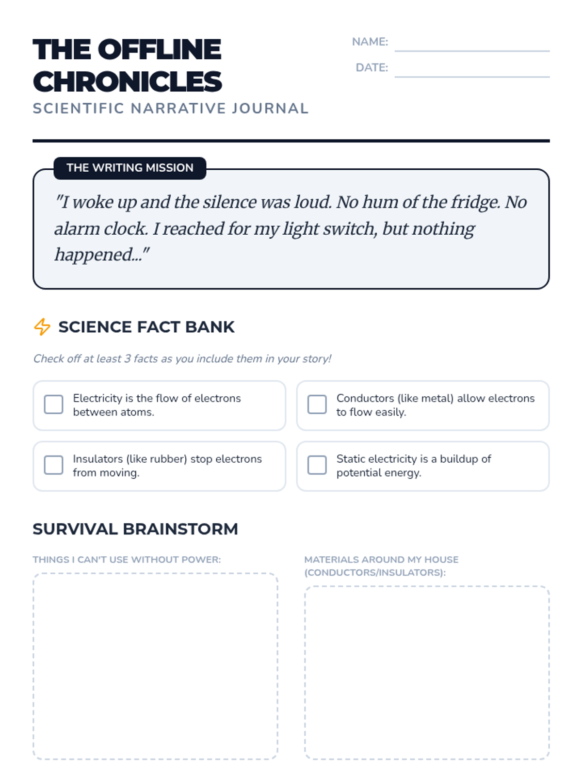 Students will explore the concept of a world without electricity through creative writing. They will integrate scientific facts about electrical energy, conductors, and insulators into a narrative story, demonstrating their understanding of how our daily lives rely on the flow of electrons.