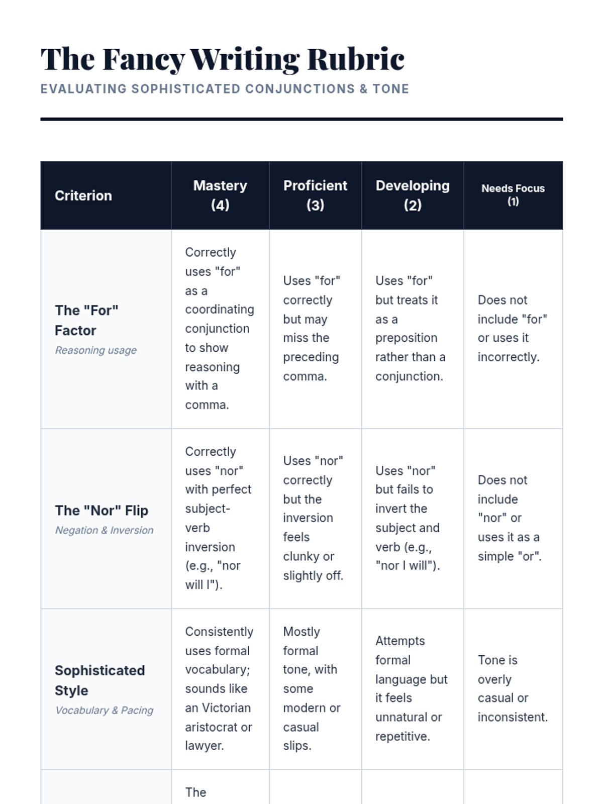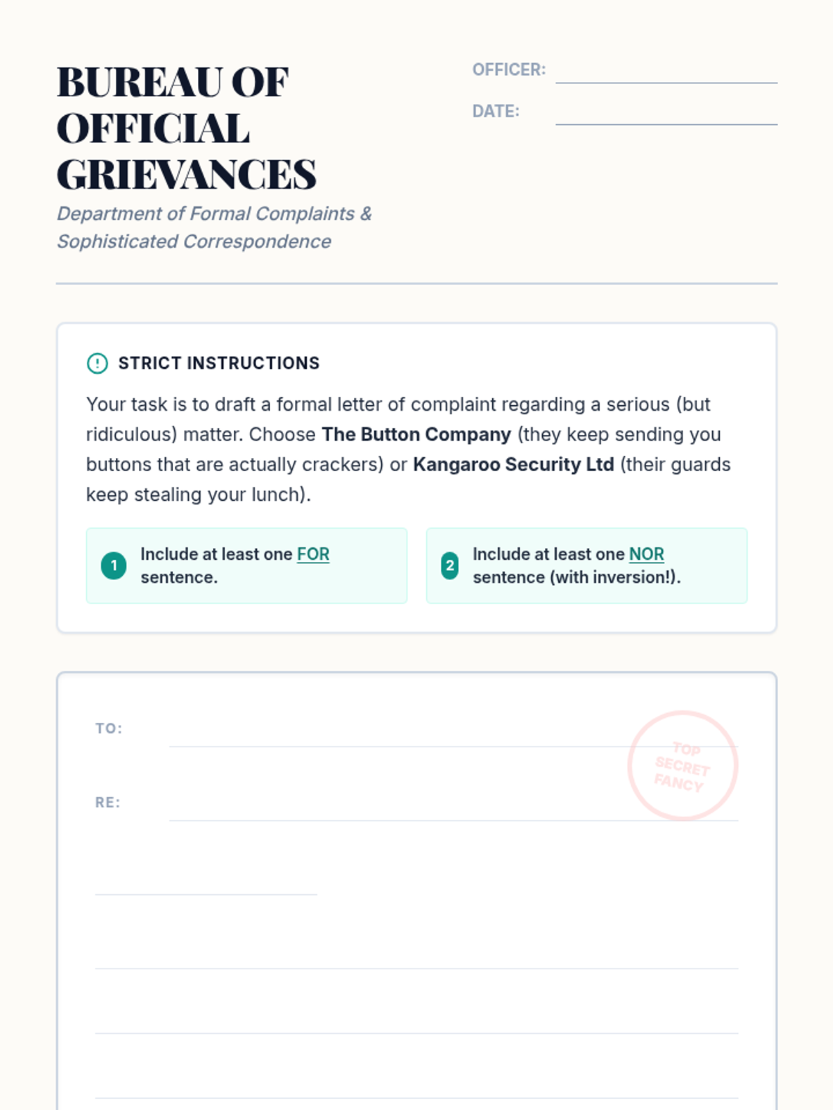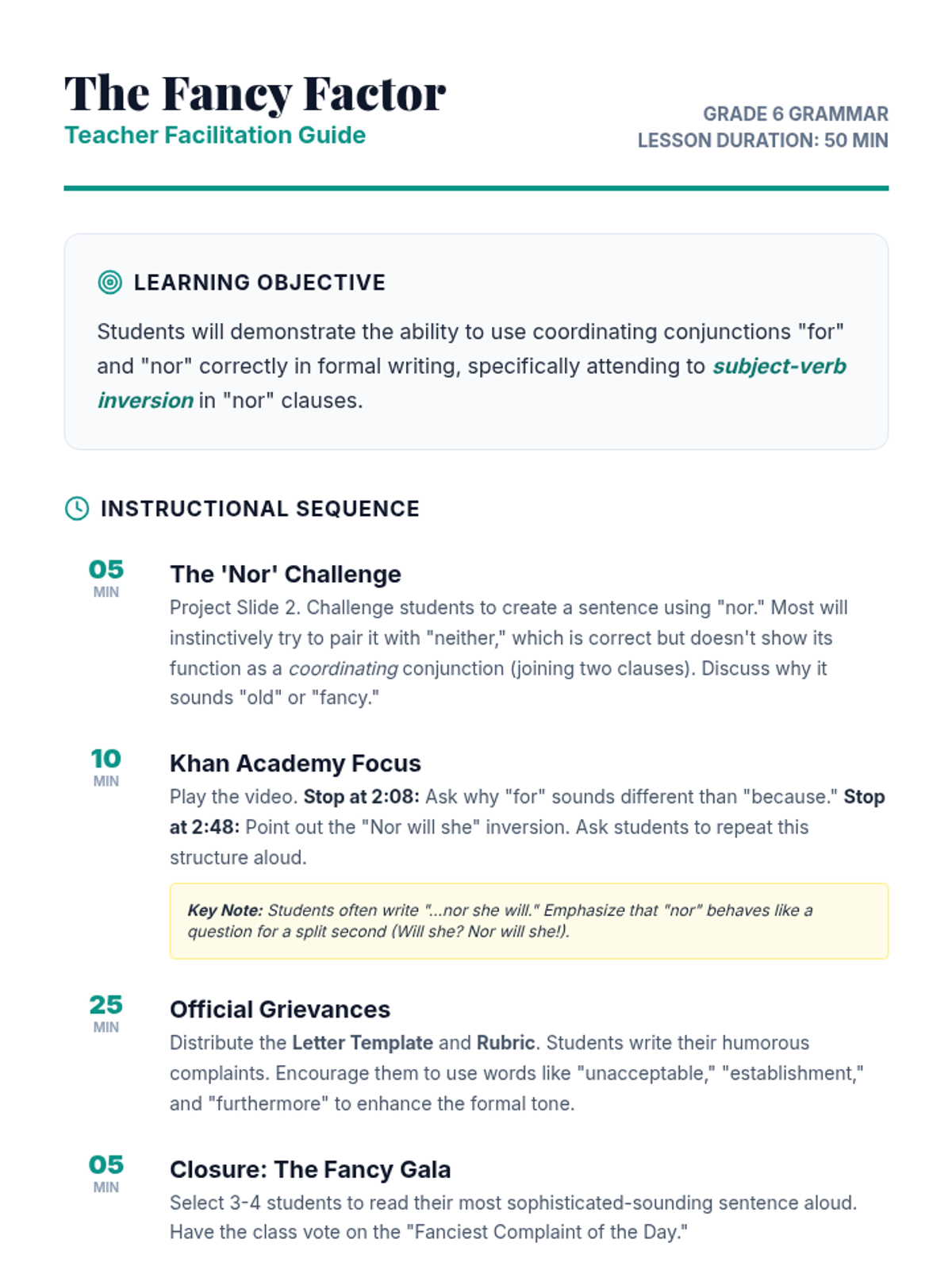 A grammar lesson for 6th graders focusing on the formal coordinating conjunctions 'for' and 'nor' through a humorous formal complaint letter activity. Students will analyze sentence inversion and formal tone using a Khan Academy video as a guide.