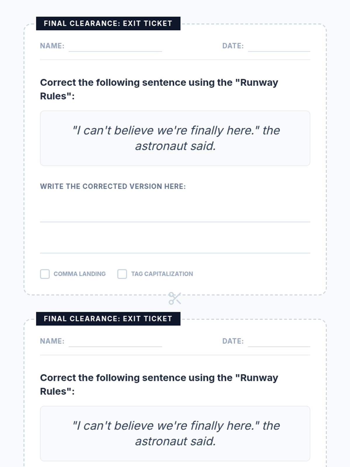 A 6th-grade lesson on punctuating dialogue using the 'runway' metaphor. Students translate a comic strip into narrative prose, applying correct comma and quotation mark placement.