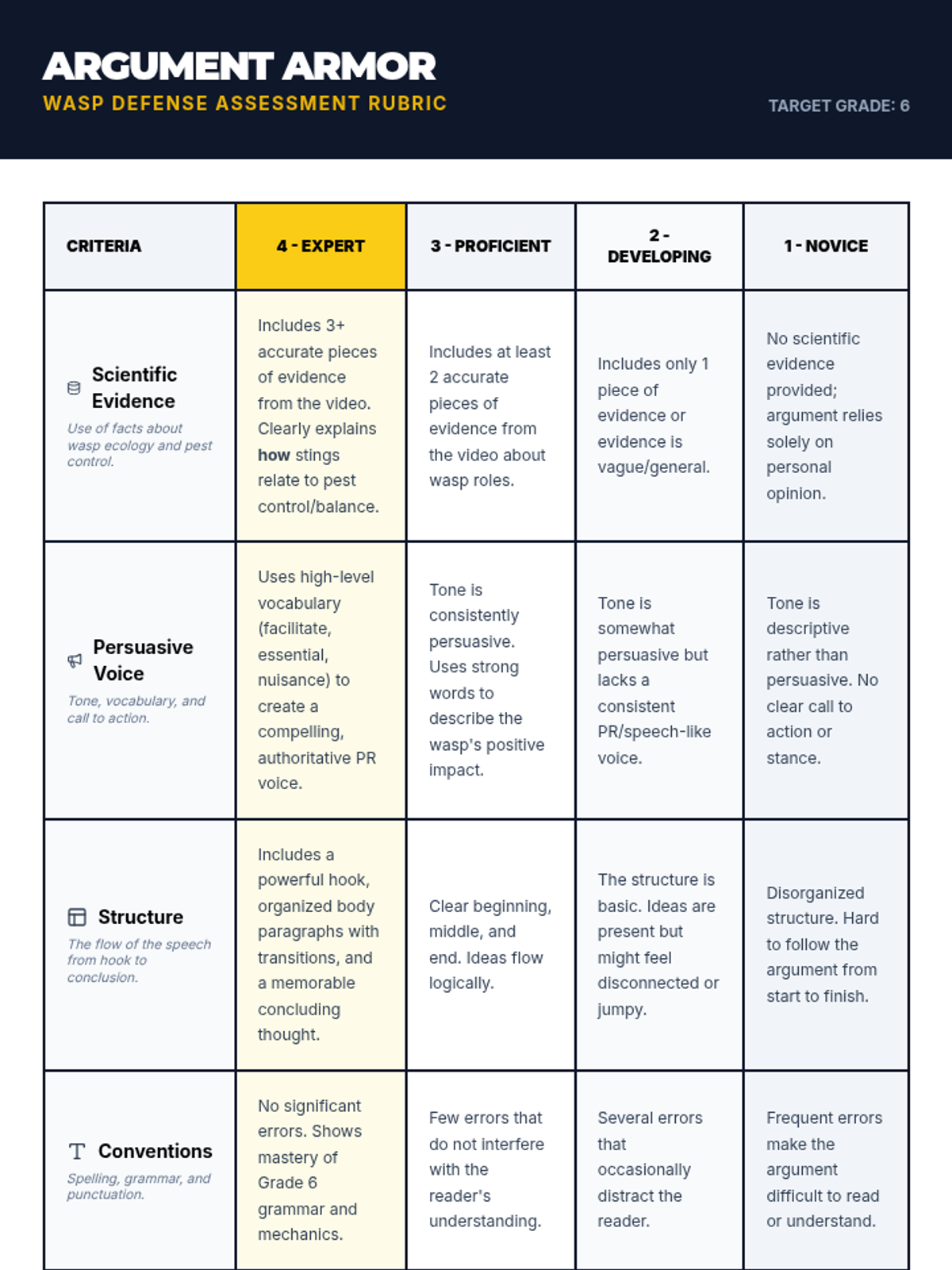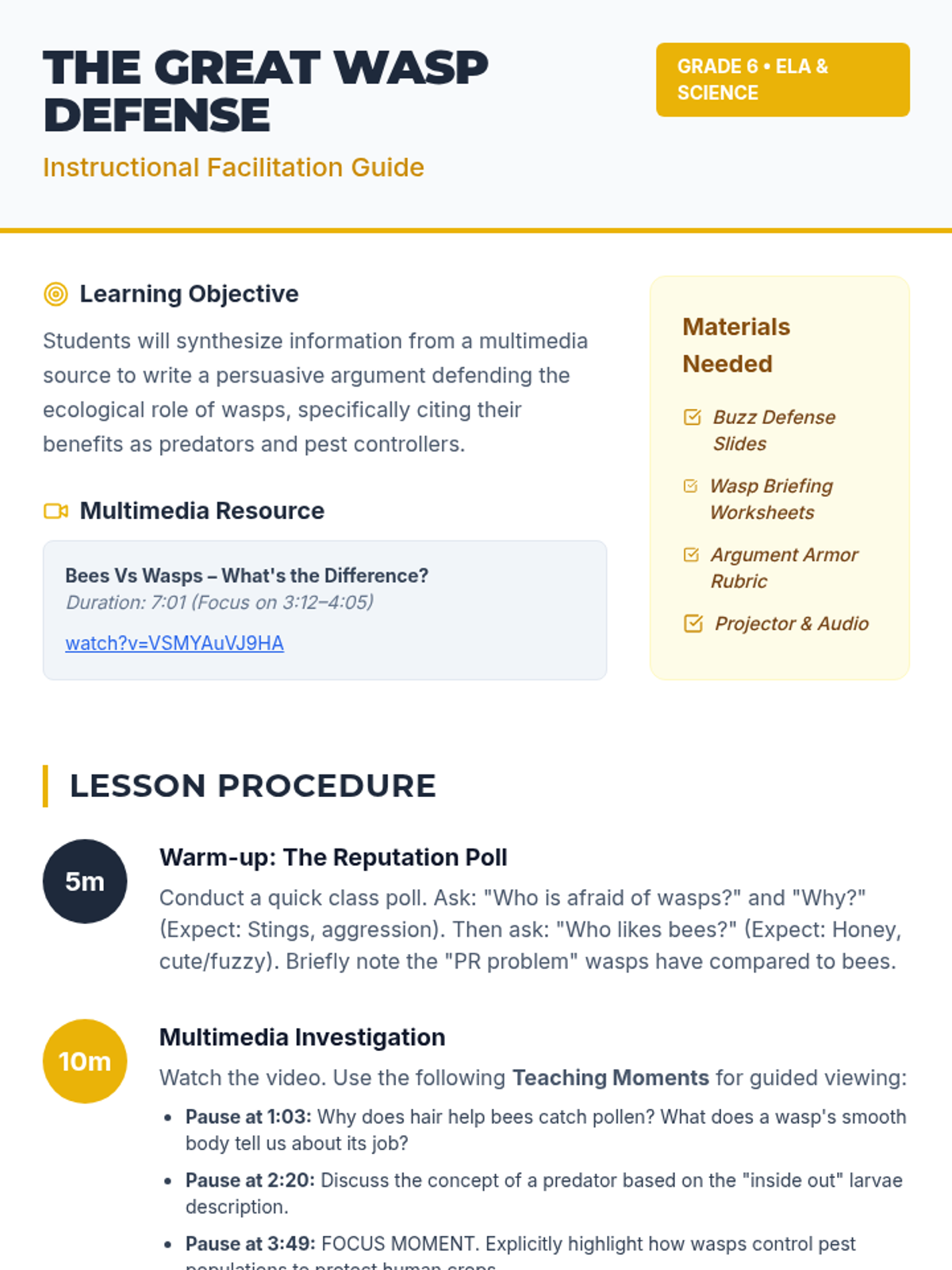 A 6th-grade ELA and Science integrated lesson where students analyze the ecological importance of wasps and write a persuasive defense to combat their negative reputation. Students use evidence from a comparative video to build their arguments.