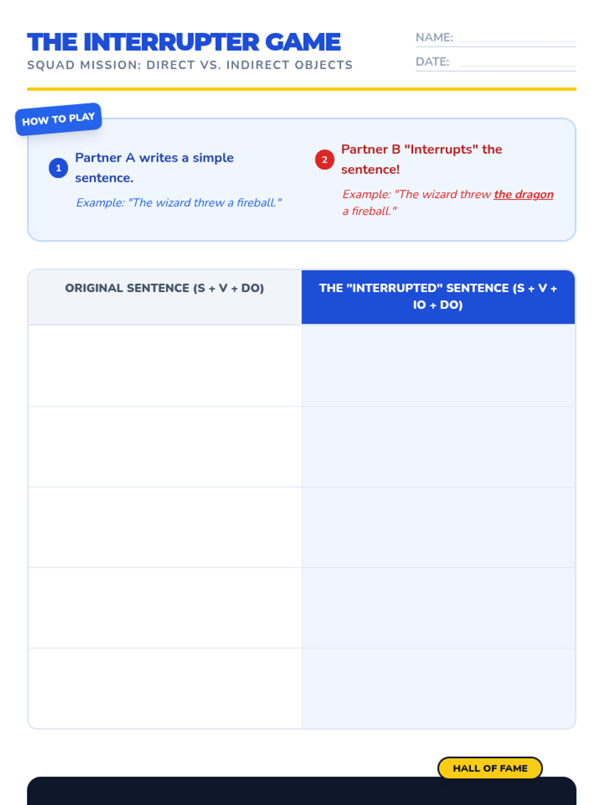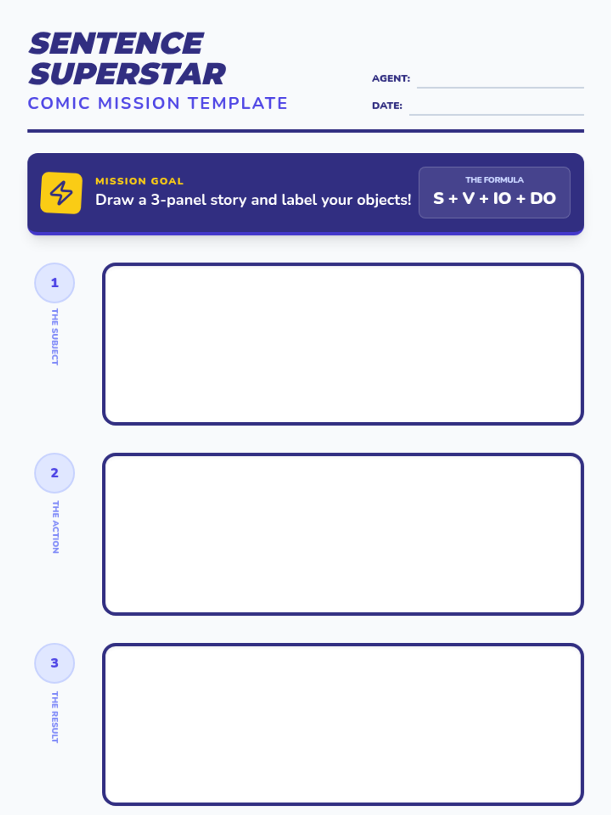 Students will learn to identify and distinguish between subjects, verbs, direct objects, and indirect objects through a high-energy 'Simon Says' warm-up, an interactive video analysis, and a creative comic strip project.