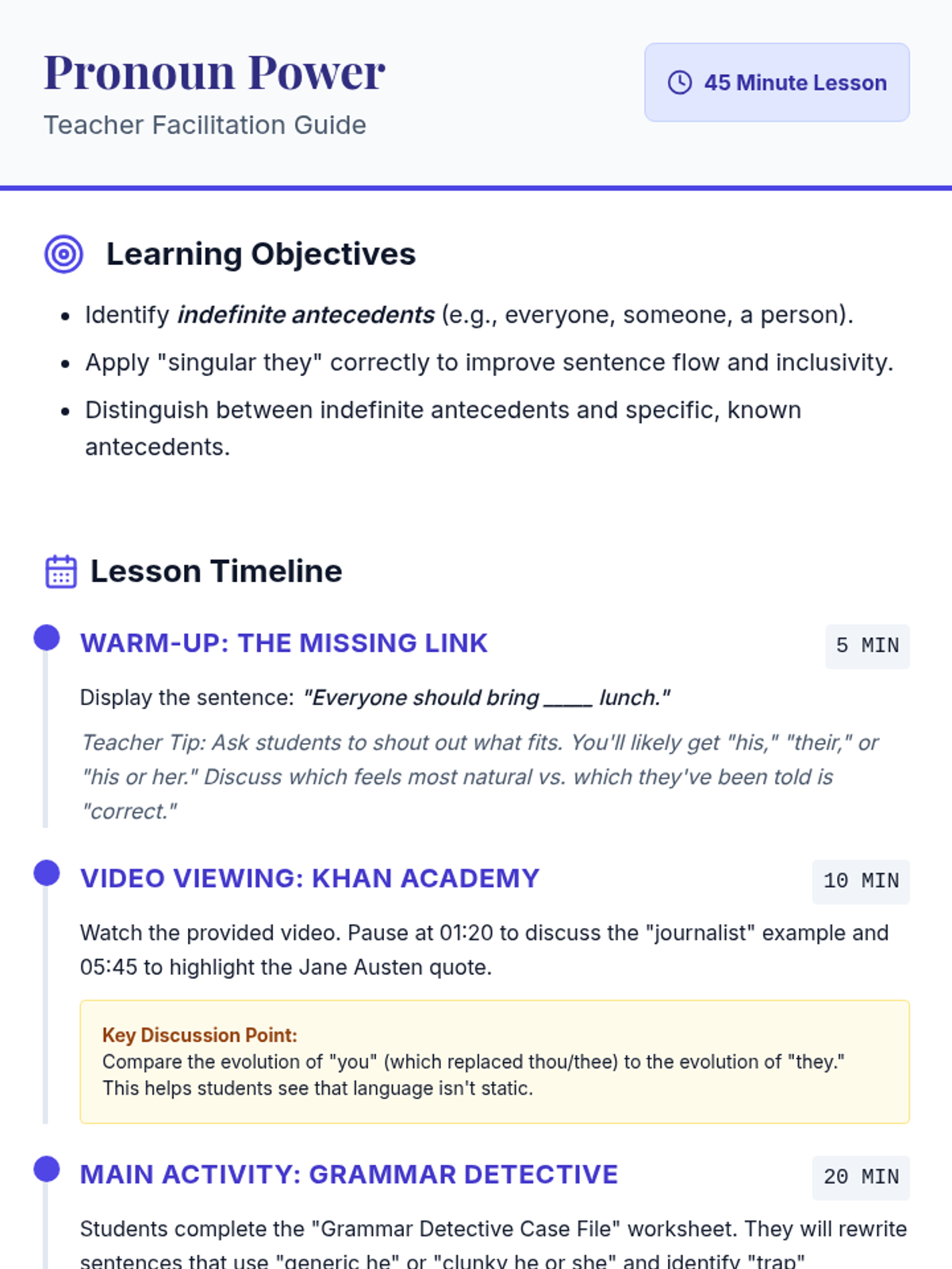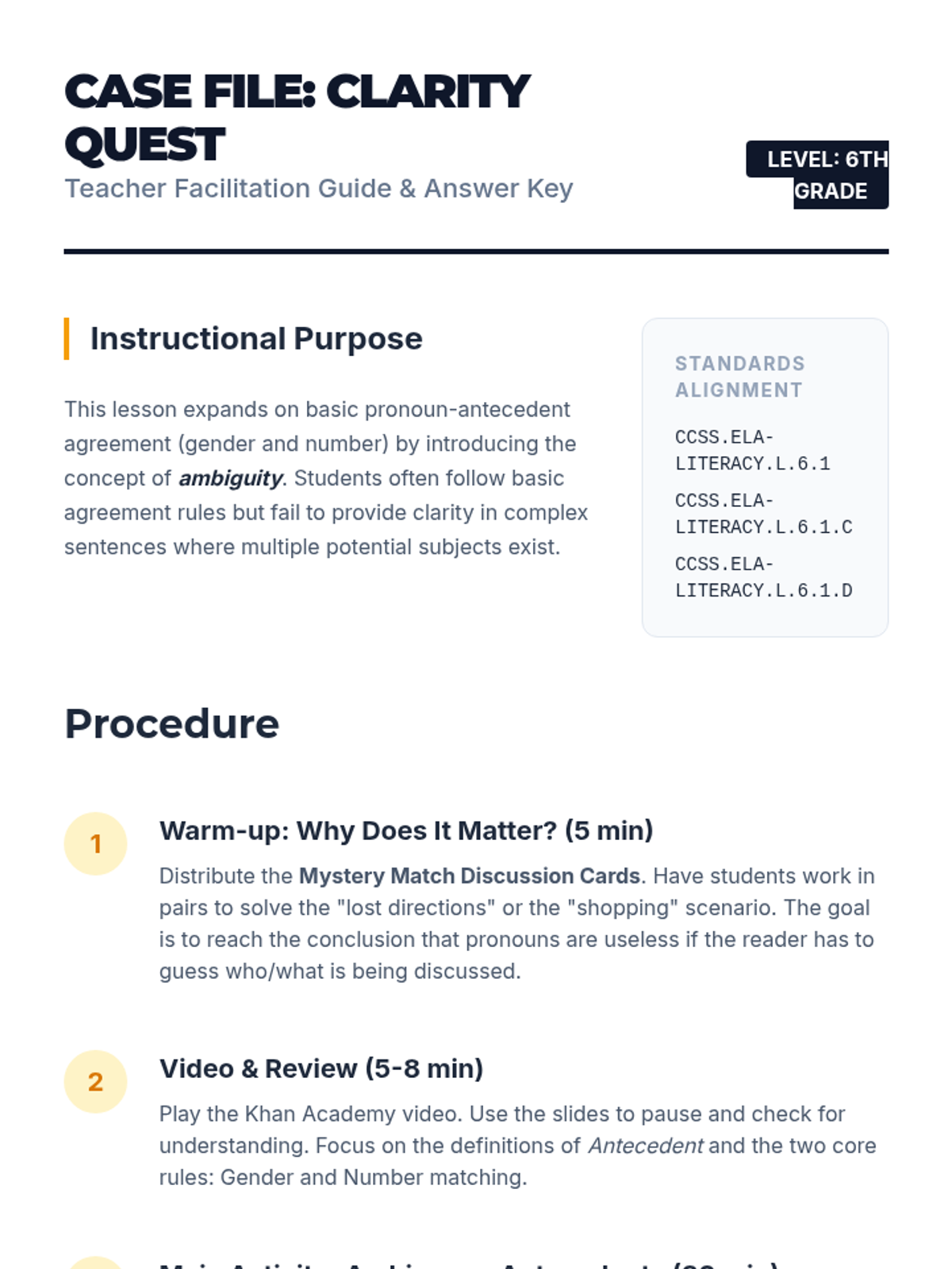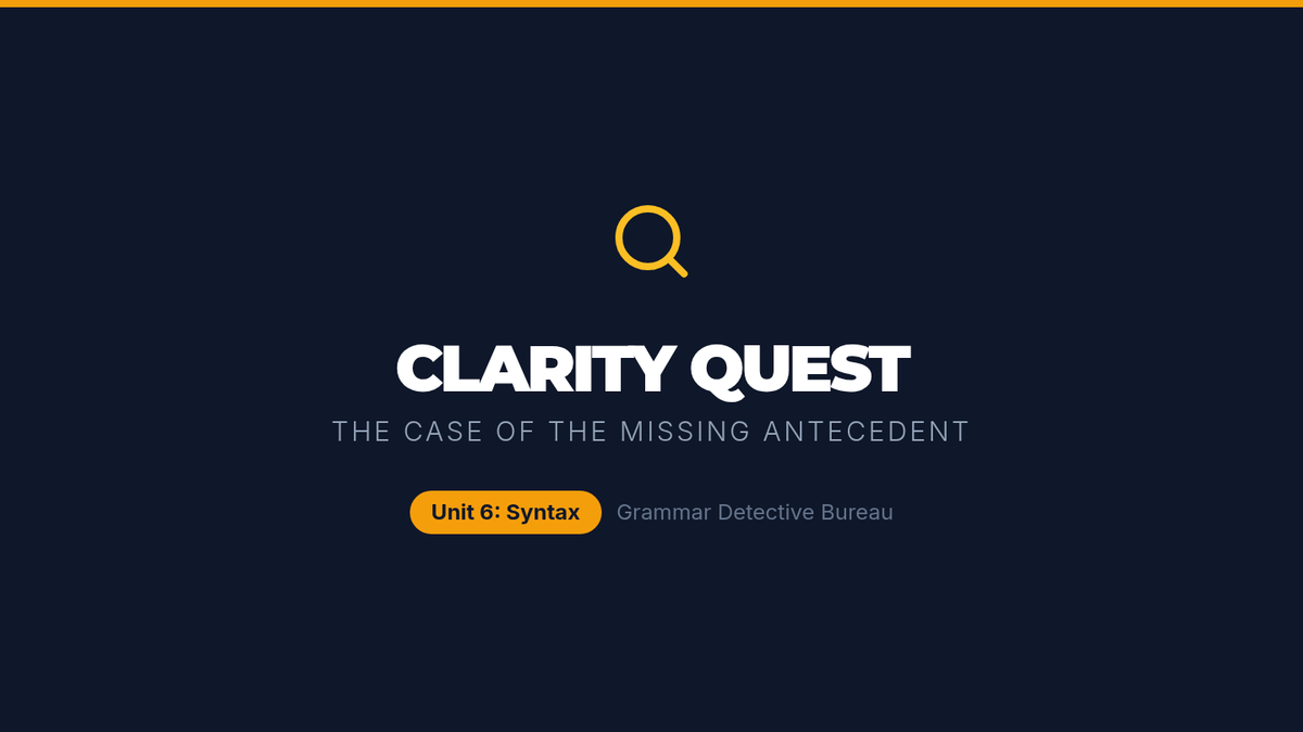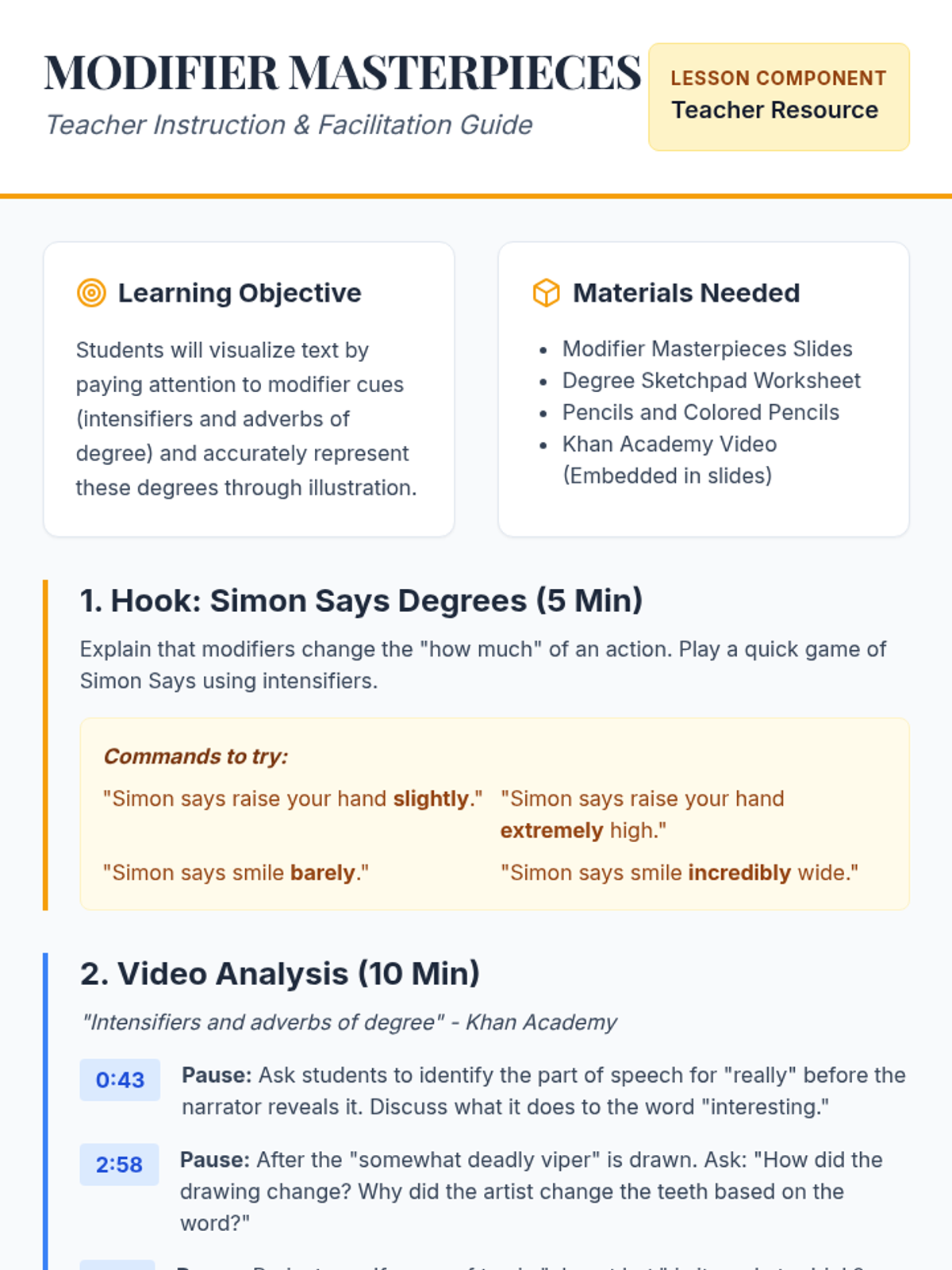 A high-energy grammar lesson where students identify and fix dangling and misplaced modifiers through a video-based discussion and a "Modifier Match-Up" card game. Students learn to ensure modifiers are placed next to the nouns they actually describe to avoid "silly" sentence meanings.