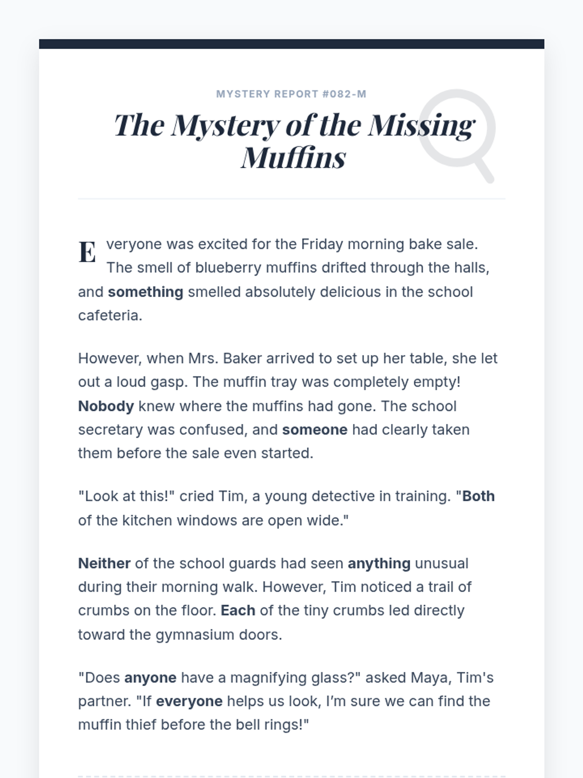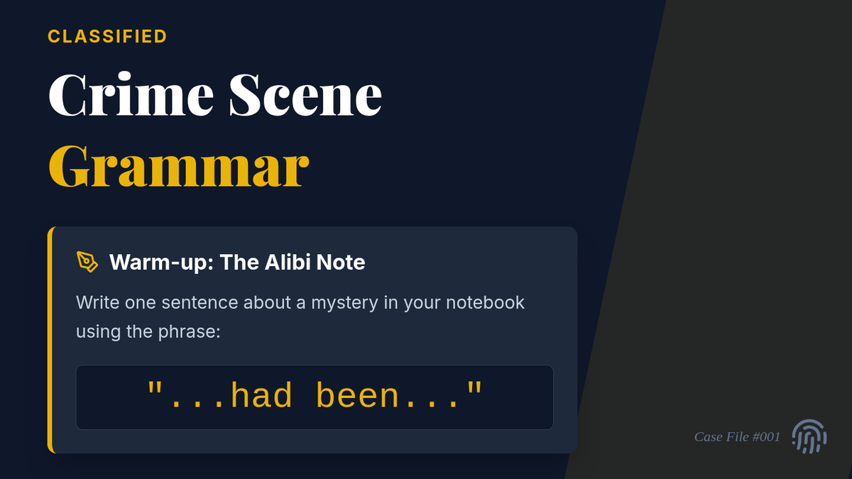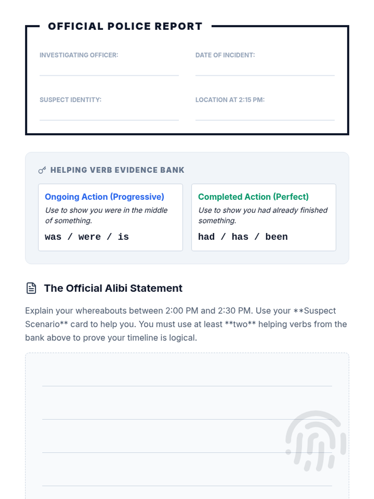 A mystery-themed grammar lesson where students master auxiliary verbs by writing alibis to prove their innocence in the 'Case of the Missing Cake.' Students use progressive and perfect tenses to show specific timelines of events.