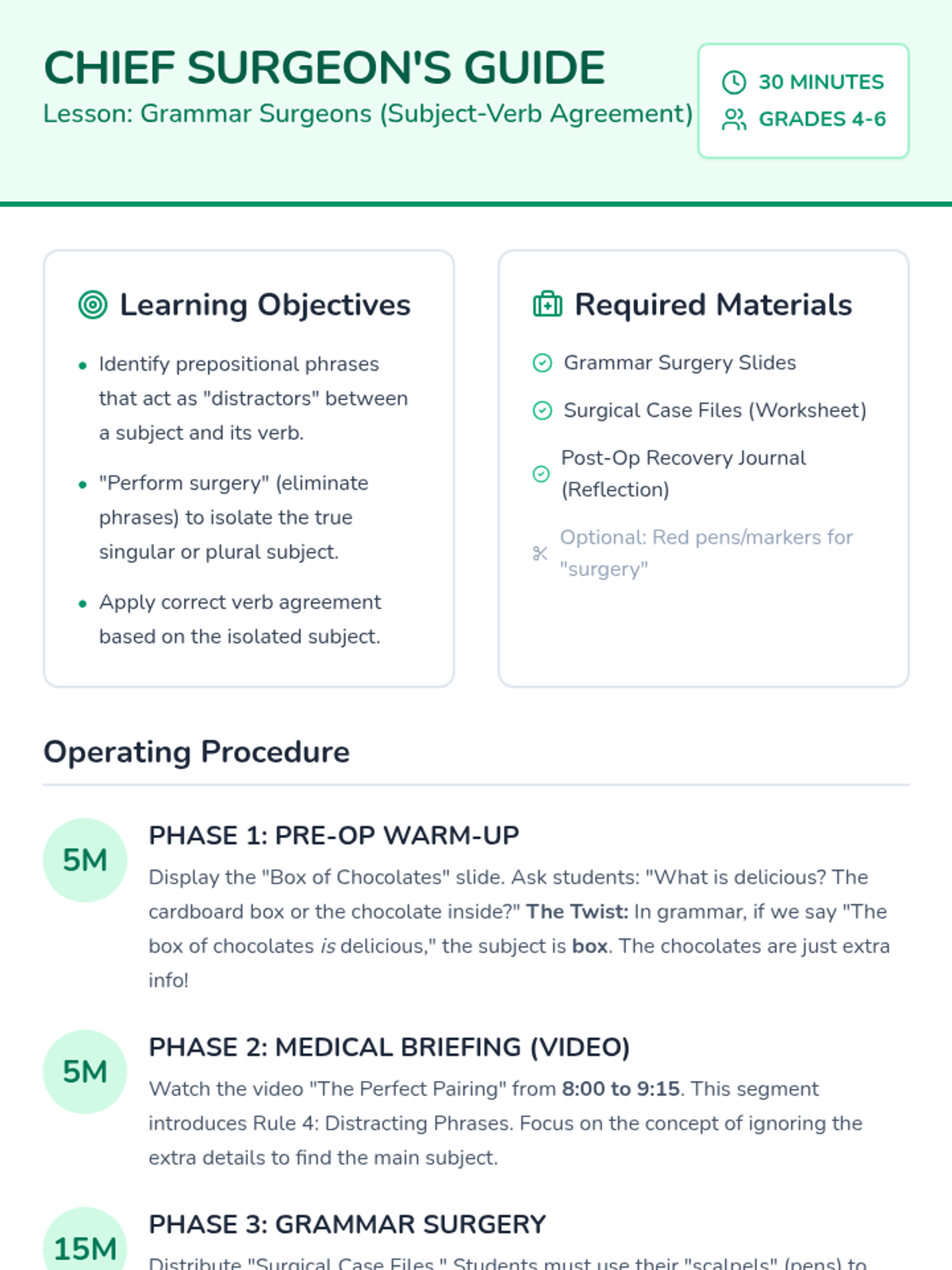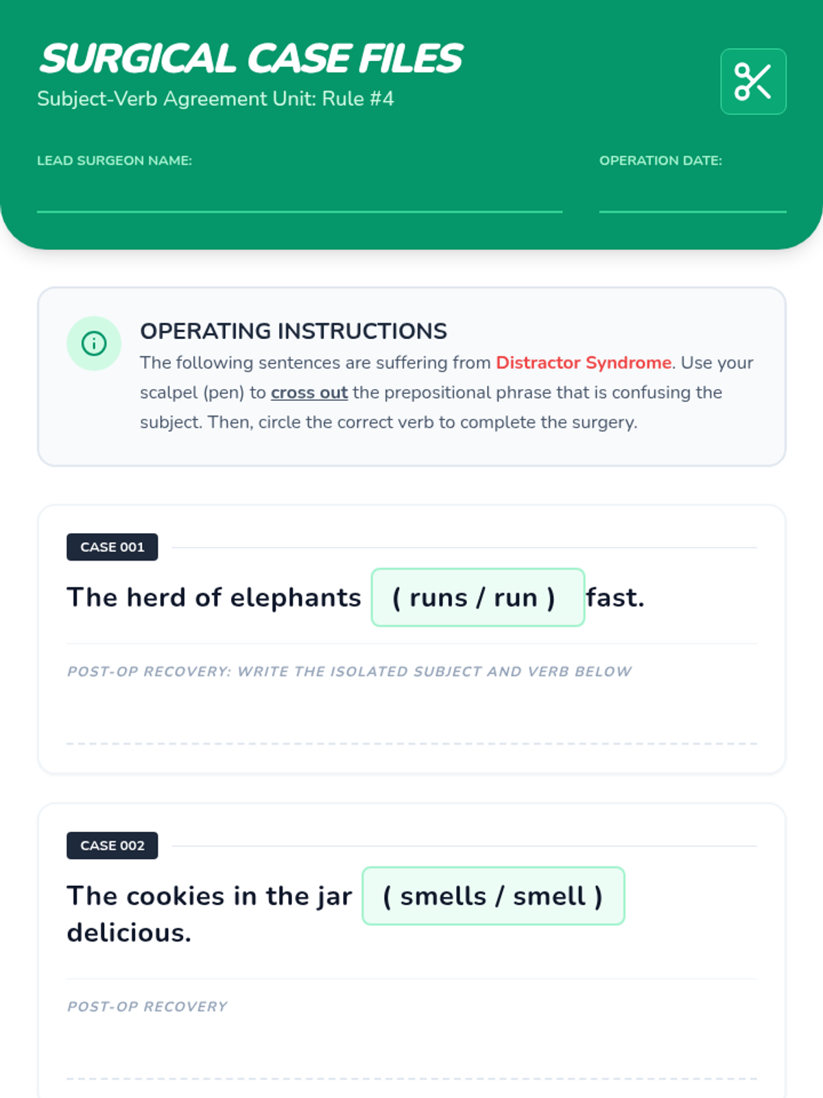 A targeted grammar lesson for grades 4-6 focusing on identifying the true subject by eliminating distracting prepositional phrases, featuring a 'Grammar Surgery' theme.