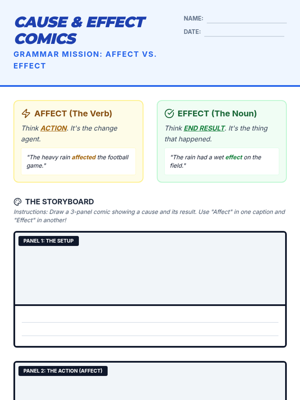 A 6th-grade grammar lesson focusing on the commonly confused words 'affect' and 'effect' through a comic strip creation activity and video analysis.