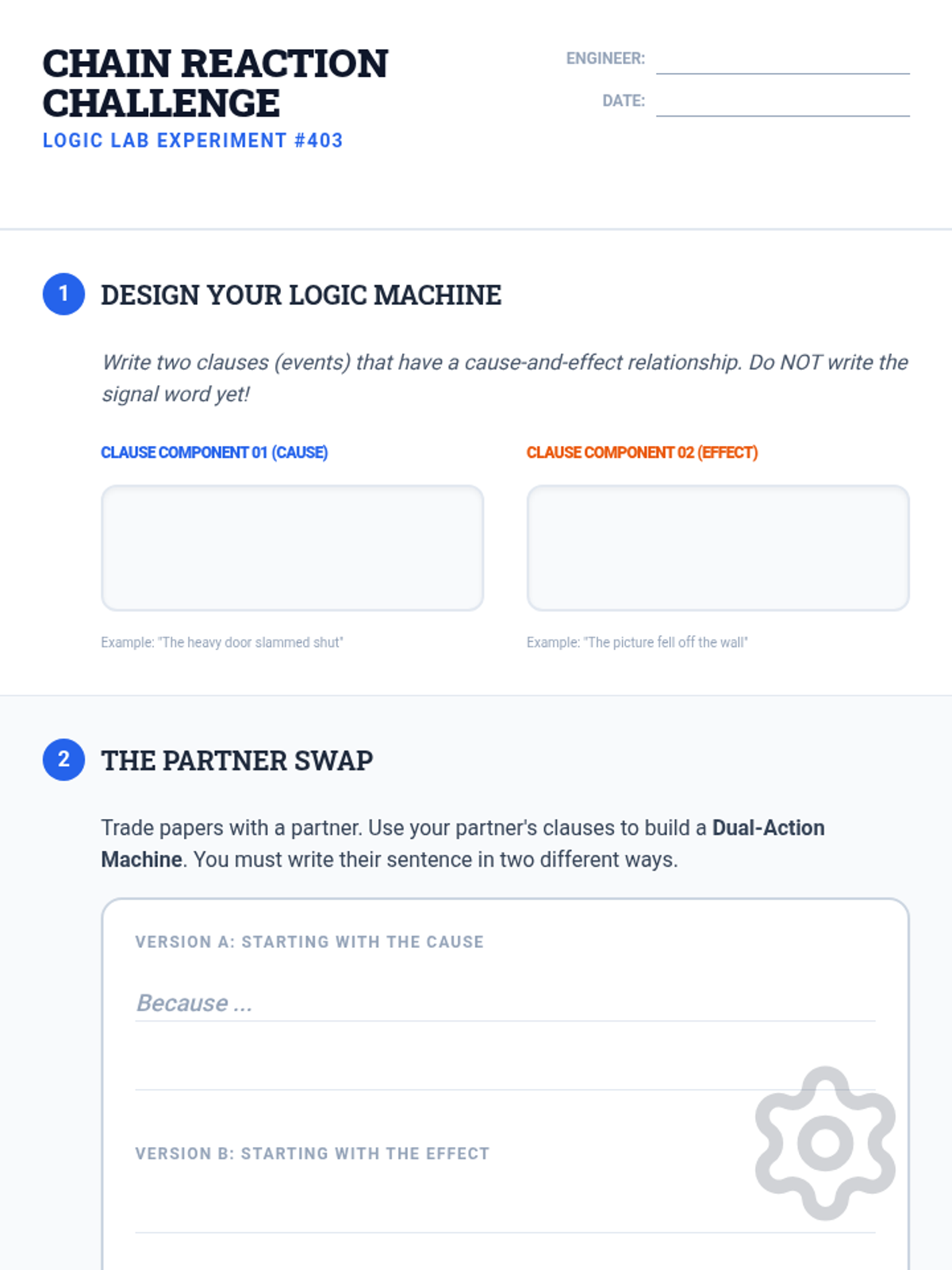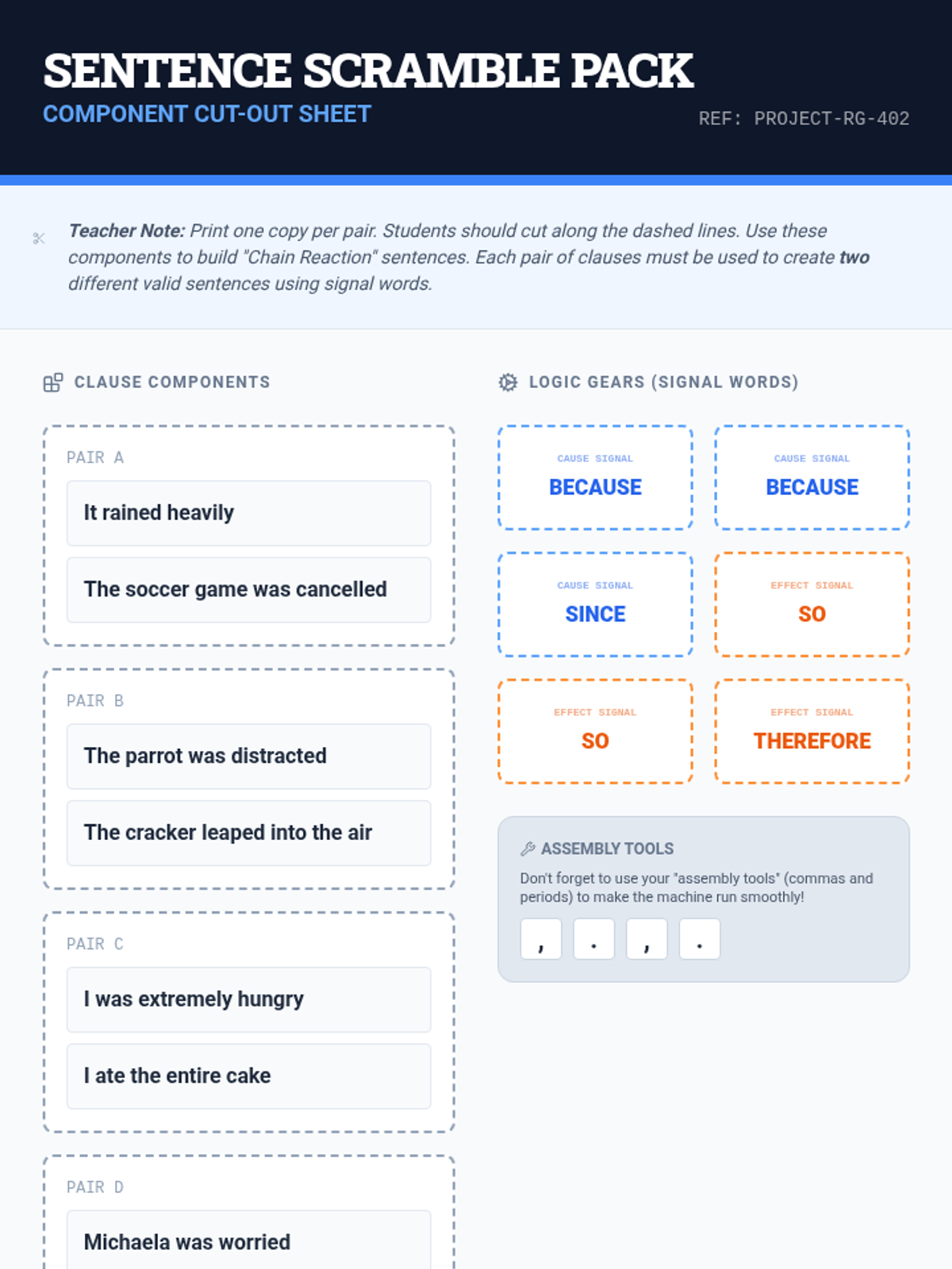 Students will use signal words to identify cause-and-effect relationships within a text and practice 'flipping' sentence structures to change emphasis while maintaining meaning.