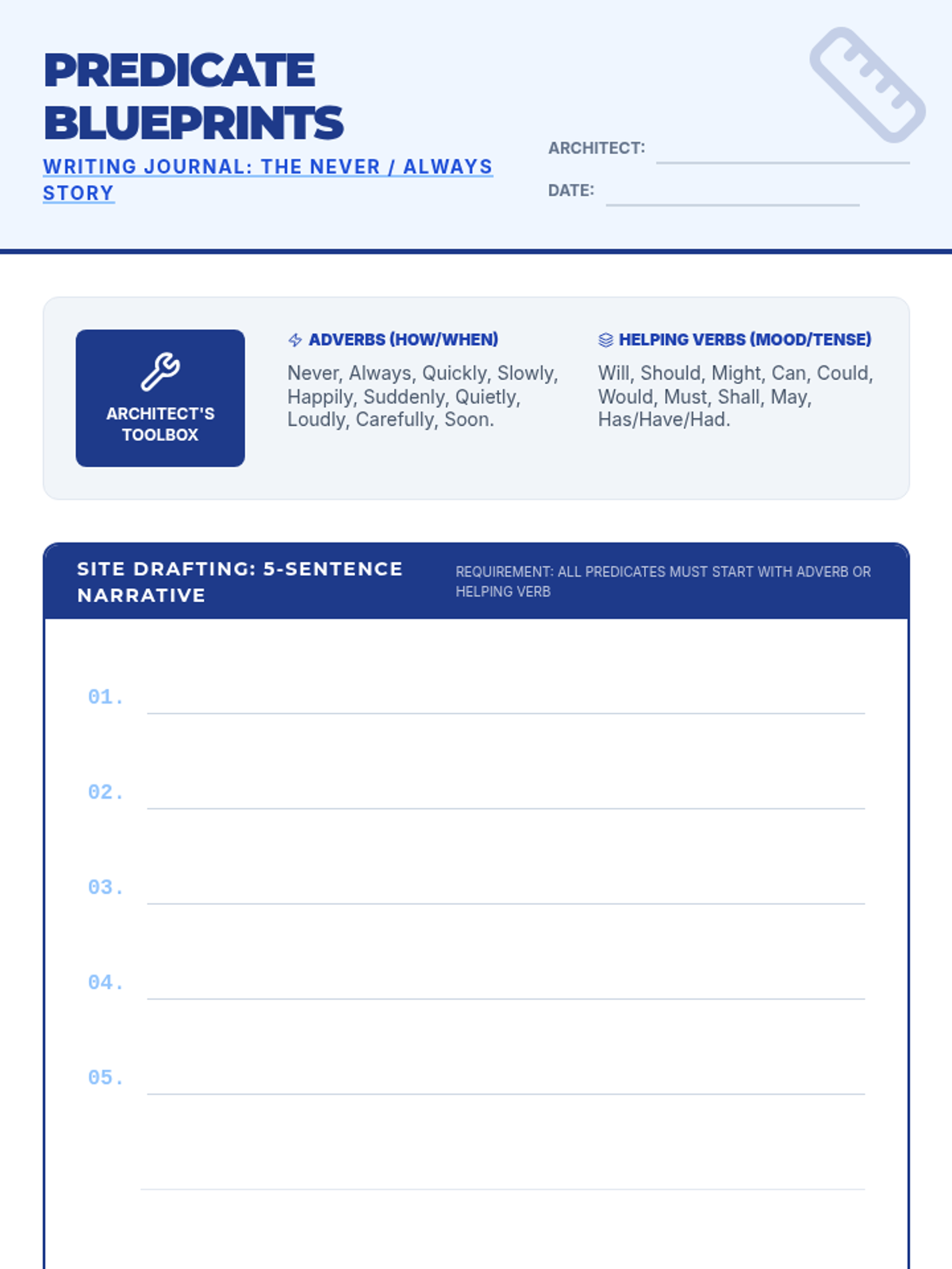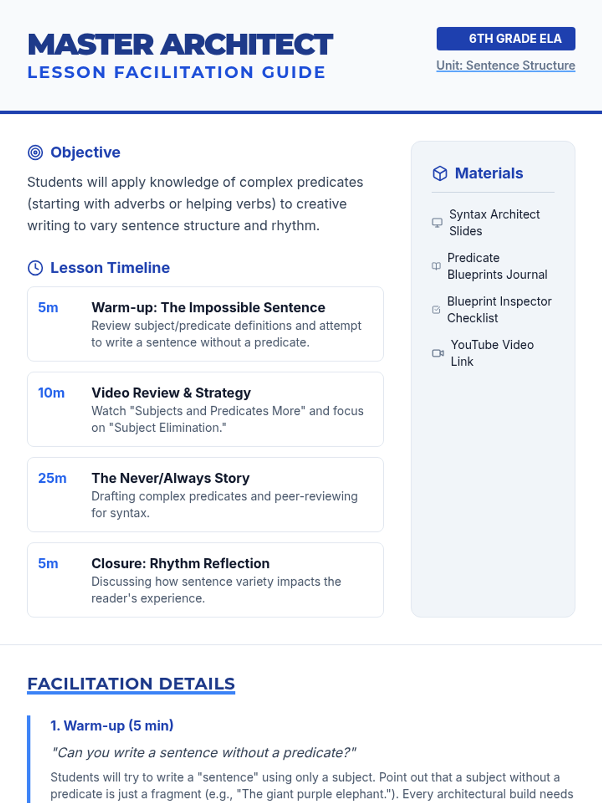 A lesson focusing on identifying and creating complex predicates starting with adverbs or helping verbs to vary sentence structure. Includes a video-based review, a creative writing activity, and a peer review process.