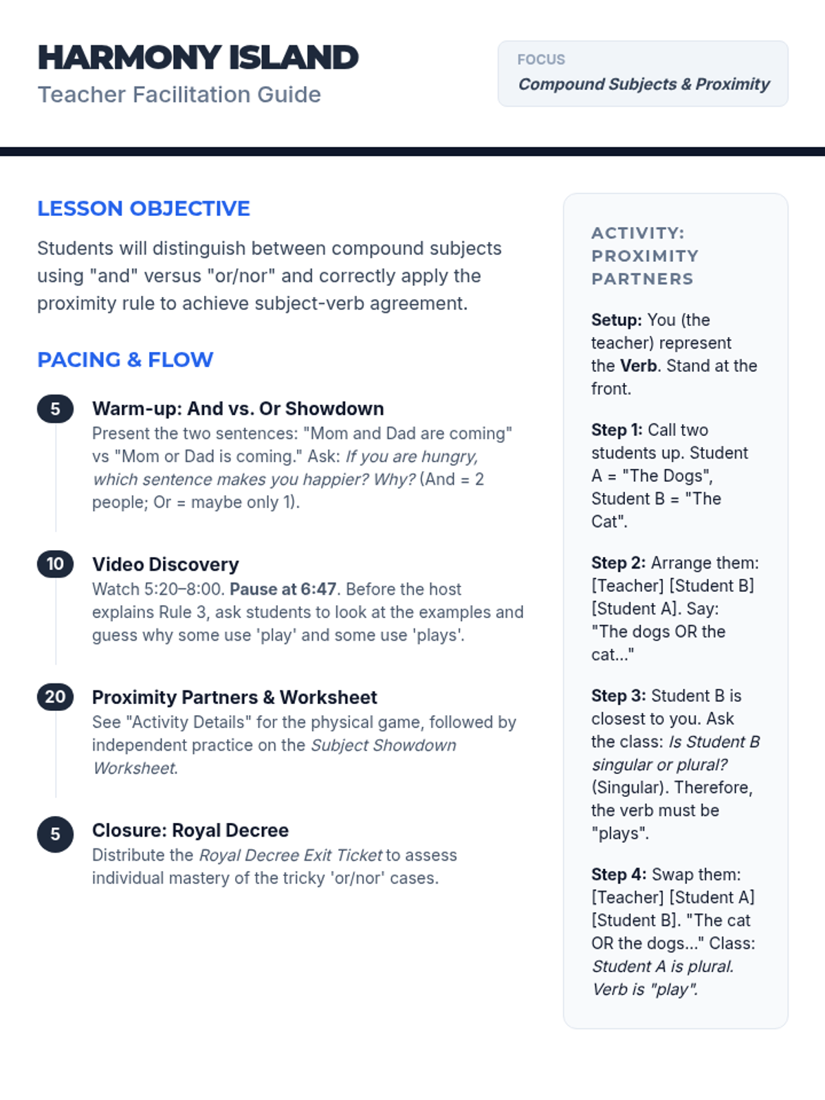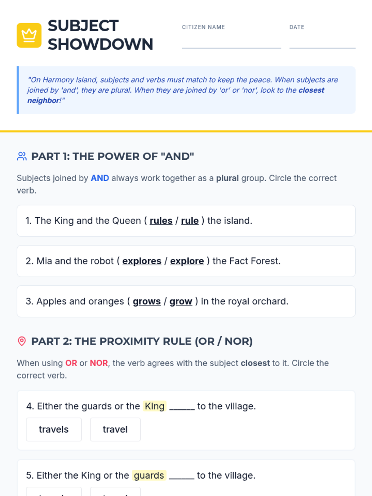 A grammar lesson for 5th and 6th graders focusing on compound subjects joined by 'and' vs. 'or/nor,' specifically teaching the proximity rule through a fantasy-themed narrative.