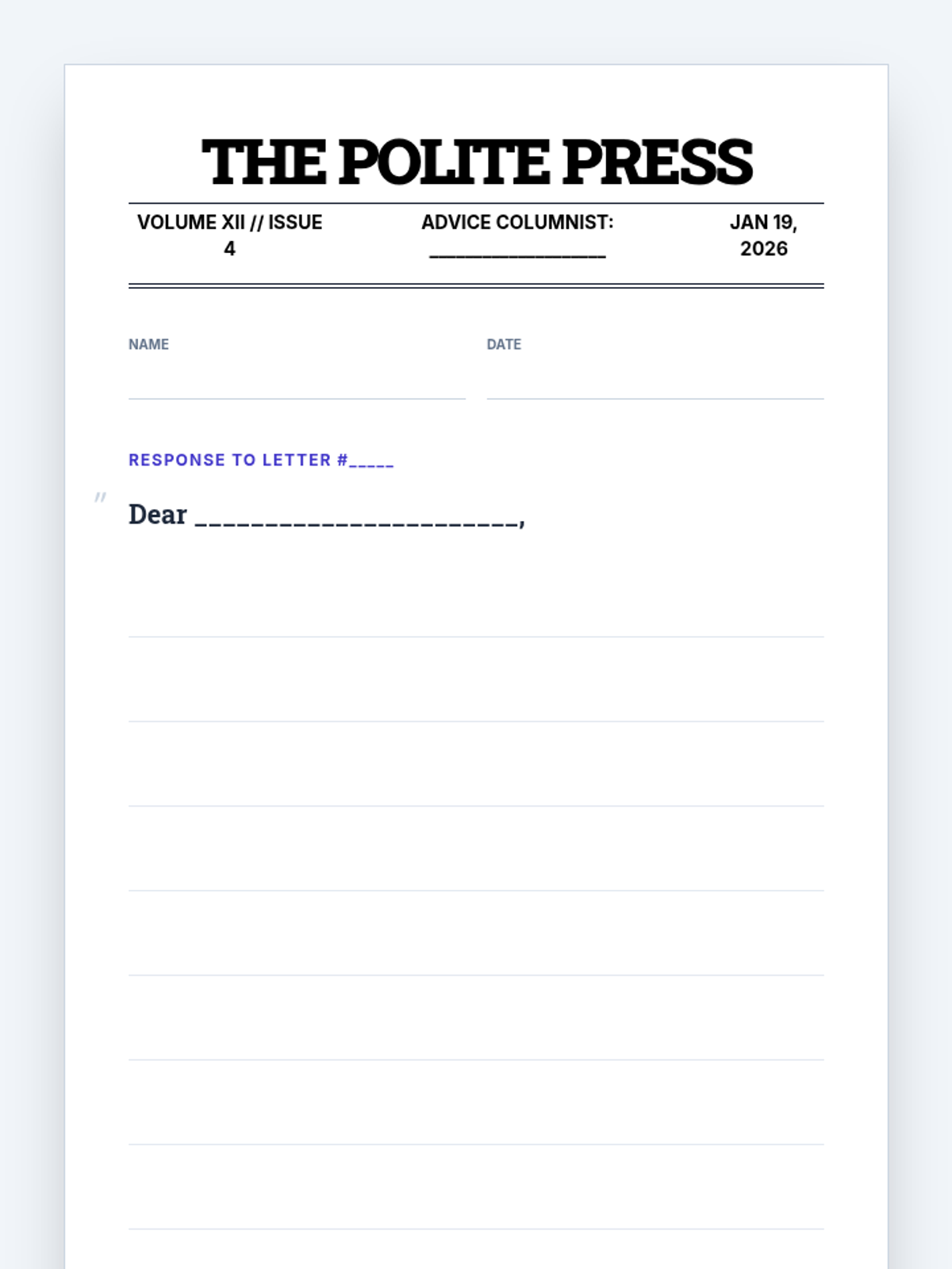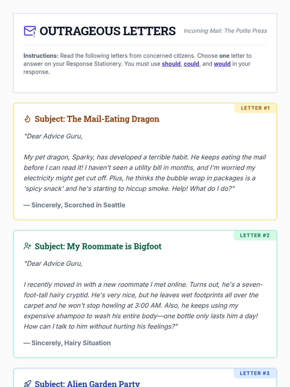 A lesson for middle schoolers to master the modal verbs 'would', 'could', and 'should' through the lens of a humorous advice column. Students explore degrees of certainty and politeness while tackling outrageous problems.