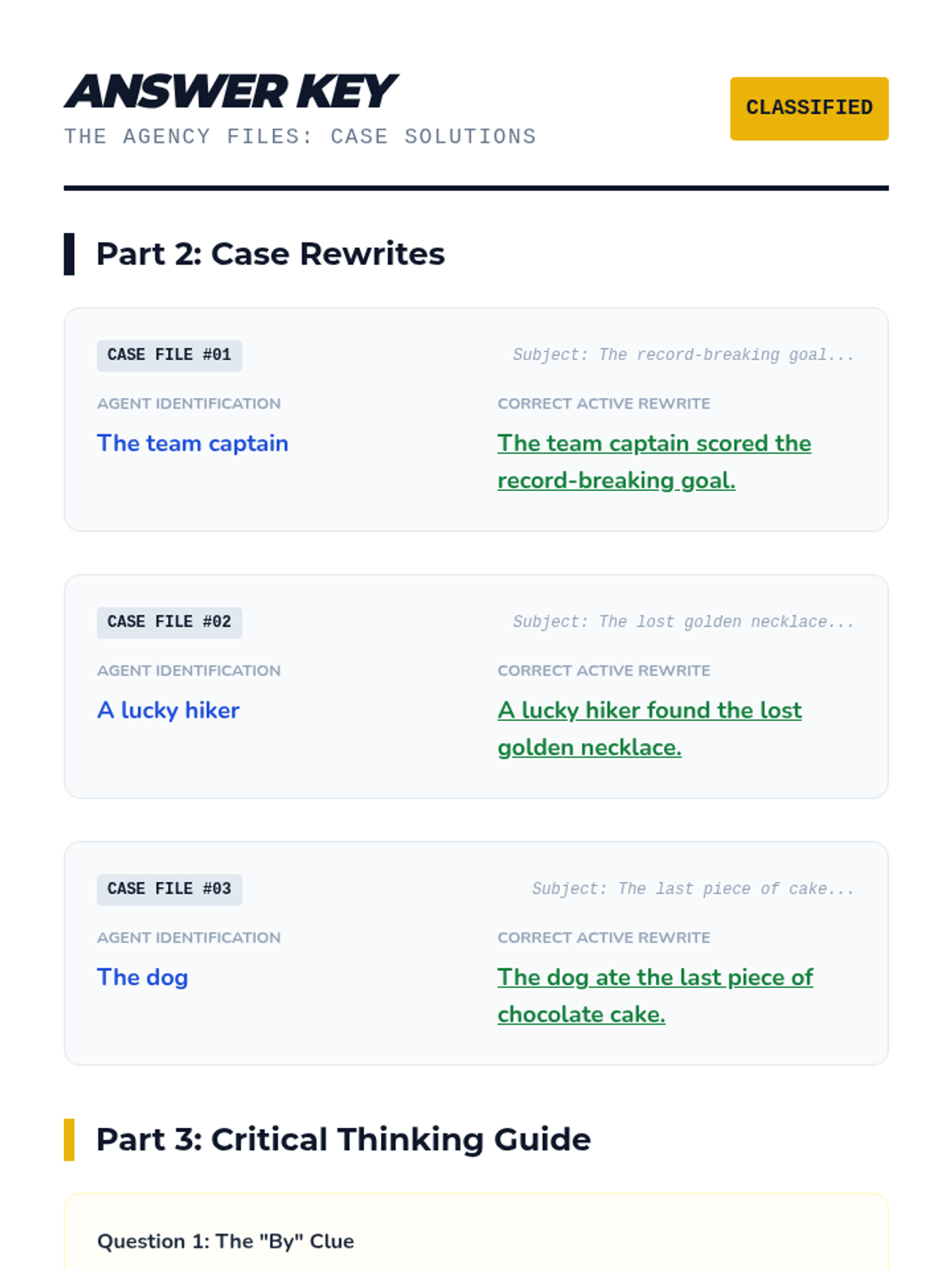 Students will explore the concept of grammatical agency through the preposition 'by', learning to identify doers in passive constructions and transform sentences from passive to active voice.