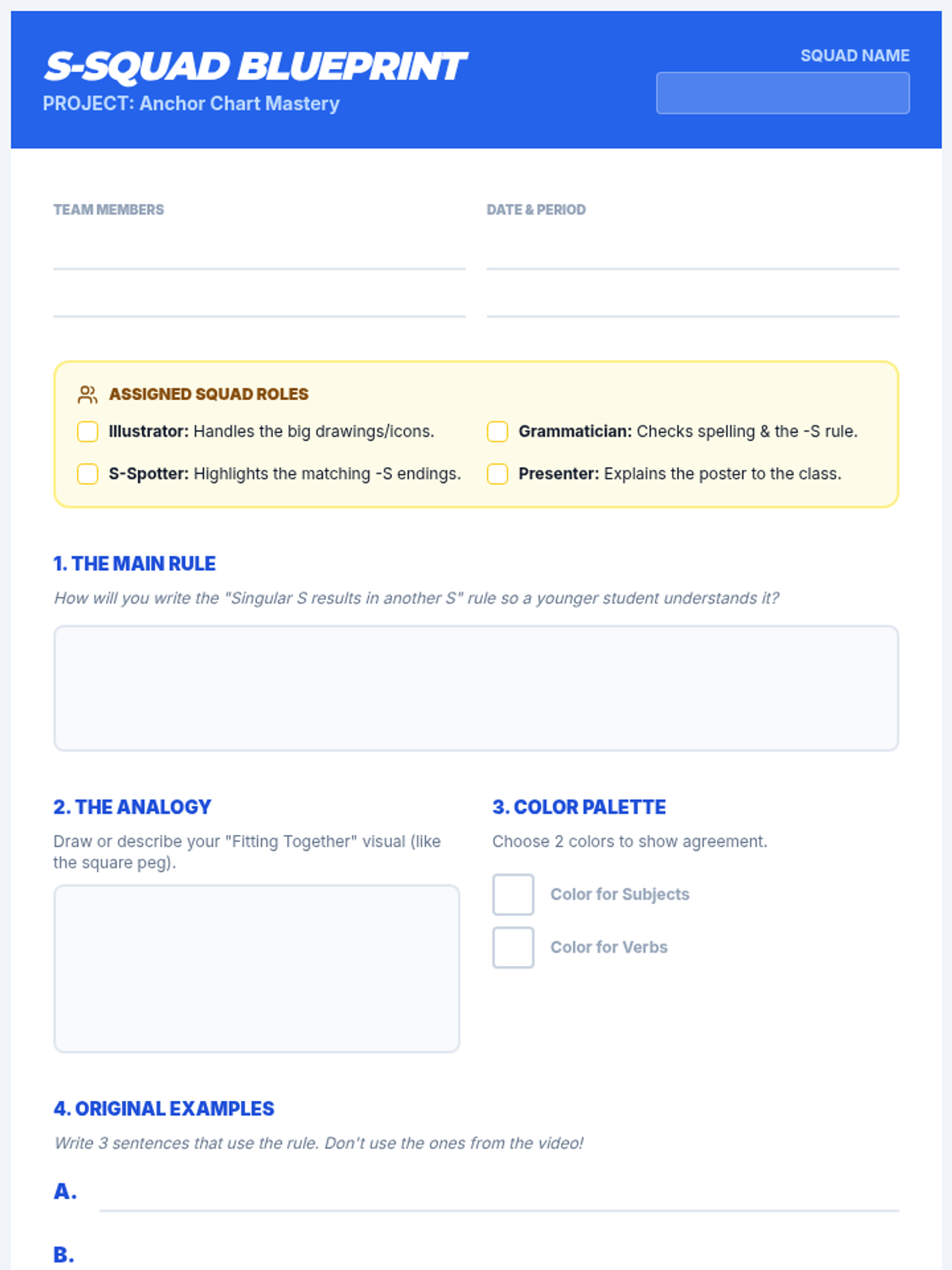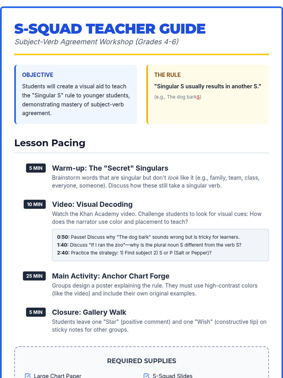Students master subject-verb agreement through the 'Singular S' rule by analyzing a Khan Academy video and collaborating to design teaching posters for younger peers.