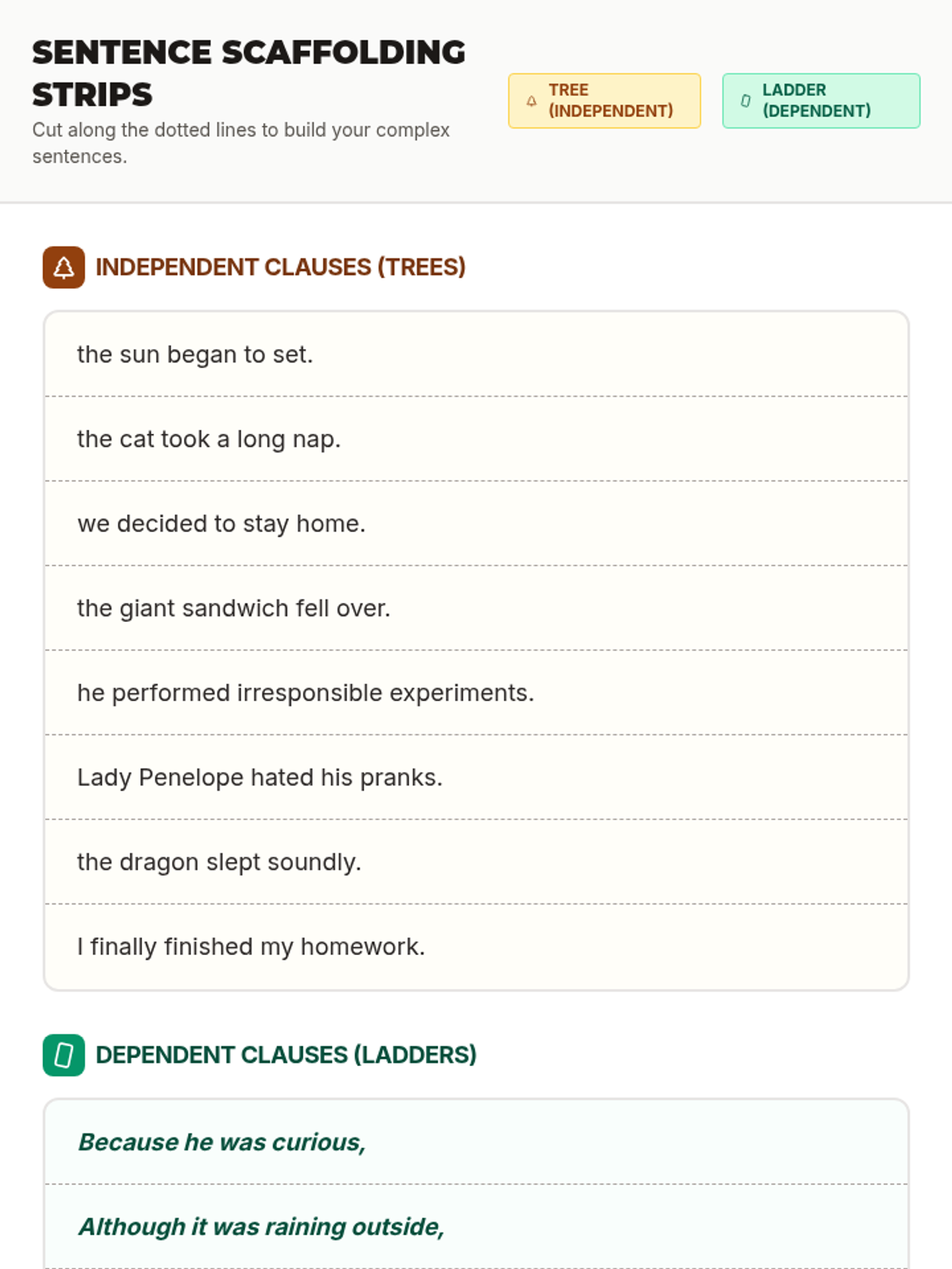A middle school grammar lesson that uses the 'Tree and Ladder' metaphor to help students visualize the relationship between independent and dependent clauses while constructing complex sentences.