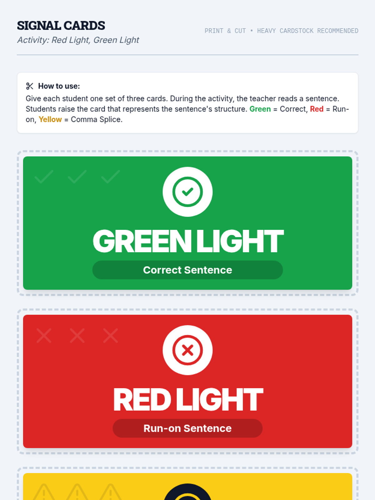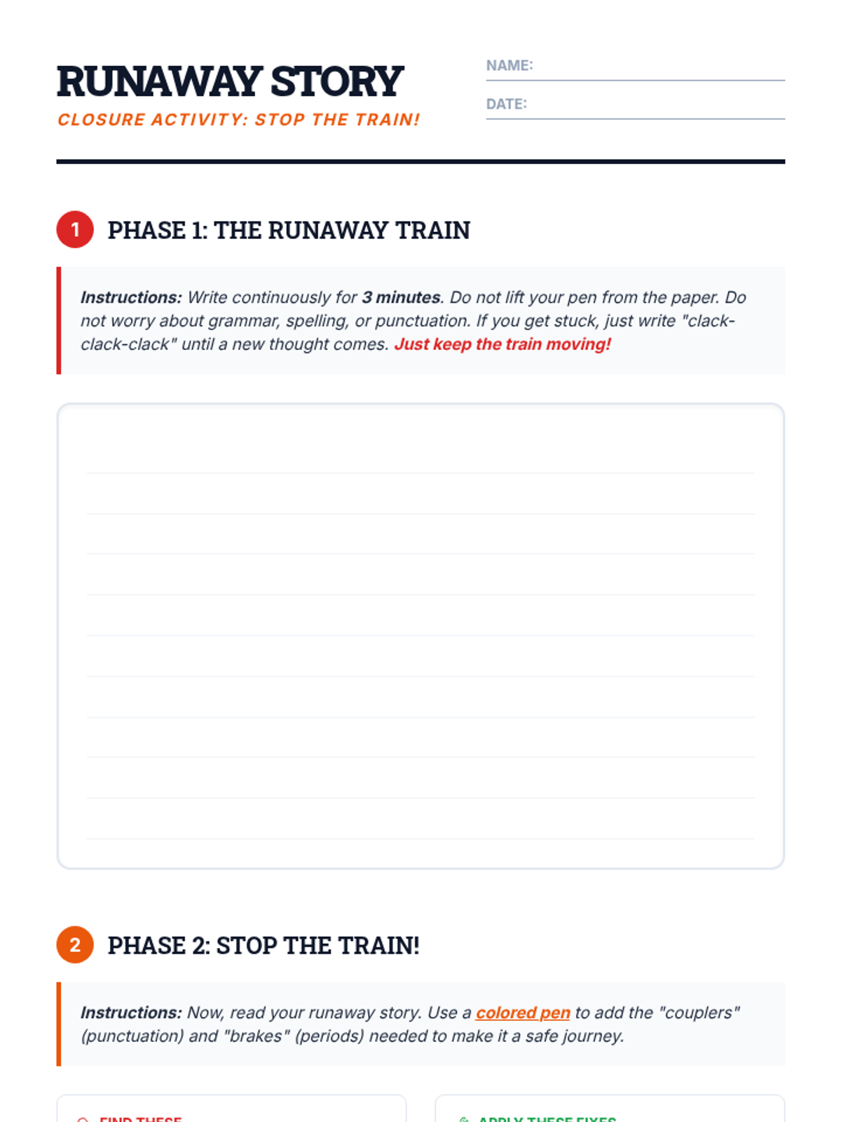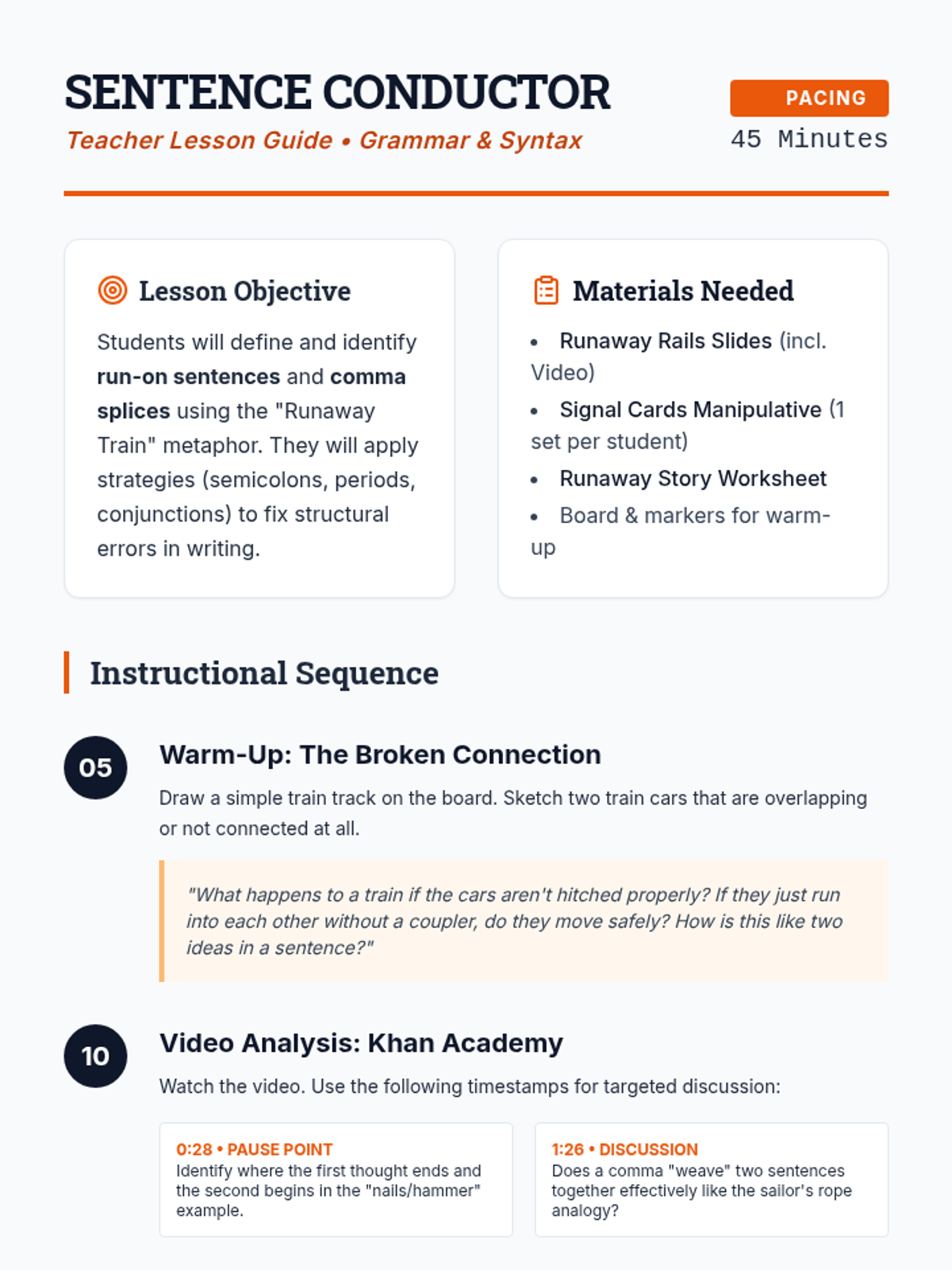 A lesson for middle school students exploring run-on sentences and comma splices through the metaphor of a runaway train, featuring video analysis and a 'Red Light, Green Light' game.
