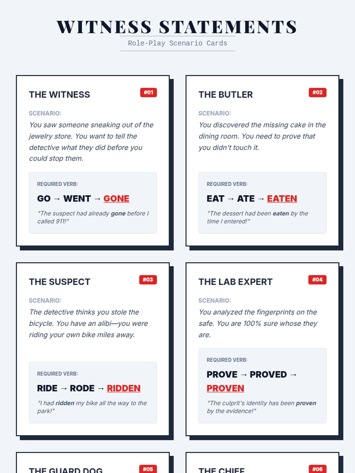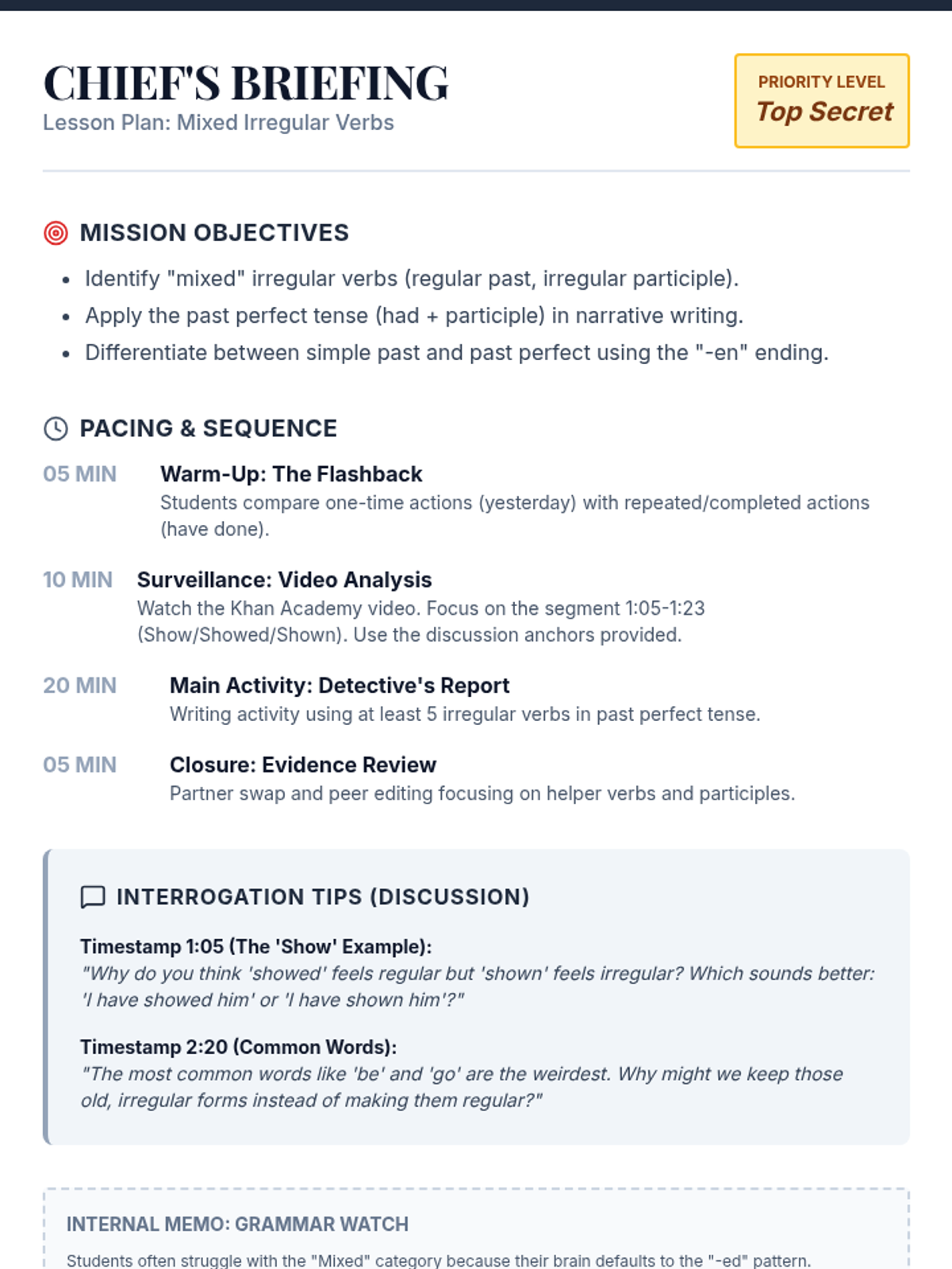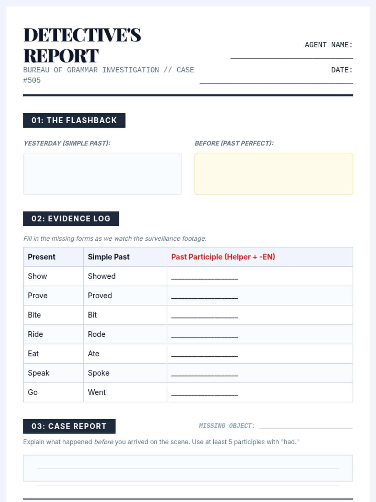 A detective-themed lesson exploring irregular verbs that follow the 'mixed' pattern (regular past, irregular participle) using the 'Detective's Report' narrative framework.