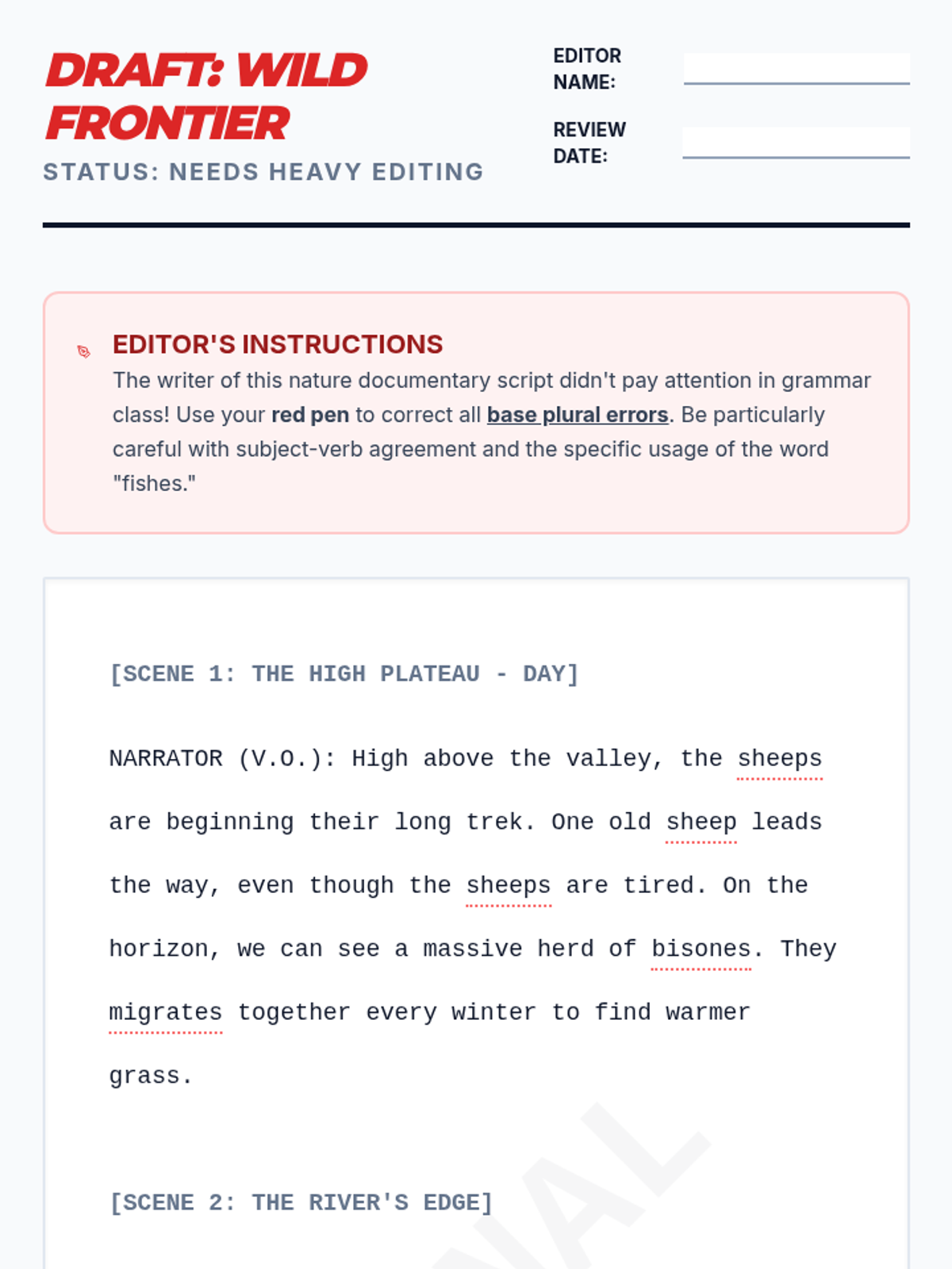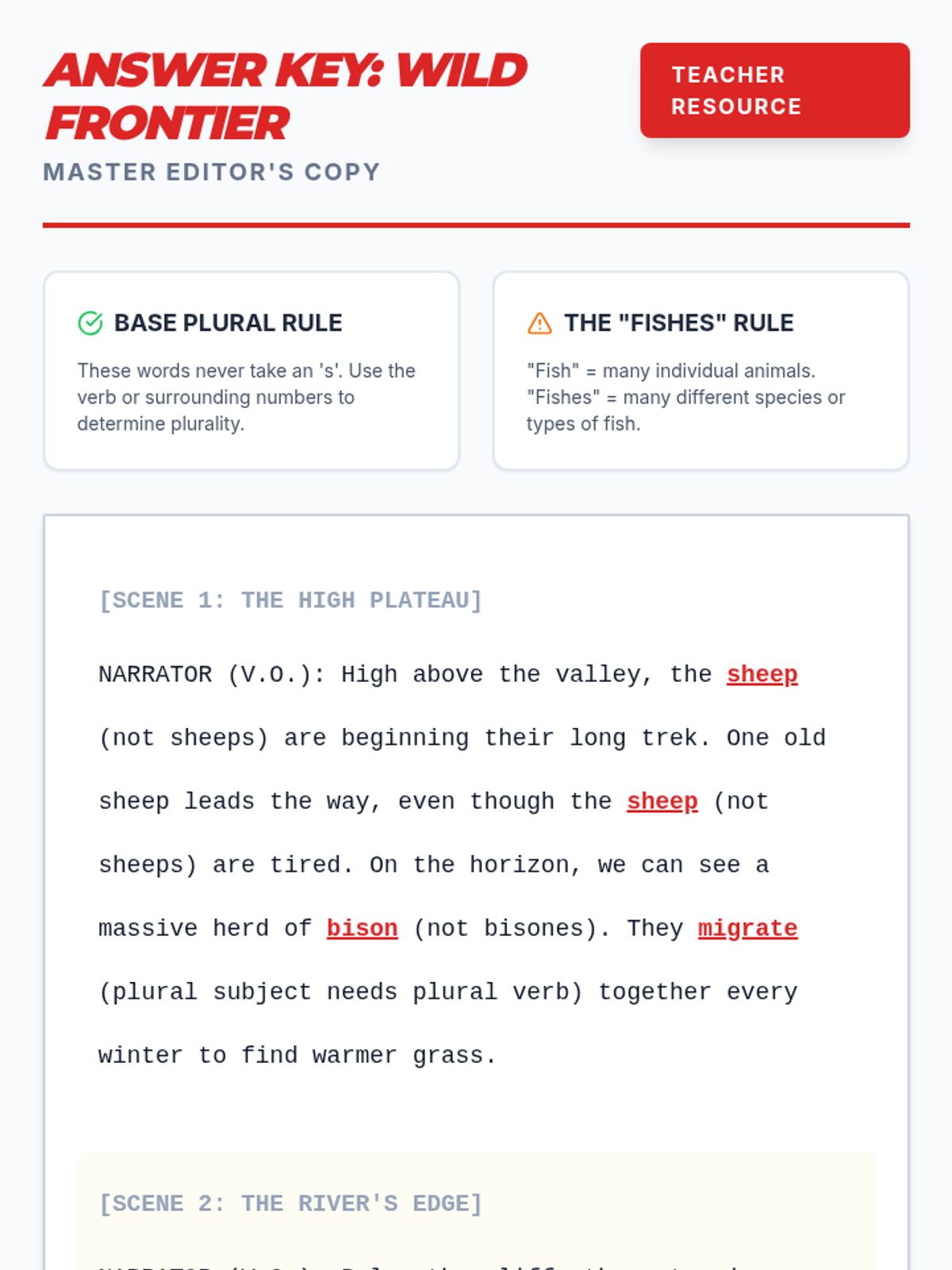 A 6th-grade grammar lesson focusing on irregular base plurals (sheep, bison, fish) and the specific scientific usage of 'fishes'. Students act as editors to correct a nature documentary script.