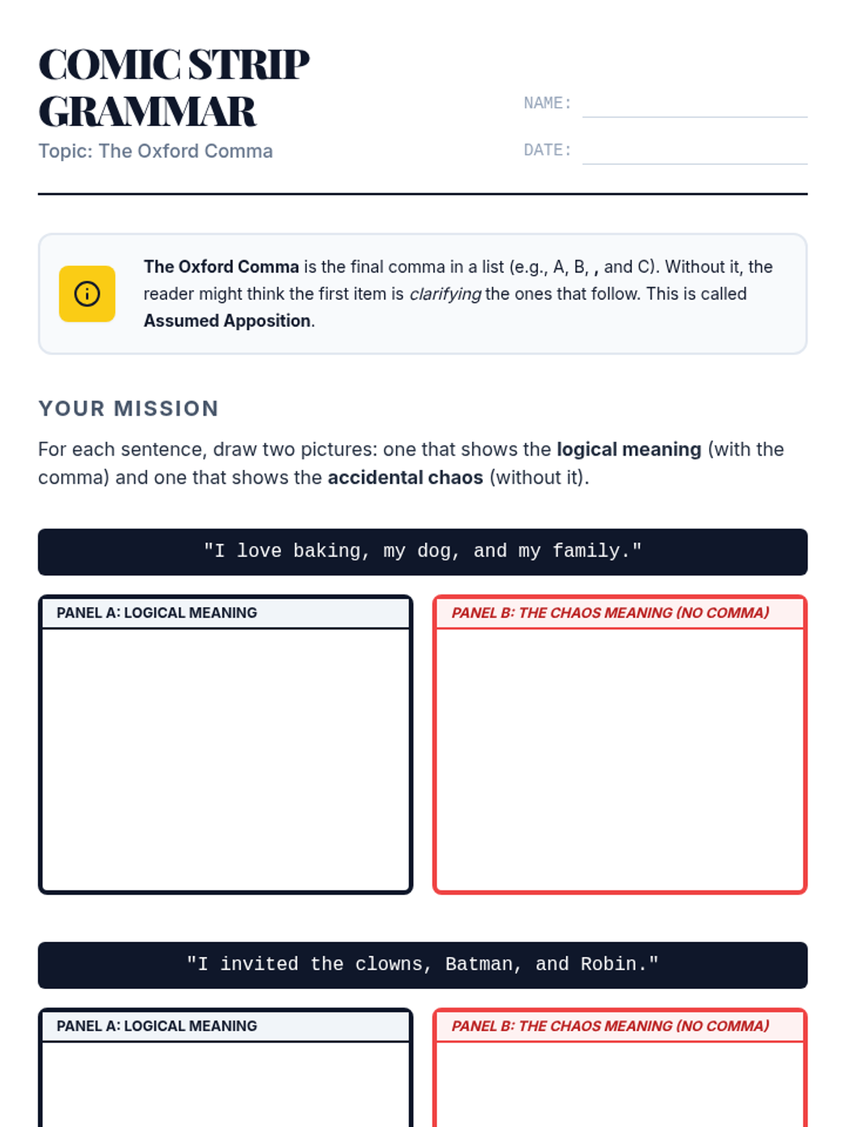 A punchy, interactive lesson for middle schoolers to master the Oxford comma. Students will analyze ambiguous sentences and create comic-style illustrations to see how one tiny comma can change everything from a family dinner to a parent's identity.