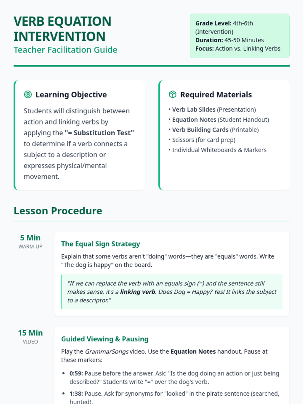 A specialized intervention lesson for 4th-6th graders struggling with the distinction between action and linking verbs, using the '=' substitution strategy.