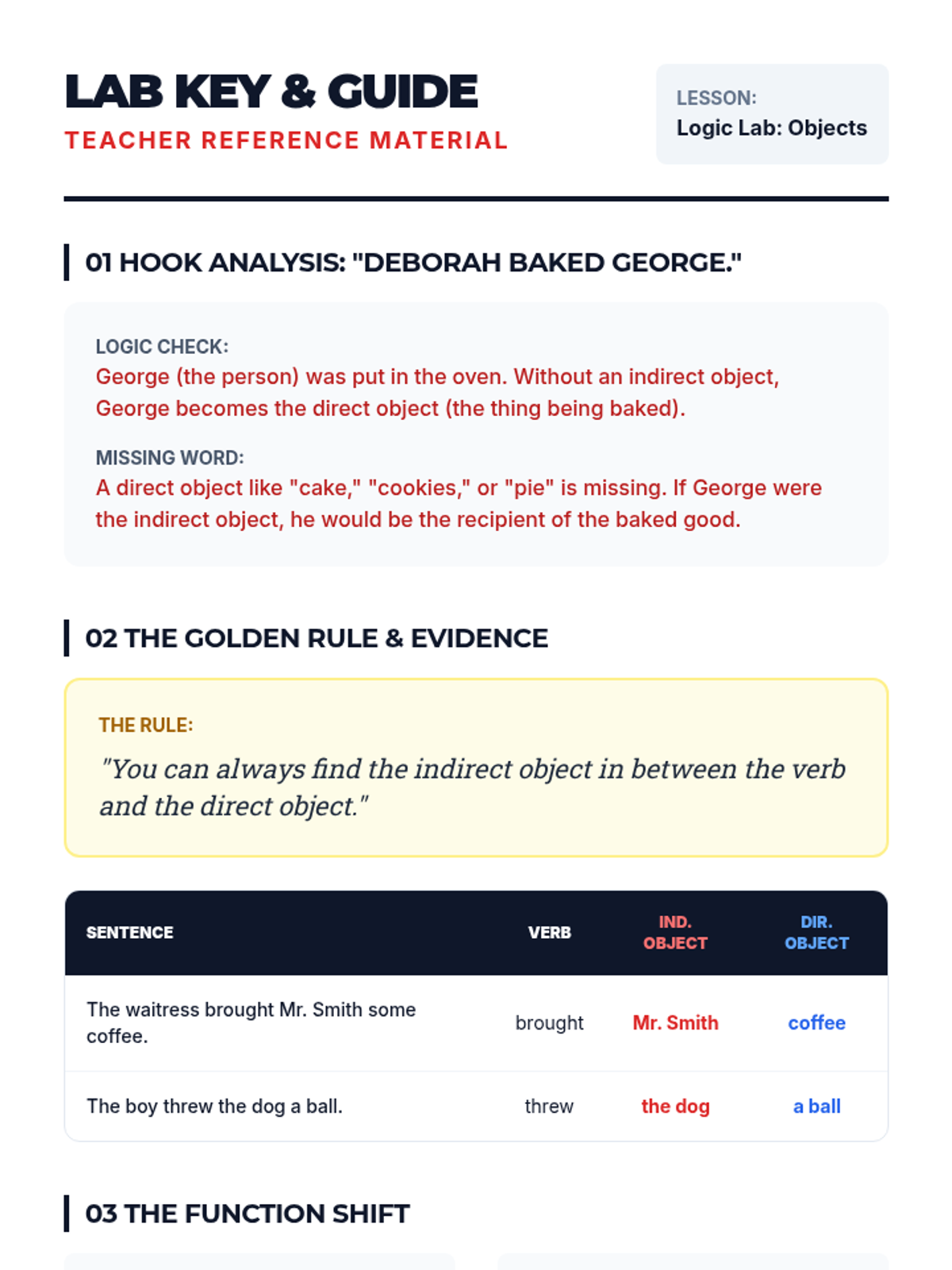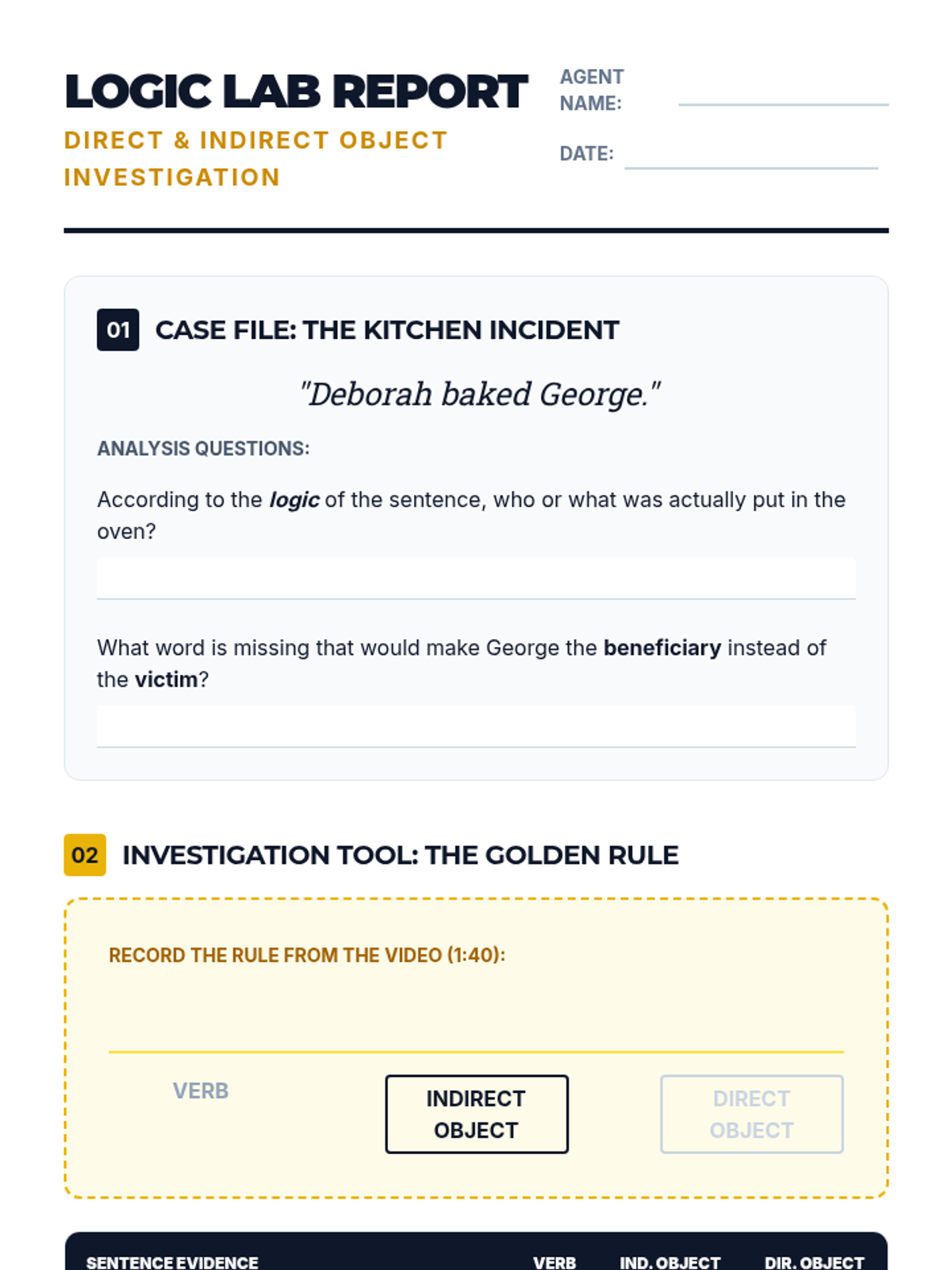 Students will use logic and the 'Golden Rule' of placement to distinguish between direct and indirect objects, investigating sentences where a lack of an indirect object leads to humorous or impossible scenarios.