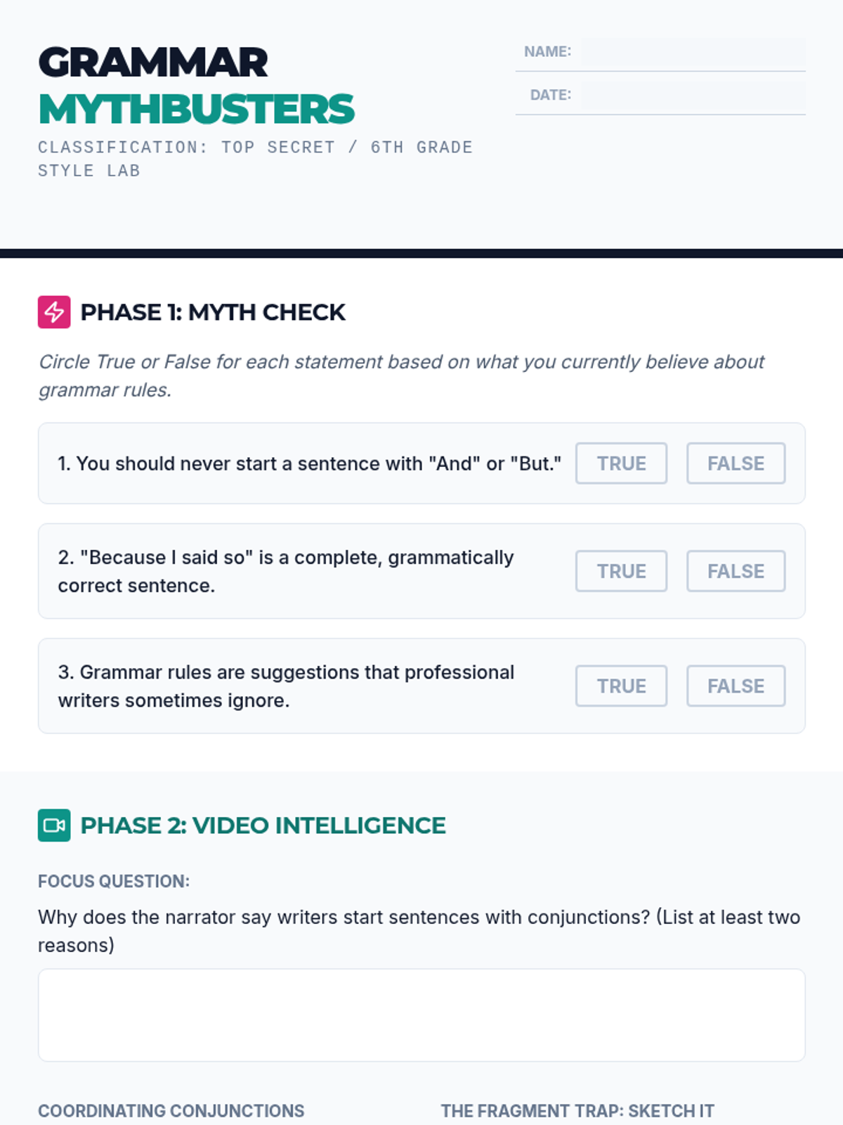 A 6th-grade lesson that debunks the common myth about starting sentences with conjunctions, focusing on using "But" and "And" for stylistic effect and dramatic tension.