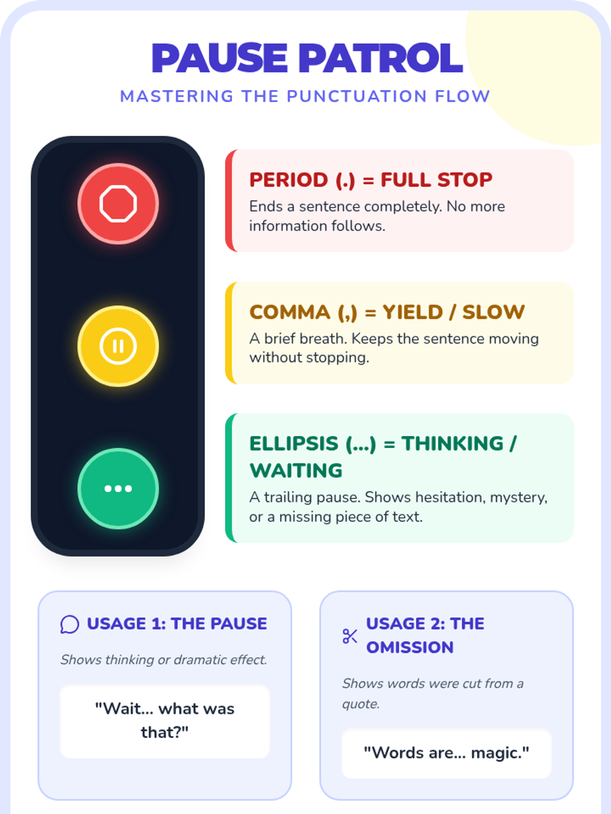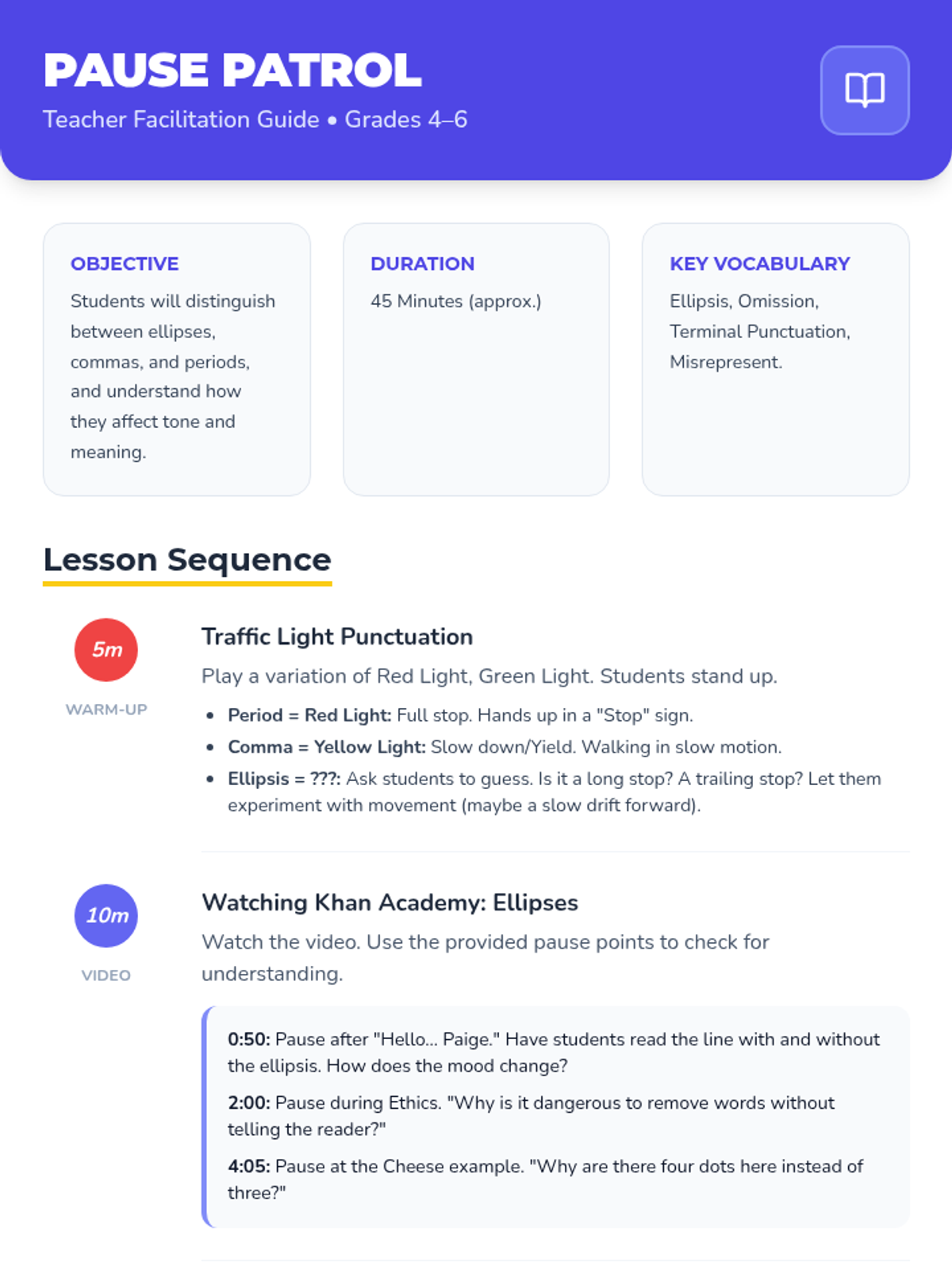 A punctuation lesson for grades 4-6 focusing on the differences between periods, commas, and ellipses using a traffic light analogy and a Khan Academy video. Students explore how punctuation changes the tone and 'voice' of a narrator through creative rewriting activities.