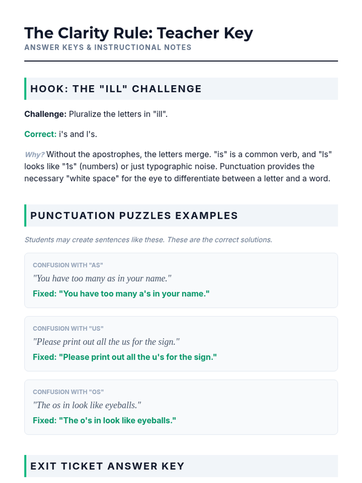 A lesson focusing on the nuanced and rare exceptions for apostrophe usage, specifically pluralizing lowercase letters, dates, and acronyms for clarity.