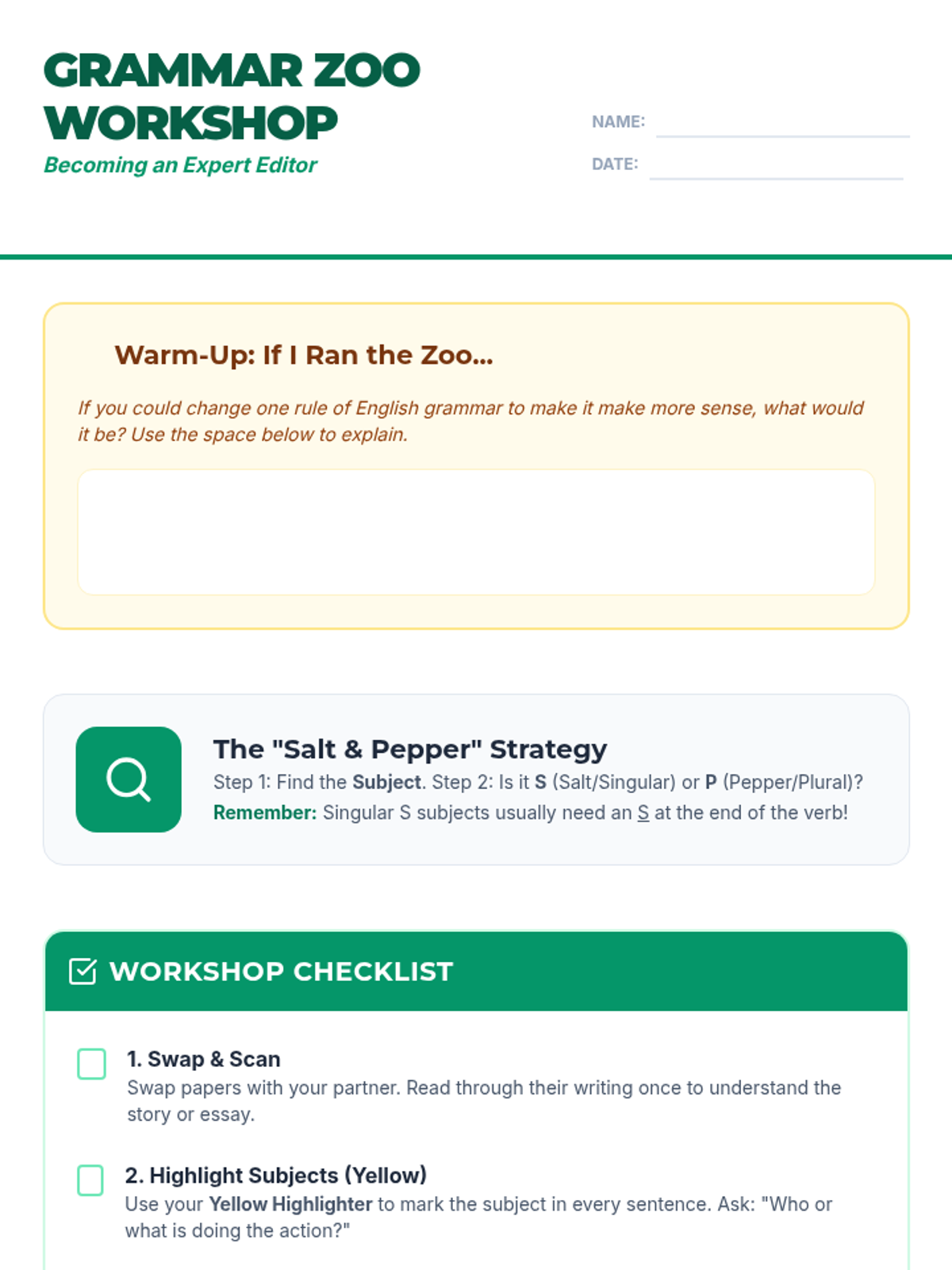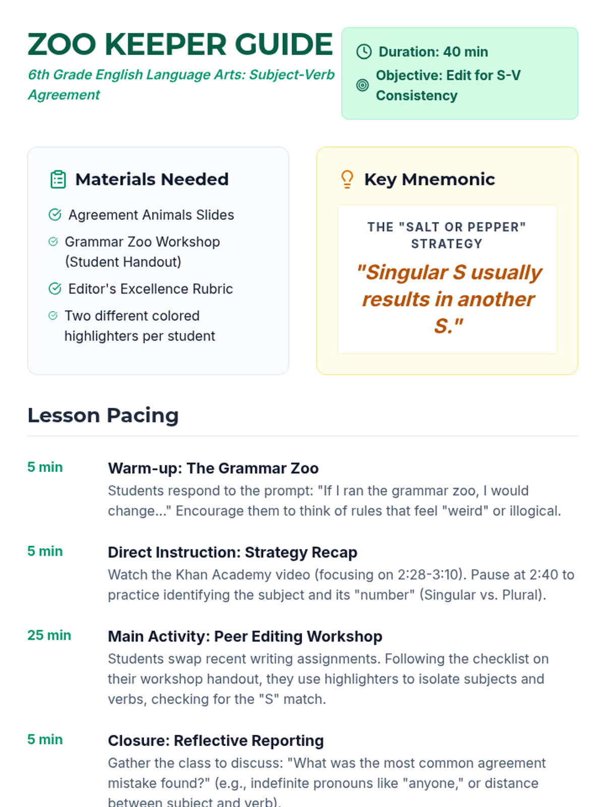 A 6th-grade grammar lesson focusing on subject-verb agreement using the 'Grammar Zoo' theme. Students learn a step-by-step strategy to identify and correct agreement errors in their own writing through a peer editing workshop.