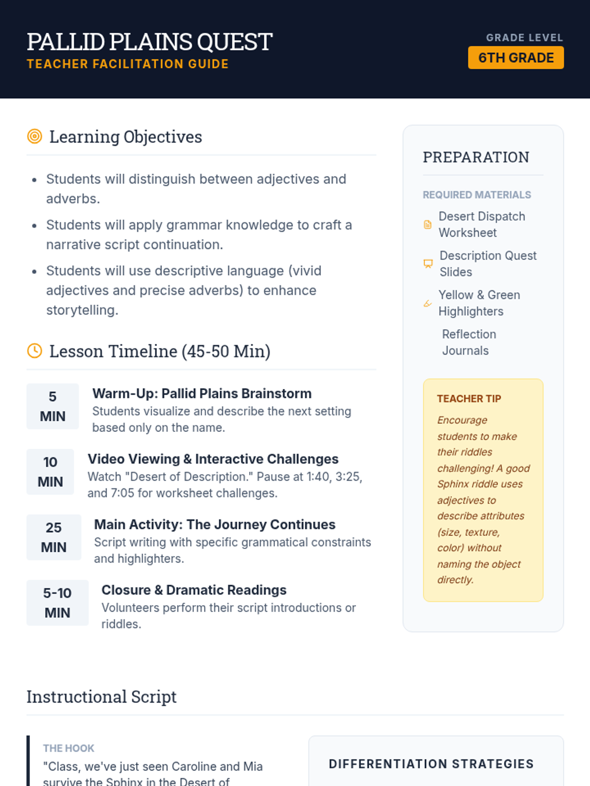 A 6th-grade creative writing and grammar lesson where students watch a video about adjectives and adverbs, then write a narrative script continuation featuring a new Sphinx riddle in the 'Pallid Plains.'
