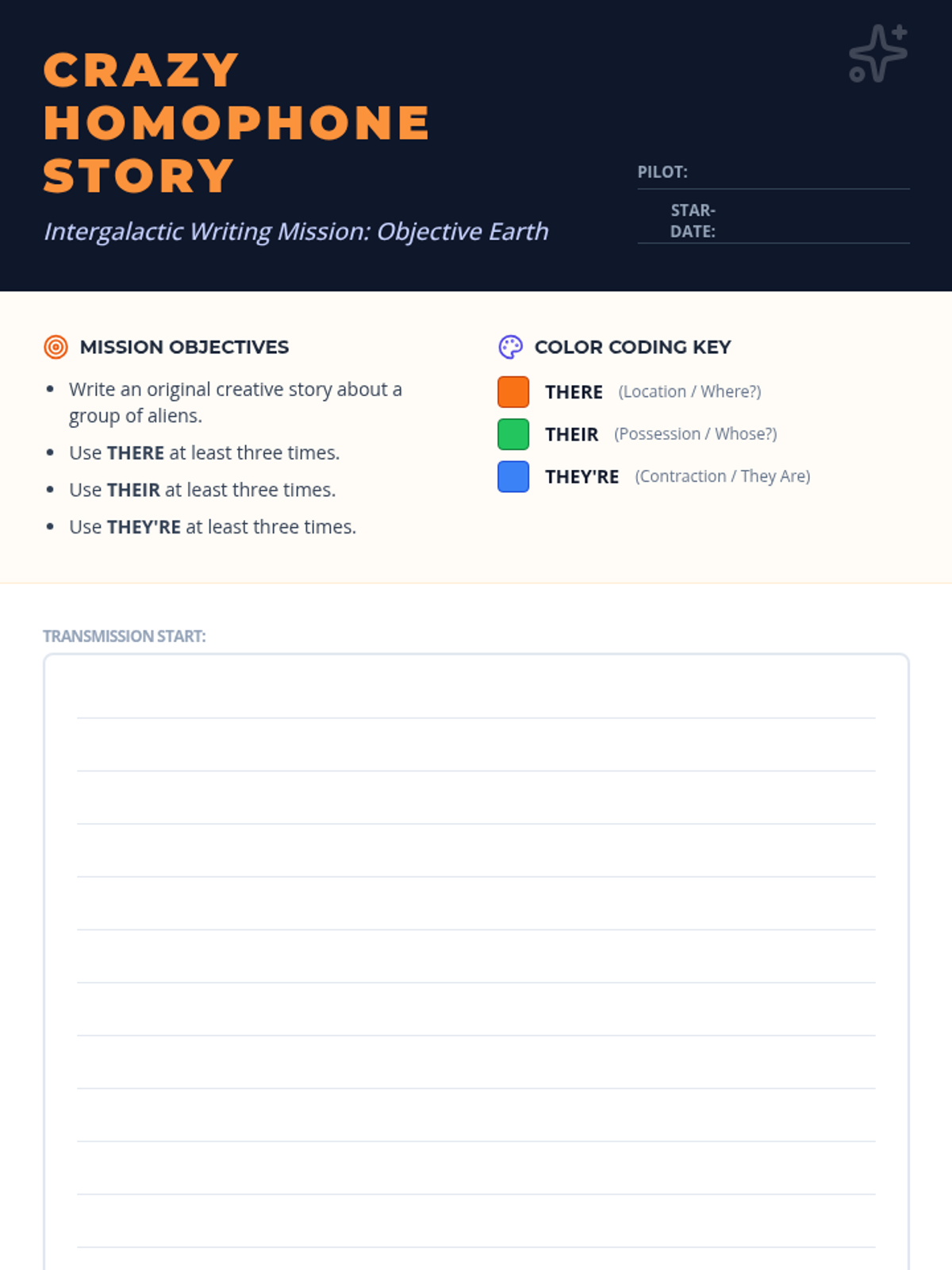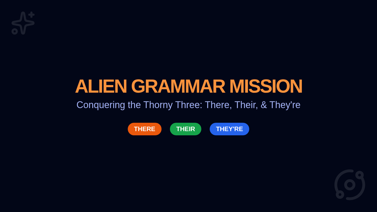 A 6th-grade grammar lesson focusing on the homophones there, their, and they're through an alien-themed creative writing mission. Students use visual tricks and color-coded strategies to master one of English's thorniest usage issues.