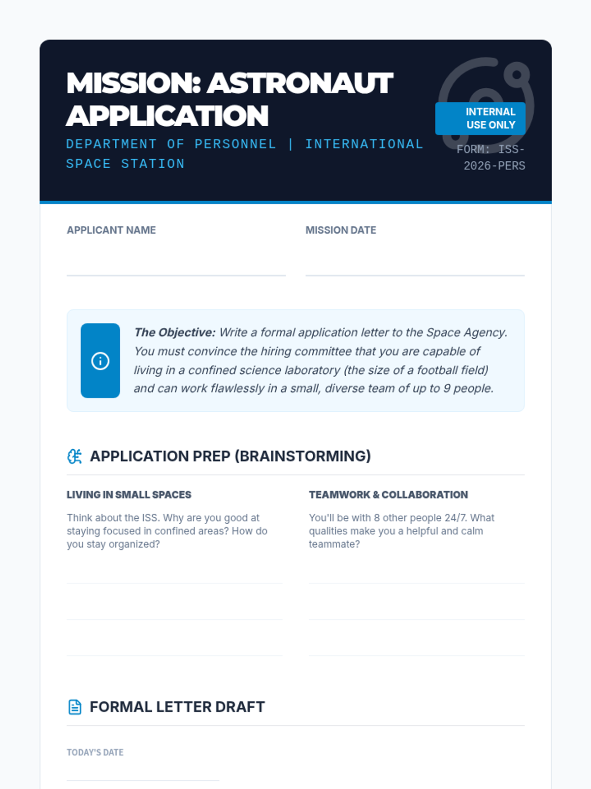 Students will learn about life on the International Space Station and write a persuasive formal application to become an astronaut, focusing on their ability to work in teams and adapt to confined spaces.