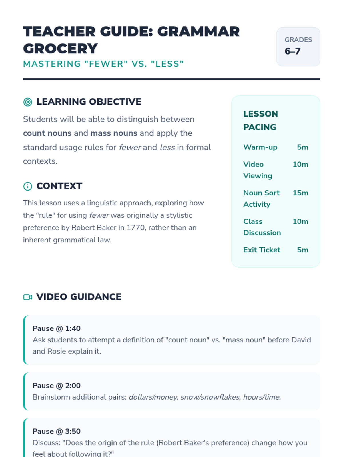 A middle school grammar lesson focusing on the distinction between count and mass nouns to master the usage of 'fewer' and 'less' using a linguistic and historical perspective.