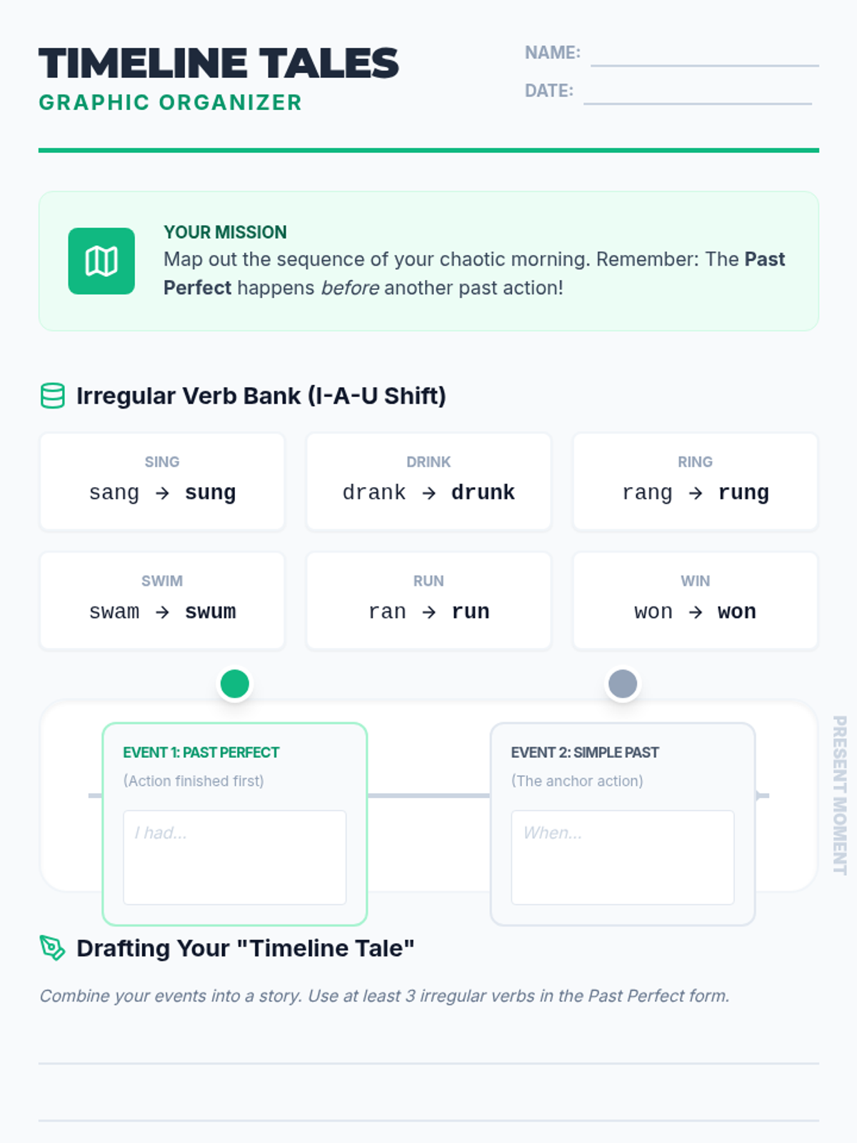 A grammar lesson for middle schoolers exploring how irregular verbs change vowel sounds as they move from present to past perfect tense. Students use a 'Timeline Tales' approach to practice sequence and tense consistency.