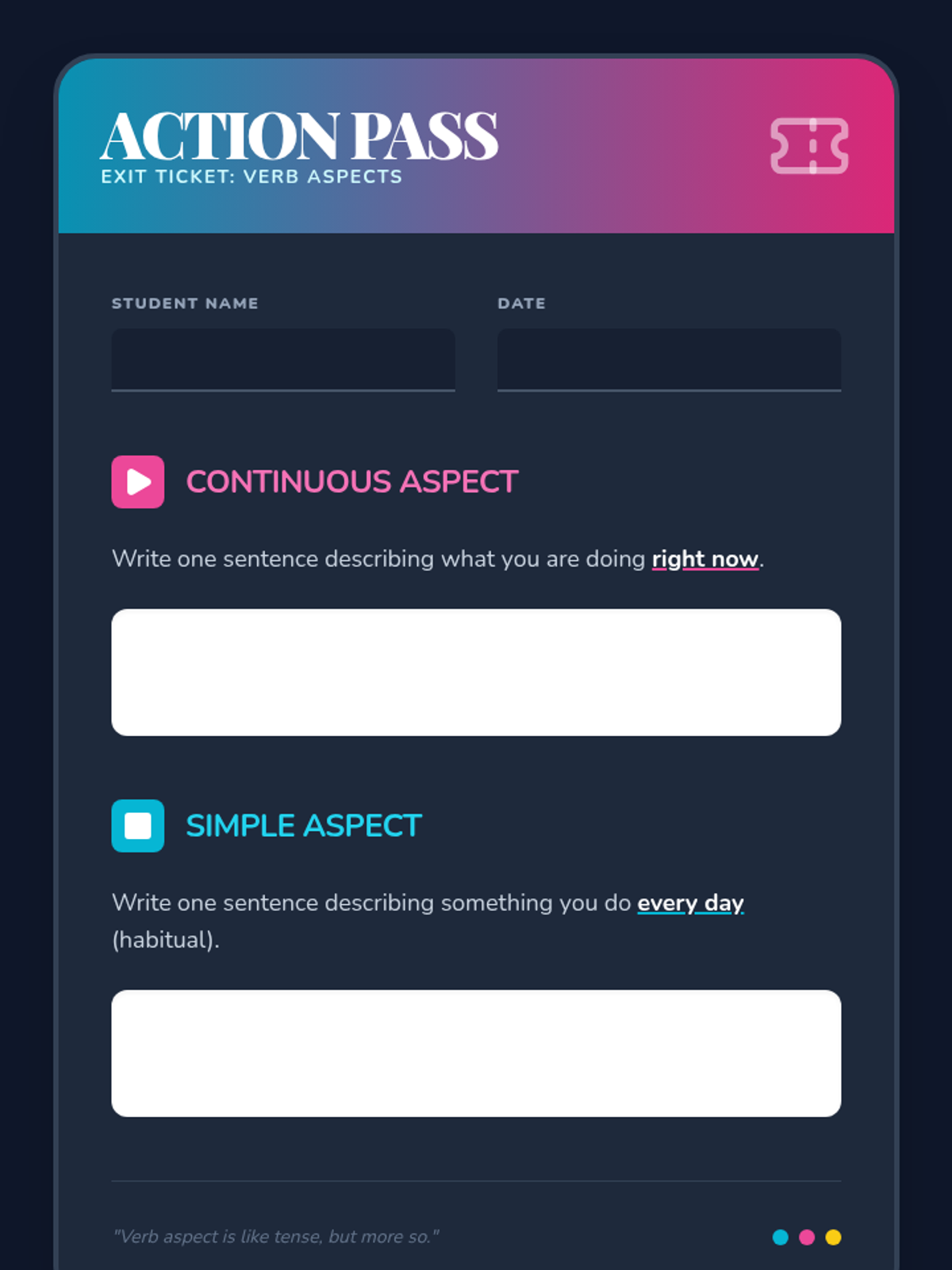 Students explore the difference between simple and continuous verb aspects through physical movement, video analysis, and a high-energy charades activity. The lesson culminates in a reflective exit ticket connecting these grammar concepts to their daily lives.