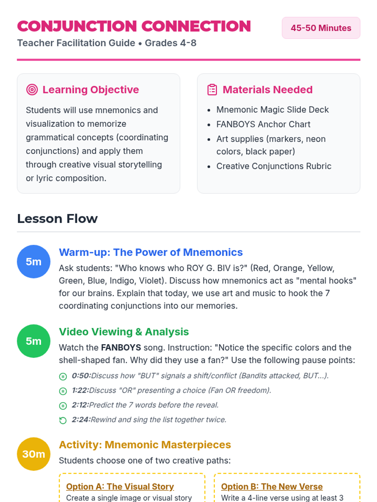 A creative arts and grammar lesson for grades 4-8 where students use the 'FANBOYS' mnemonic song from Khan Academy to learn coordinating conjunctions through visual storytelling and songwriting.