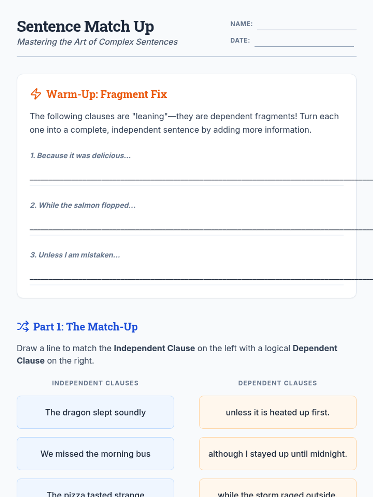 Students will learn to distinguish between independent and dependent clauses and combine them using subordinating conjunctions to create complex sentences with proper punctuation.